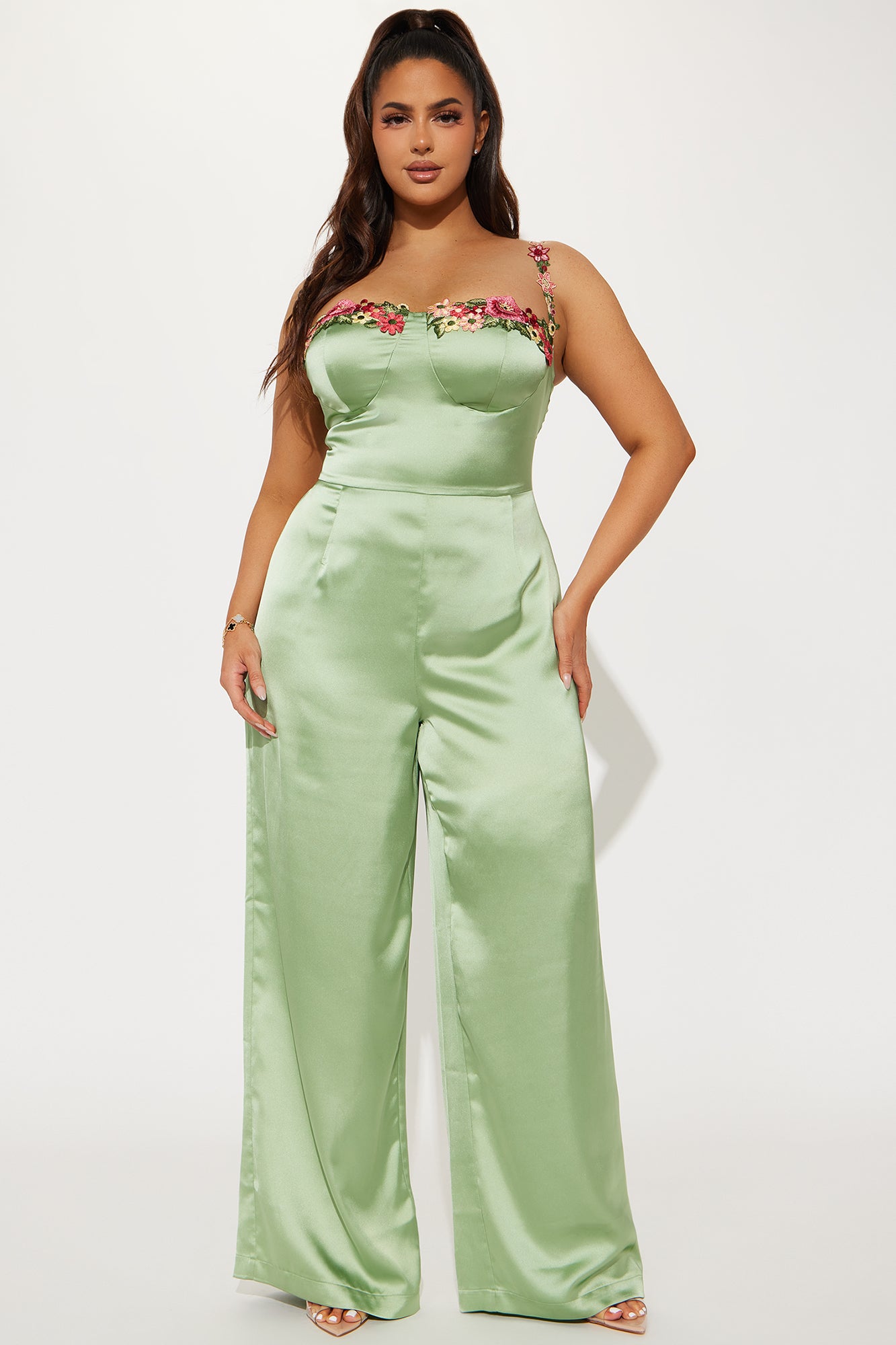 Available In Sage And White. Crochet Applique Jumpsuit Adjustable Spaghetti Strap Sweetheart Neckline Padded Hidden Back Zipper Wide Leg Non Stretch Shell: 96% Polyester 4% Spandex Imported |