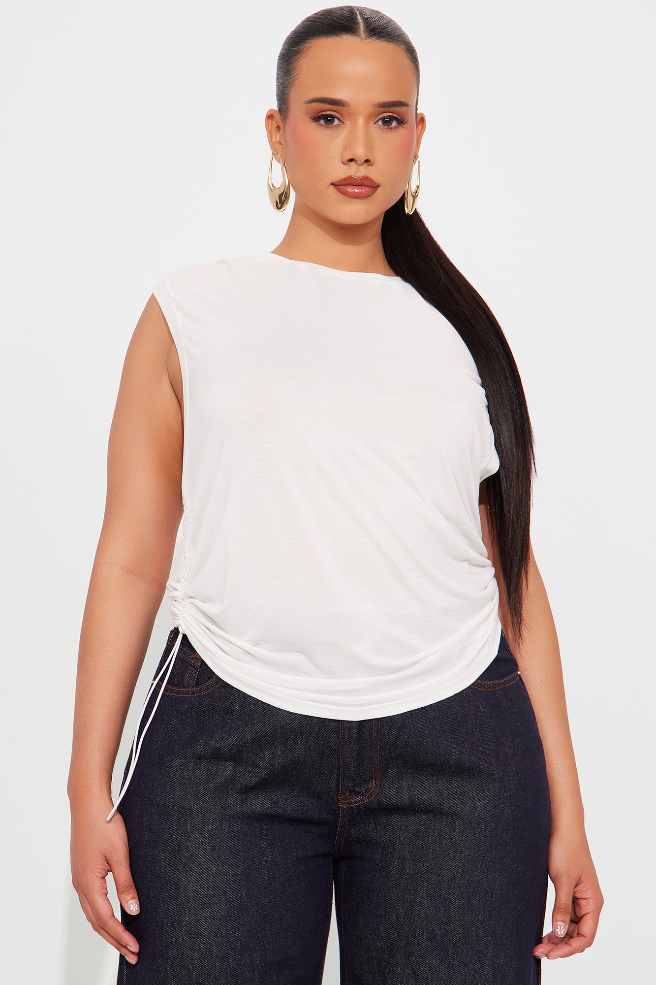 Available In Black, White, Heather Grey, And Midnight Blue. Active Top Crew Neck Sleeveless Cotton Blend Low Impact Ruched Detail Adjustable Toggle Stretch 92% Polyester 8% Spandex Imported |