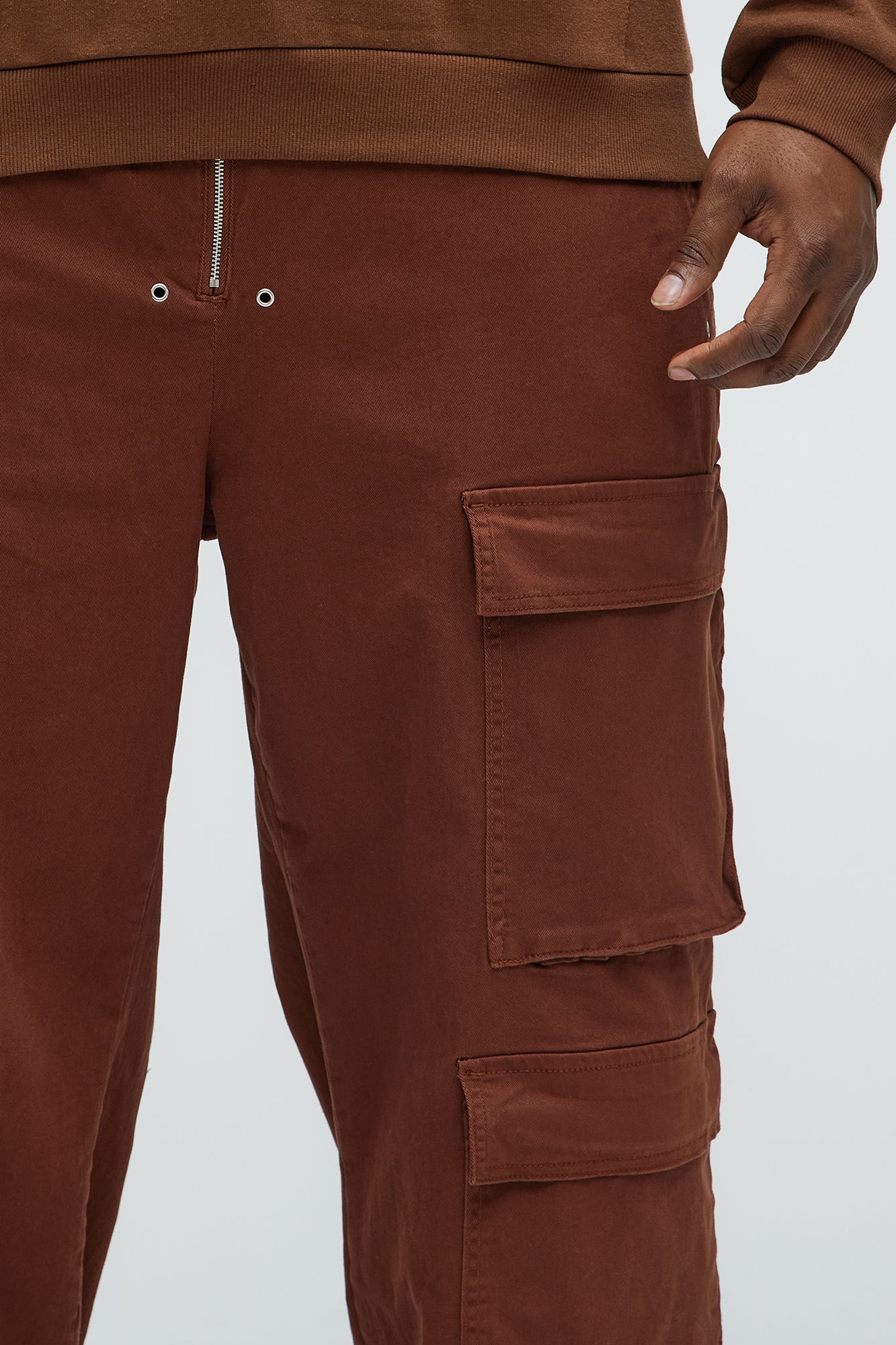 Available In Brown. Elastic Waist Drawstring Front Zipper Closure Side Pockets Back Pockets Cargo Pockets 98% Cotton, 2% Spandex Imported |