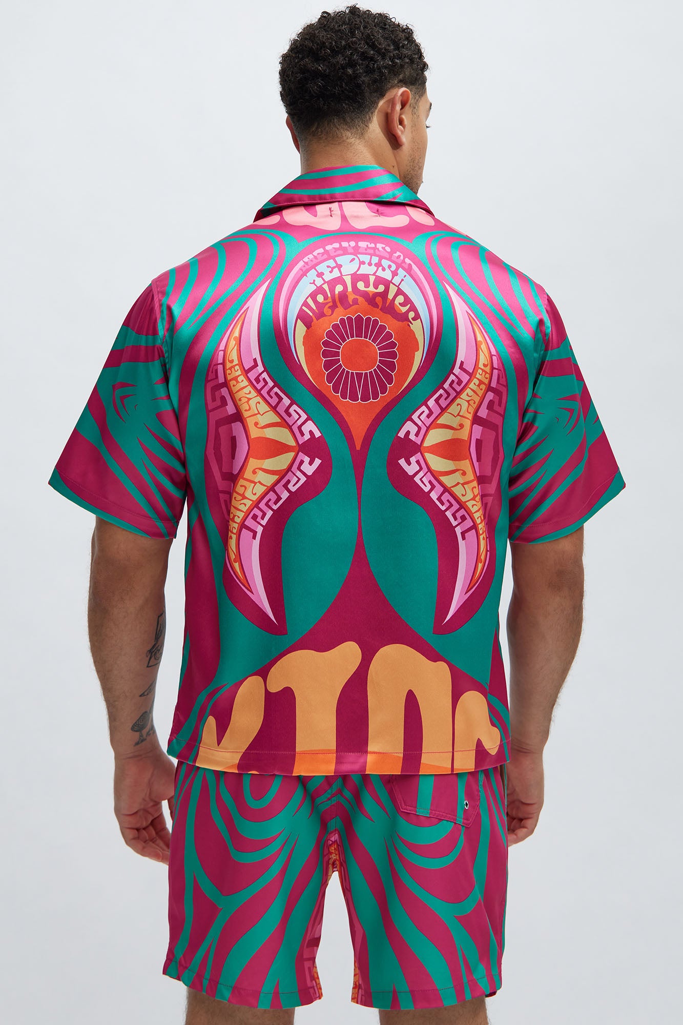 Available In Fuchsia/combo. Fold Down Collar Front Button Closure Short Sleeve Bottom Side Slit Pair With "Eyes On Medusa Swim Trunks" Disclaimer: Pattern Placement May Vary. Shell: 98% Polyester 2% Spandex Imported |