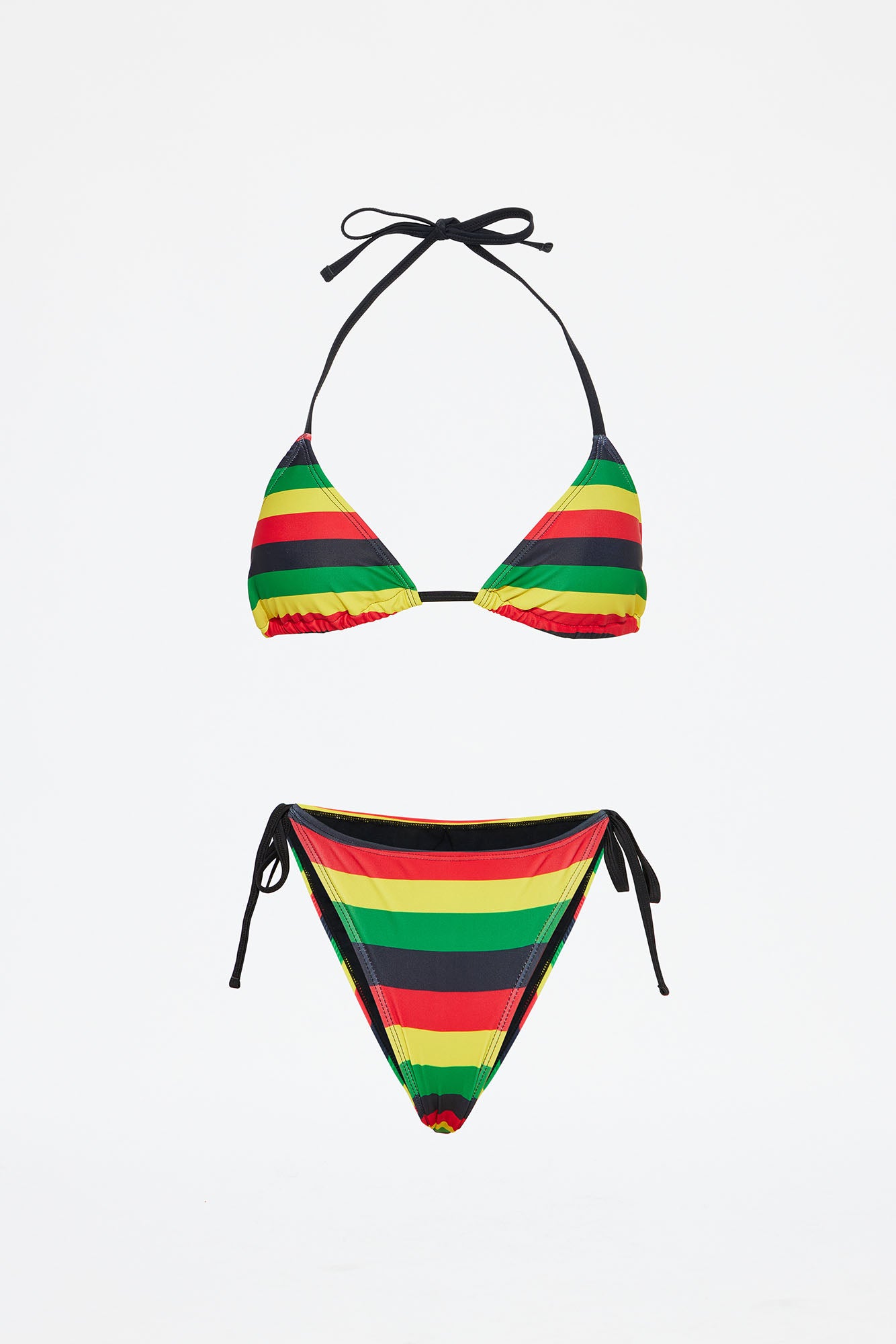Available In Green/combo. 2 Piece Bikini Triangle Bikini Top Adjustable Tunneled Straps Side Tie Bikini Bottom Full Stretch Final Sale Disclaimer: Stripe Pattern May Vary. Shell: 85% Polyester 15% Spandex Lining: 100% Polyester Imported |