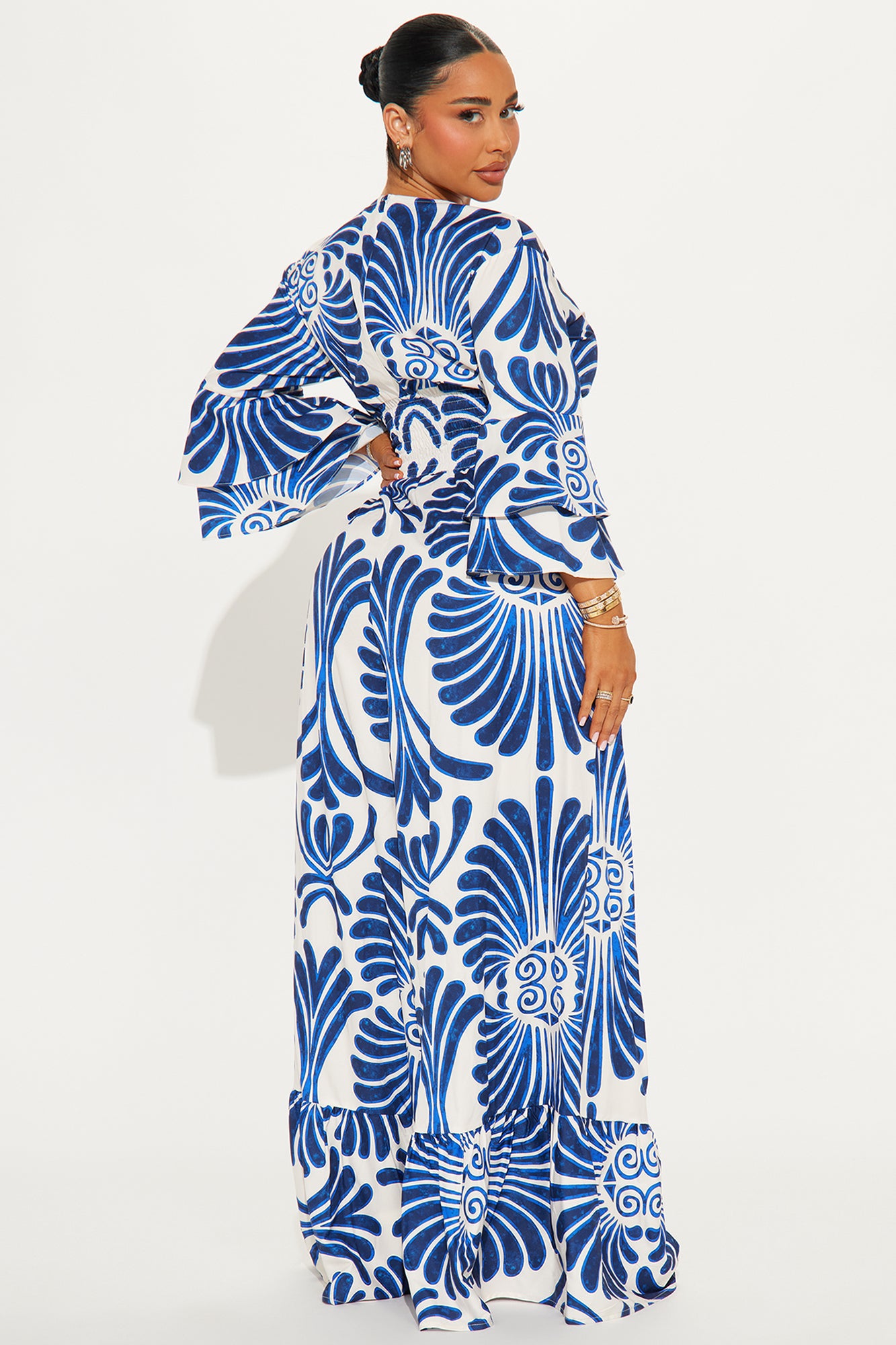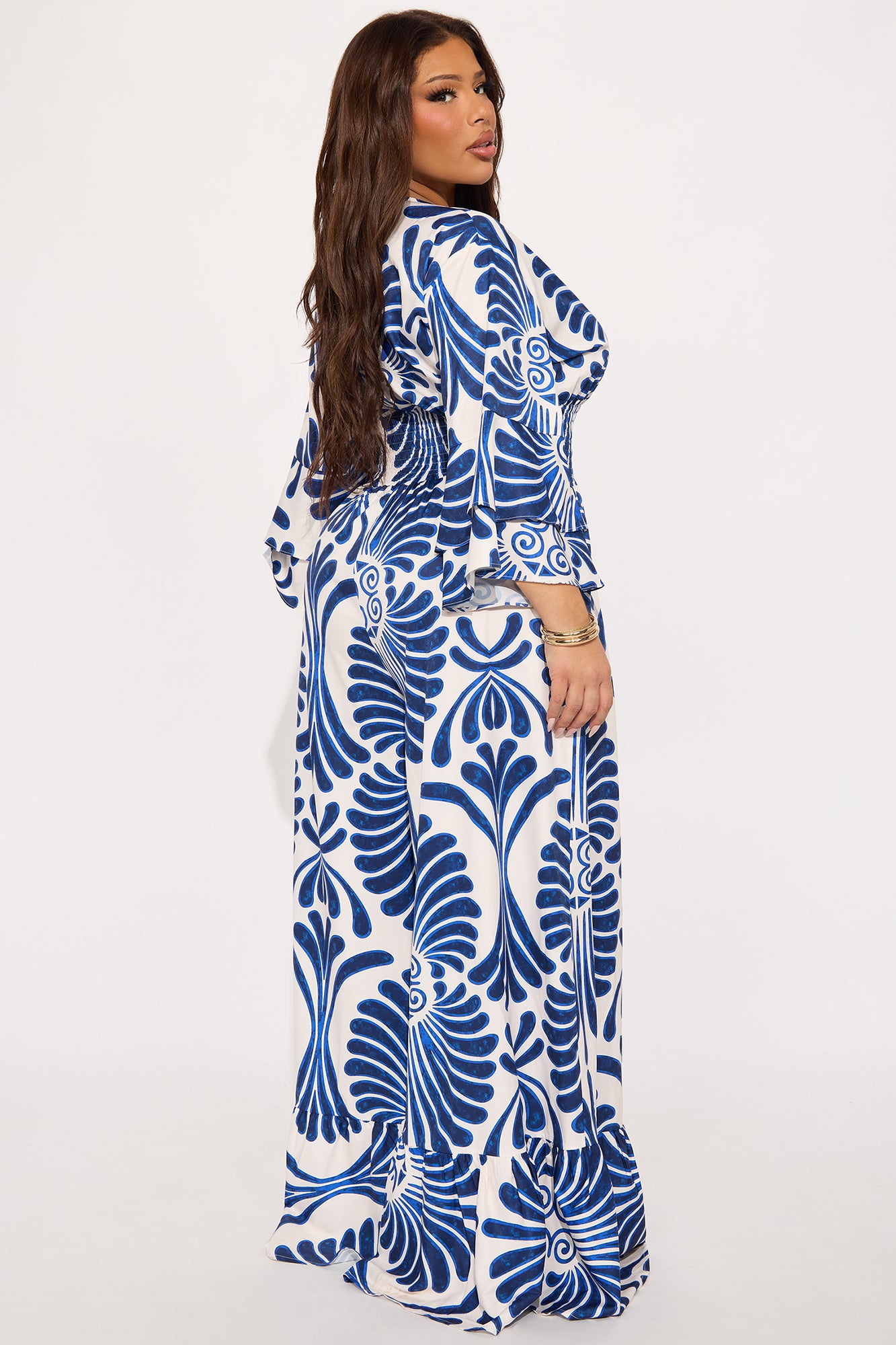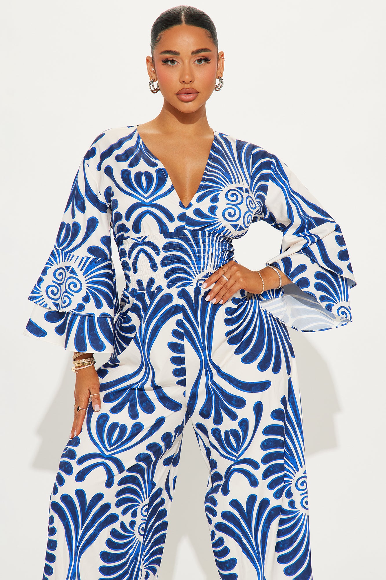 Available In Blue/combo And Black/combo. Jumpsuit 3/4 Sleeve Smocked Waist Hidden Back Zipper Wide Leg Non Stretch Inseam = 33" 35% Cotton, 65% Polyester Imported |