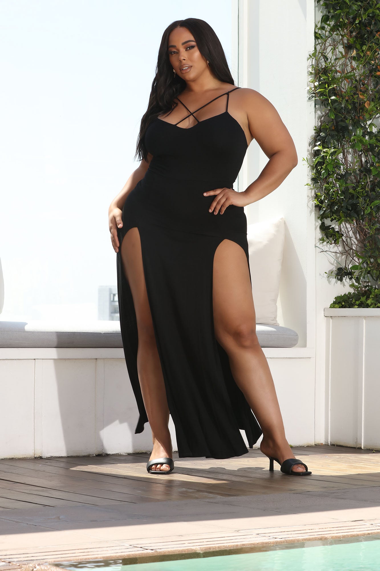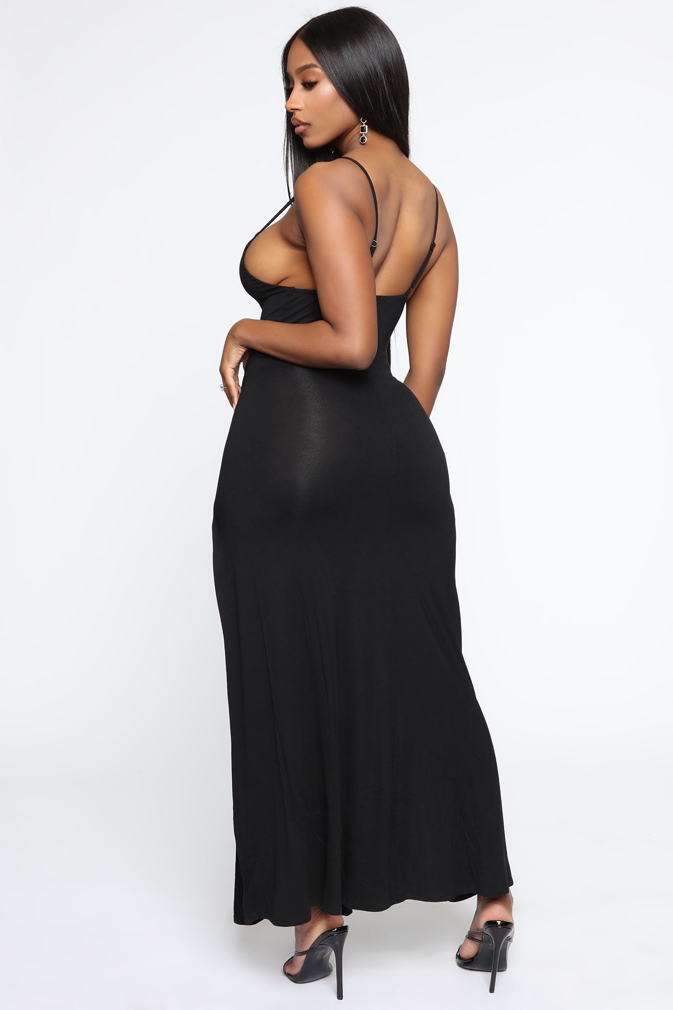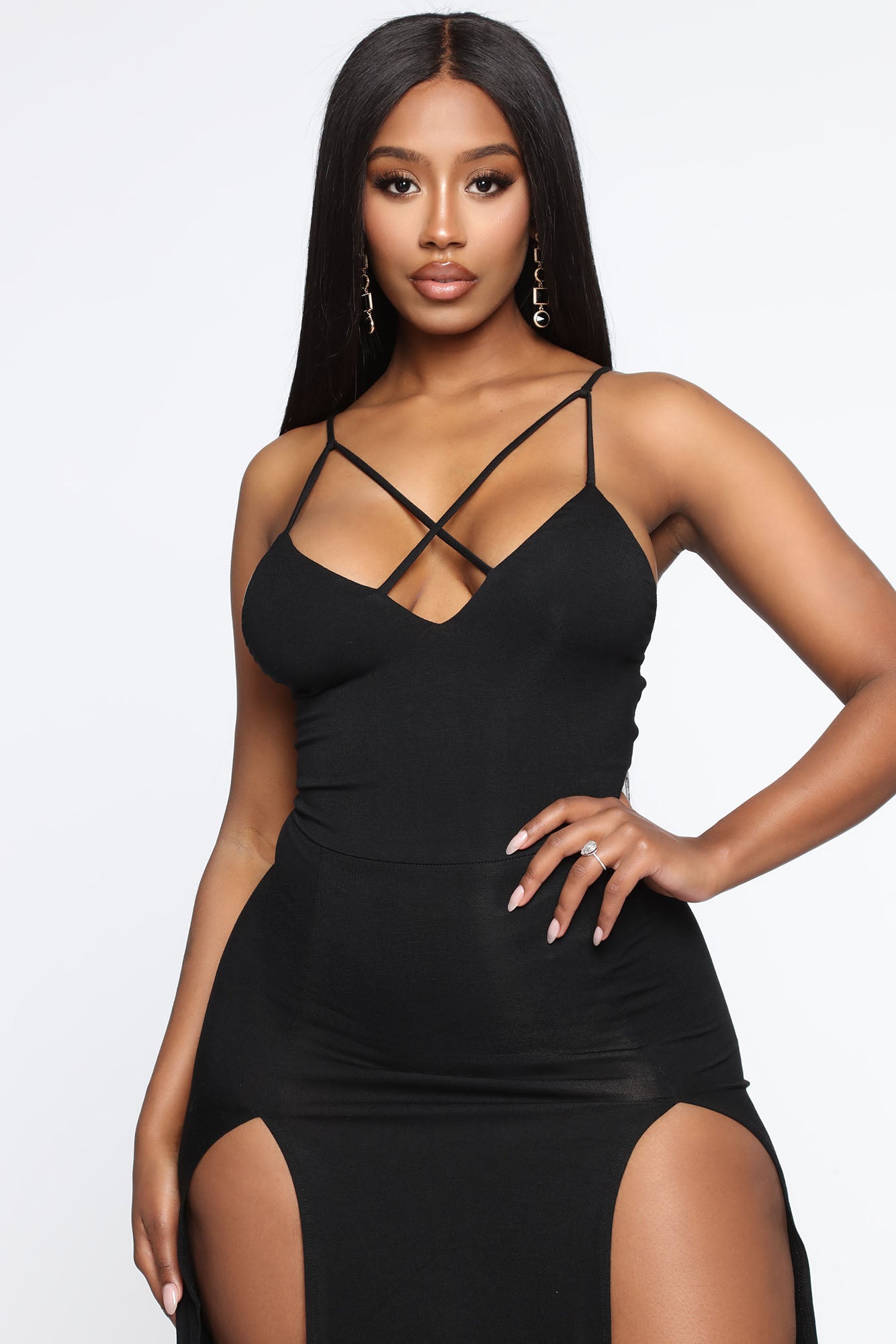 Available In Black And Red. Maxi Dress Slit Front Bodysuit Under Adjustable Straps Strappy Detail Final Sale 95% Rayon 5% Spandex Imported |