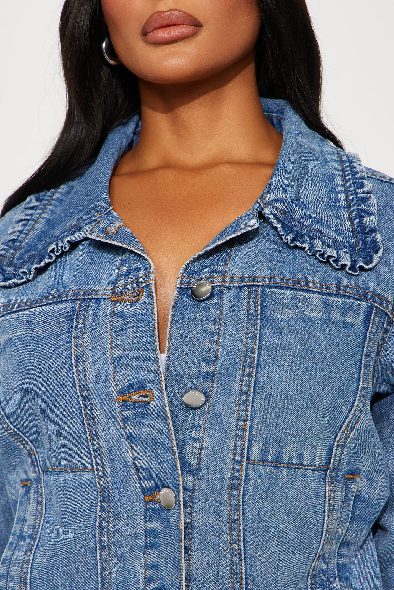 Available In Medium Wash. Denim Trucker Jacket Ruffle Collar Detail Button Front Chest Pockets Long Sleeve Non Stretch Disclaimer: Due To The Specialized Wash Process, Each Garment Is Unique. 60% Cotton 40% Polyester Imported |