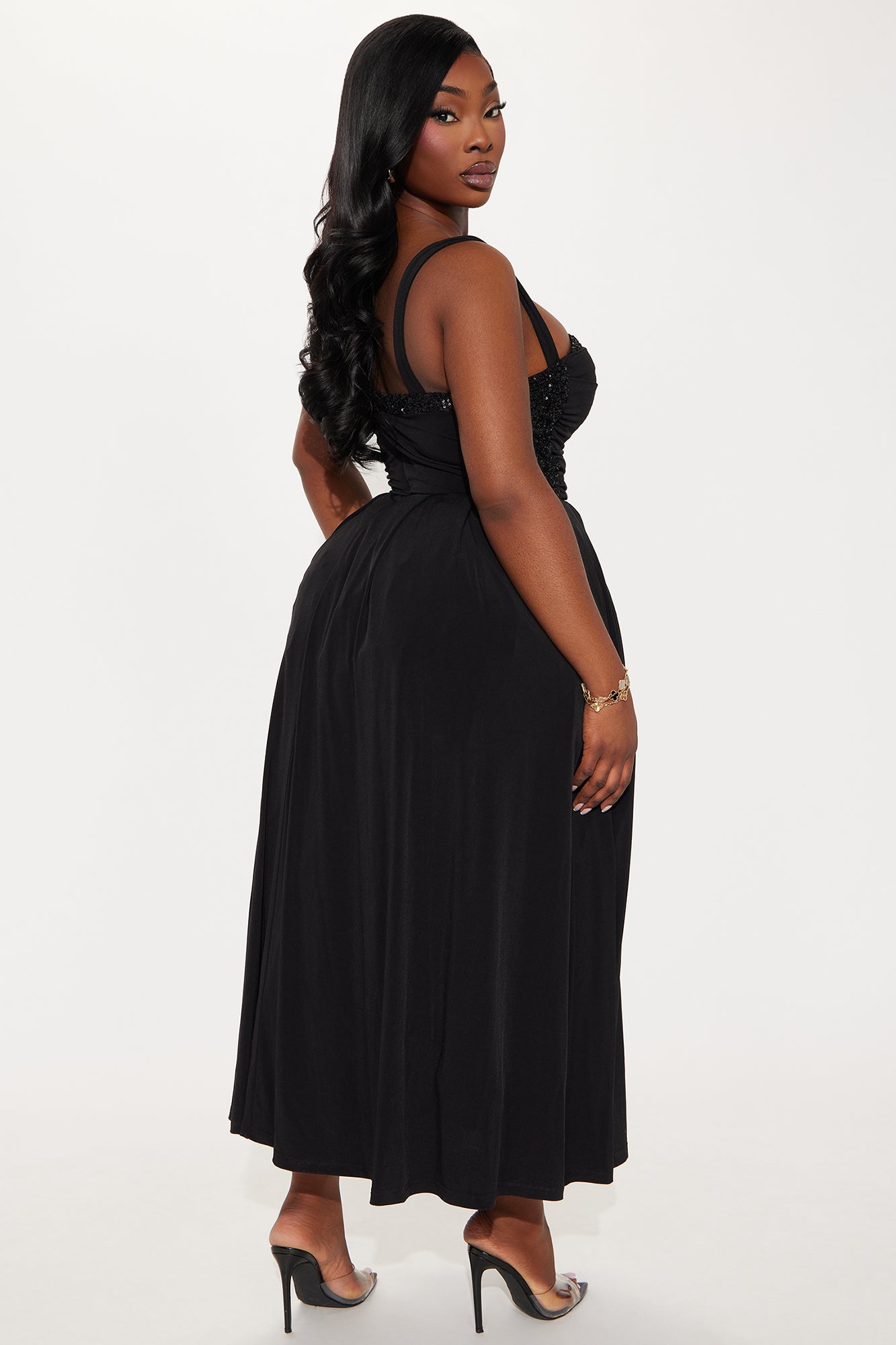 Available In Black. Sequin Midi Dress Sweetheart neckline Sleeveless Sequin embellished Ruched Back zipper Lined Stretch Length measured flat = 45" Self: 92% Polyester 8% Spandex Contrast: 100% Polyester Lining1 & 2: 100% Polyester Imported |