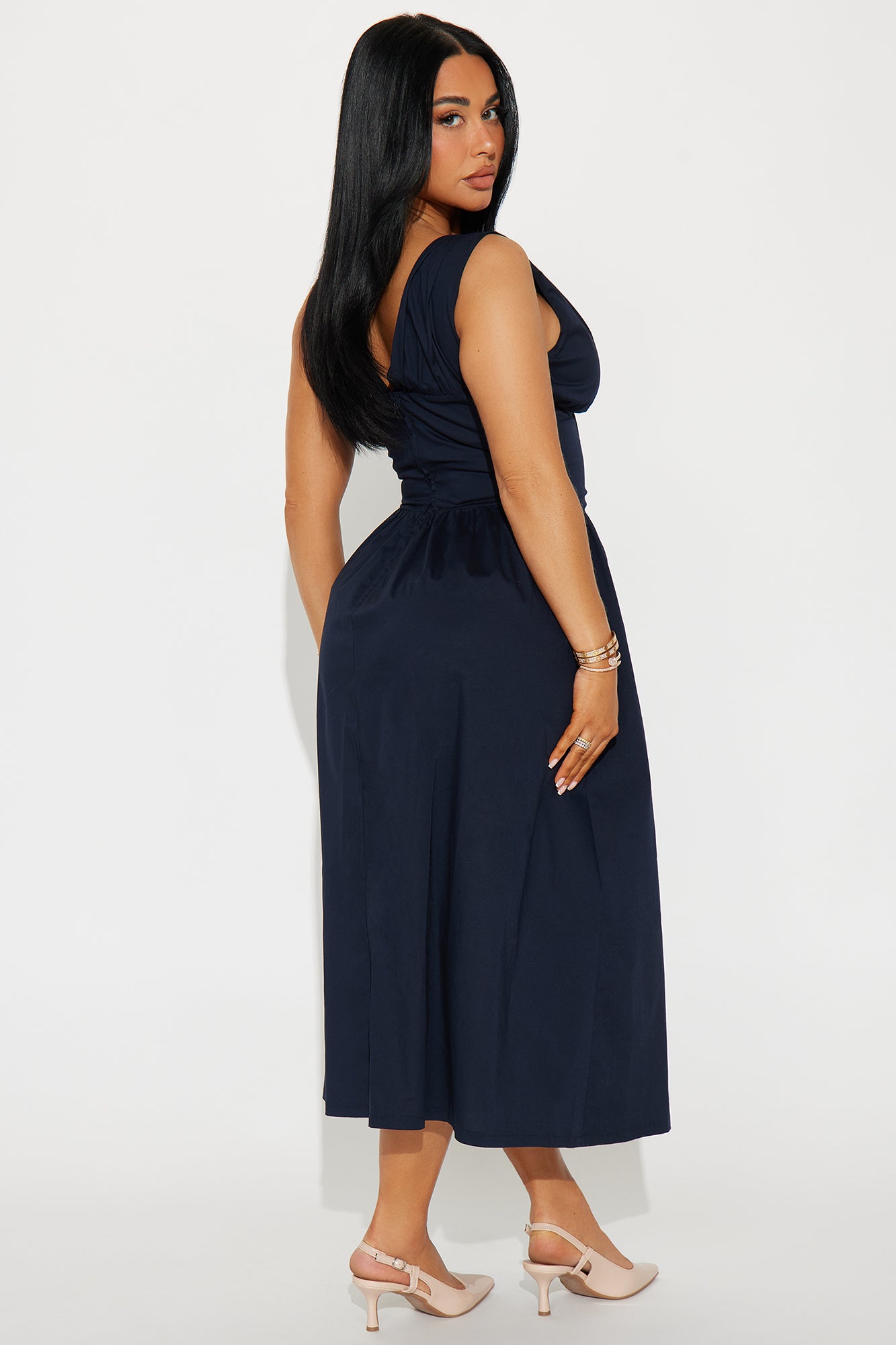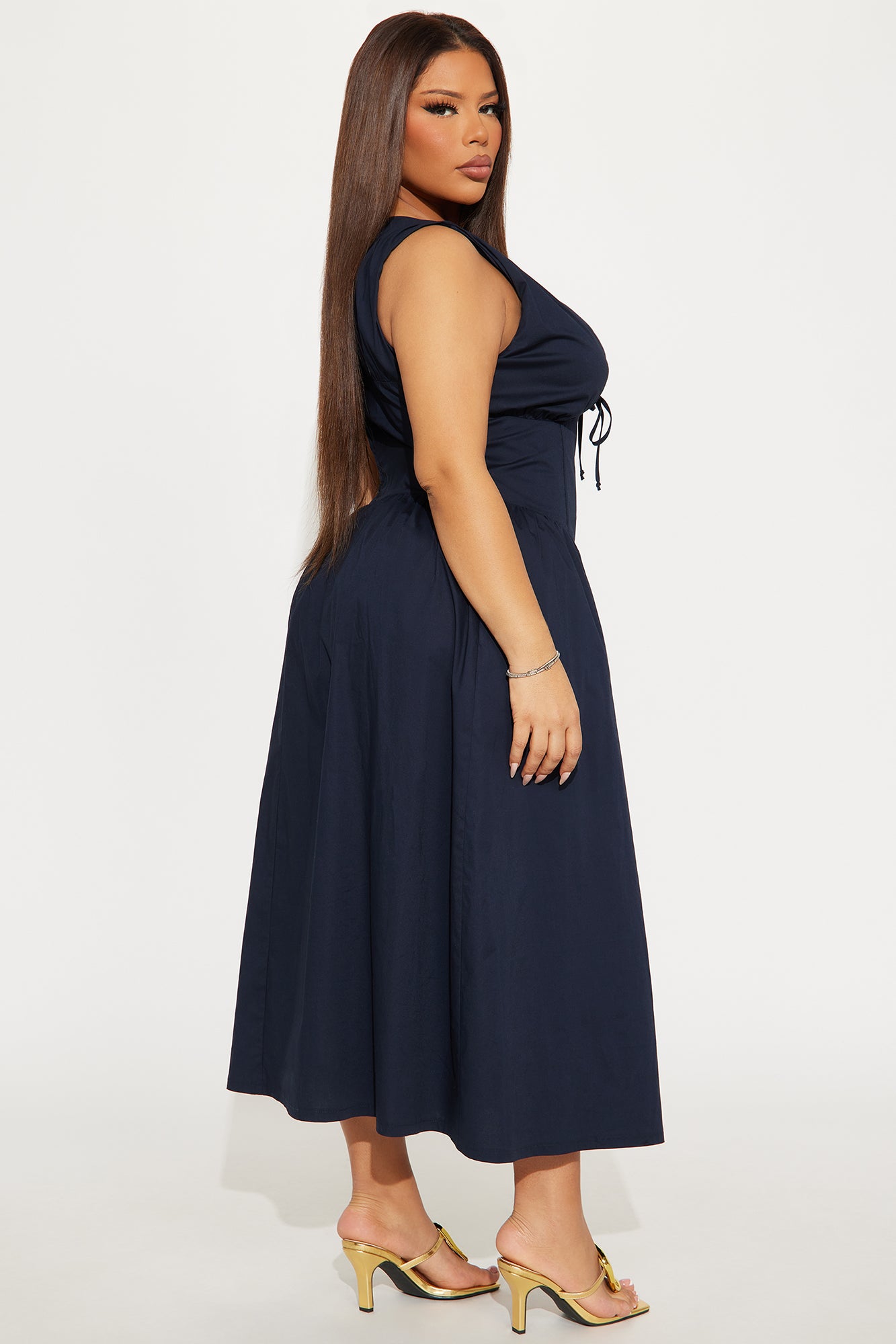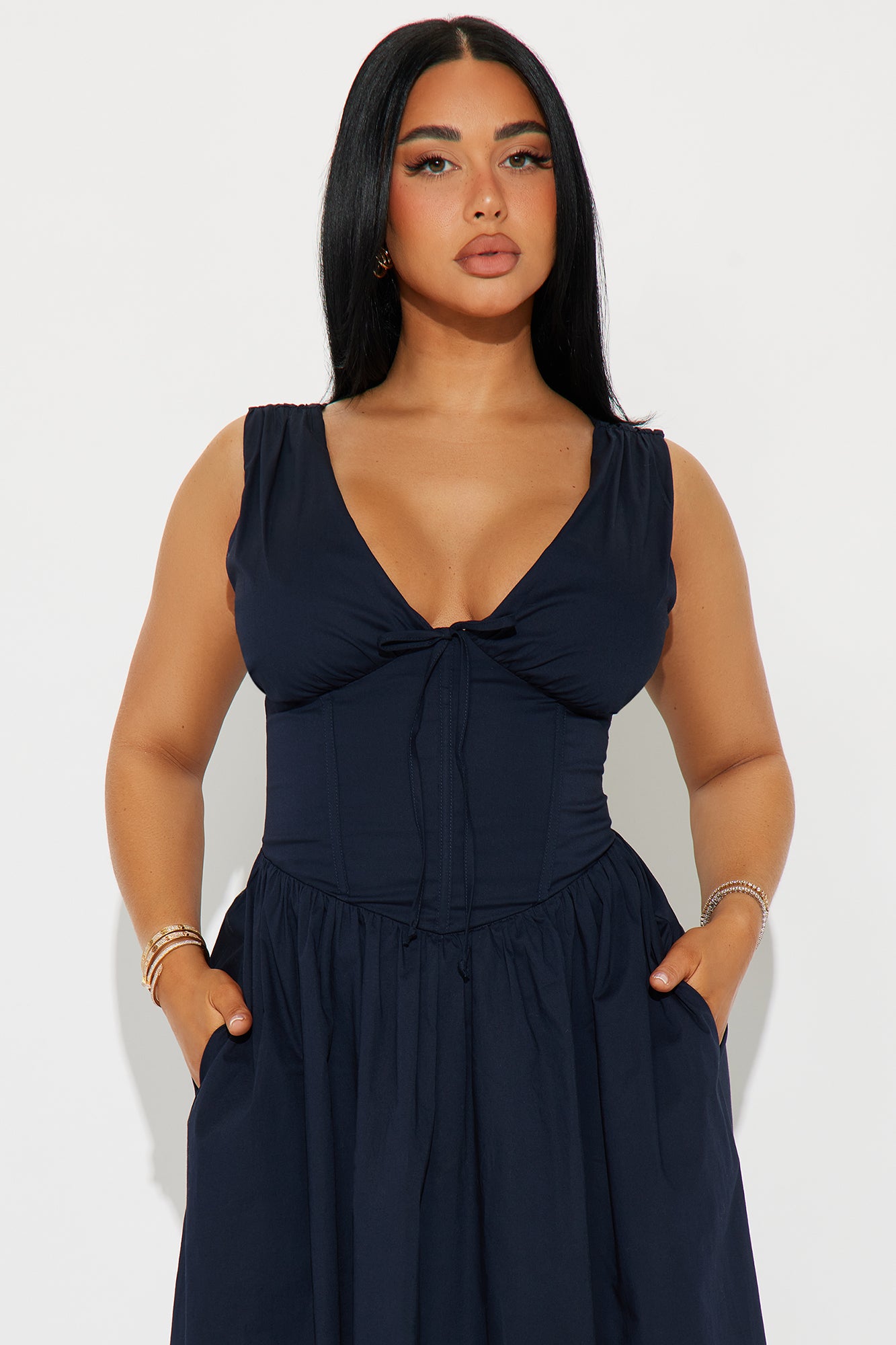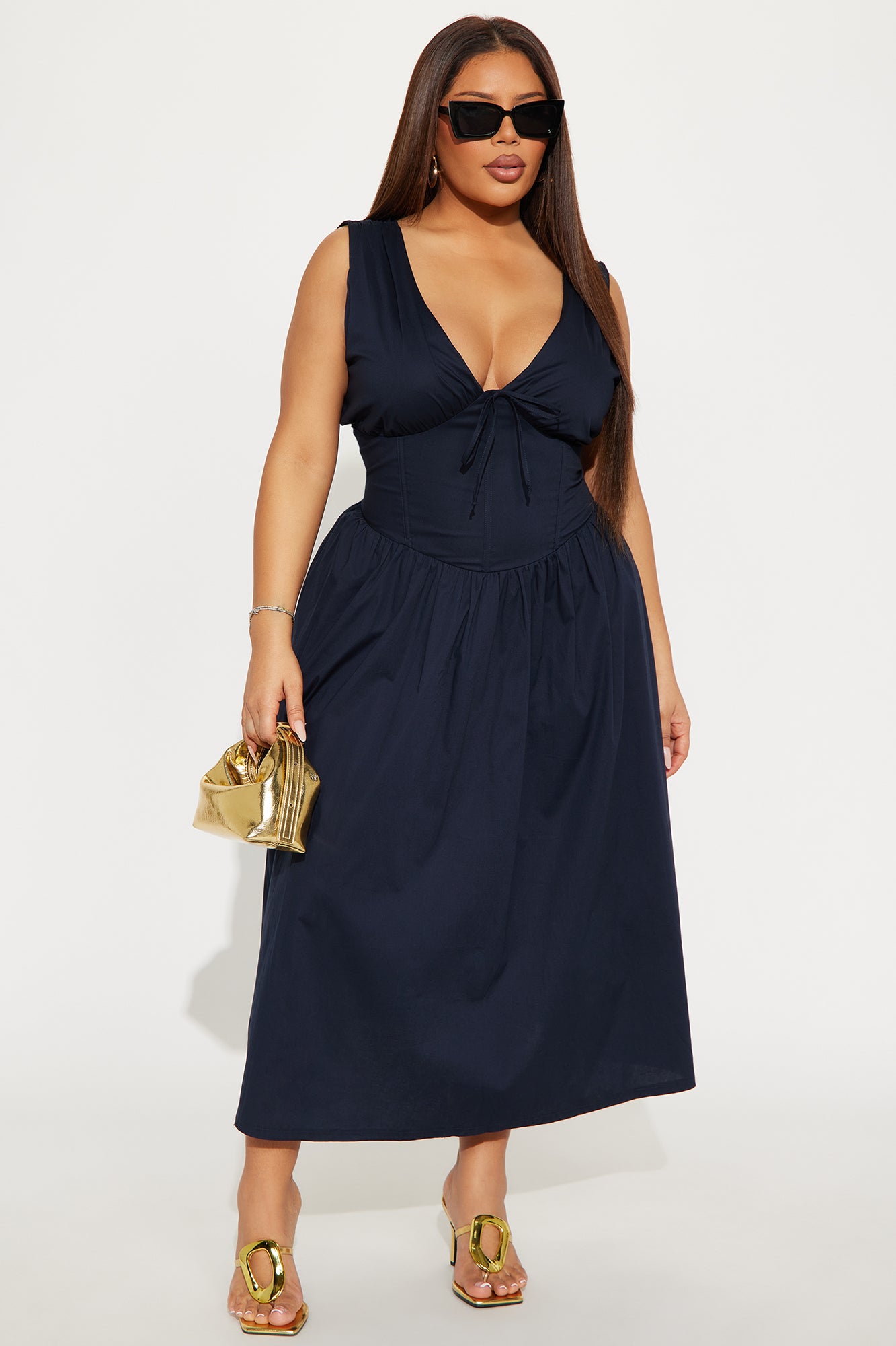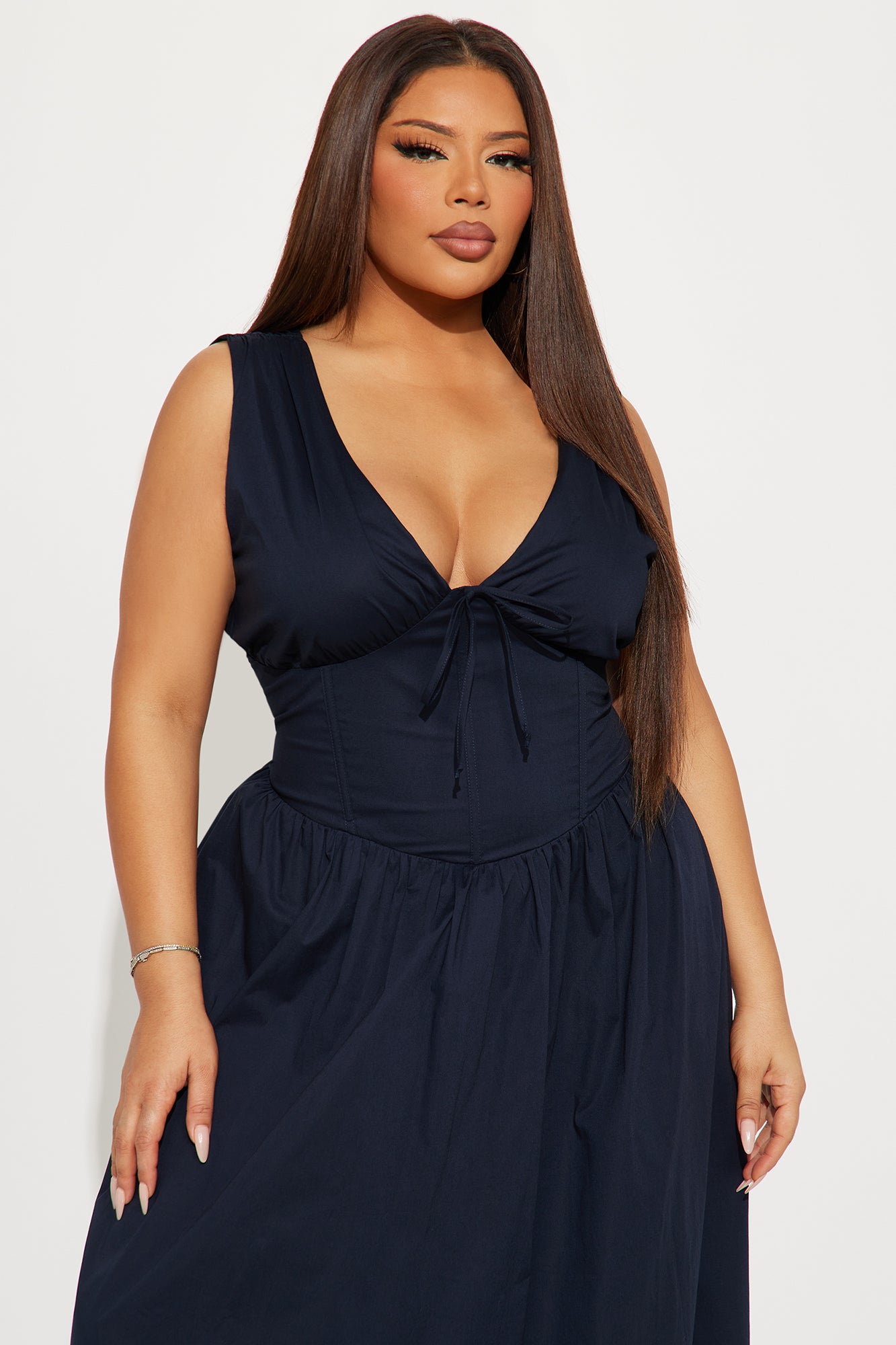 Available In Navy And Sage. Stretch Poplin Midi Dress V-neck Sleeveless Tie front Corset waist w/ boning Back zipper Stretch Length measured flat = 46" SELF: 97% COTTON 3% SPANDEX LINING: 100% POLYESTER Imported |