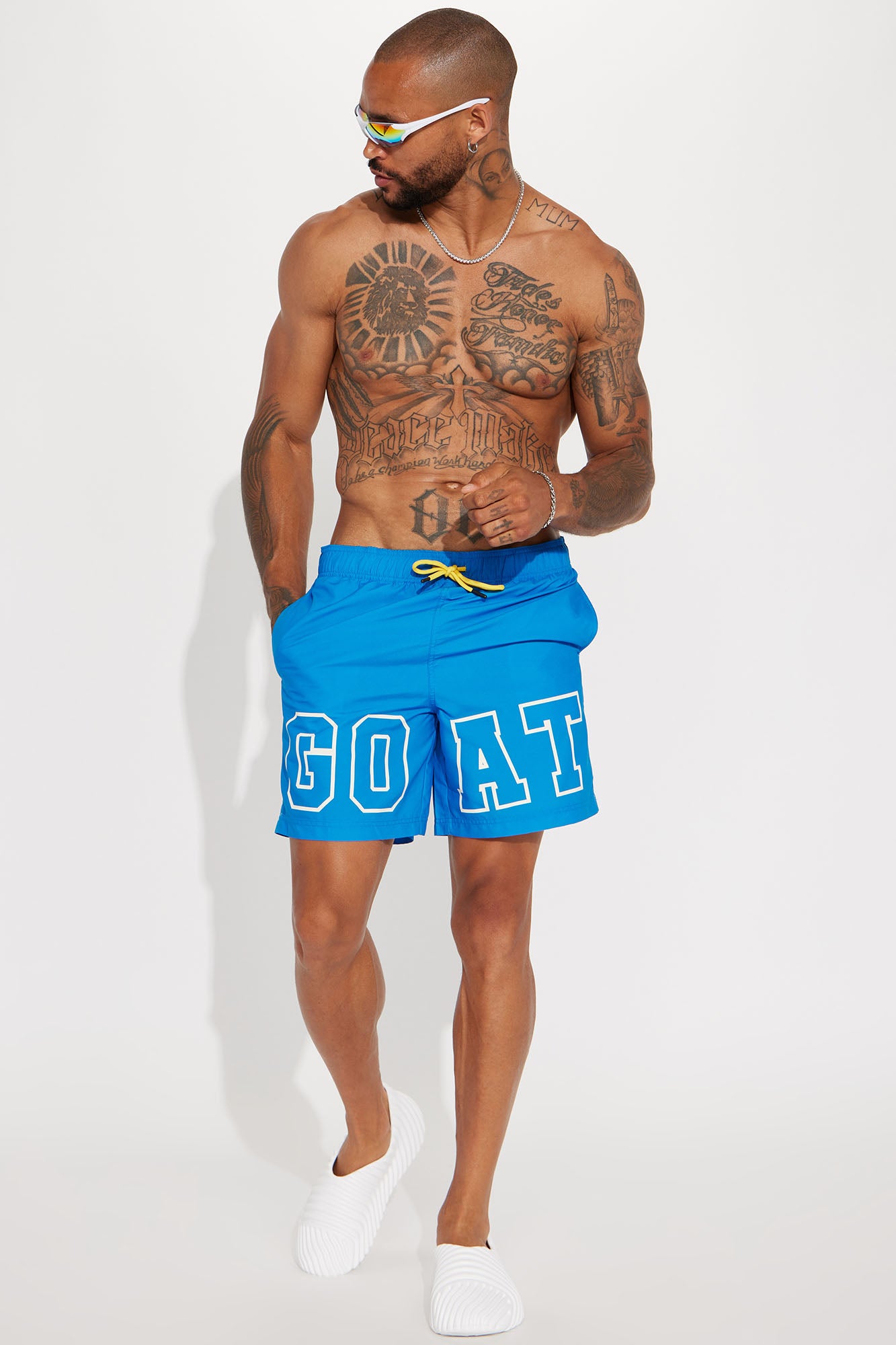 Model Height: 6'2 - Waist: 34 - Wearing Large Available In Blue. 7" Inseam Mesh Lined Elastic Waist Drawstring Side Hand Pockets Back Pocket Front GOAT Graphic Shell: 100% Polyester Lining: 100% Polyester Final Sale Imported |
