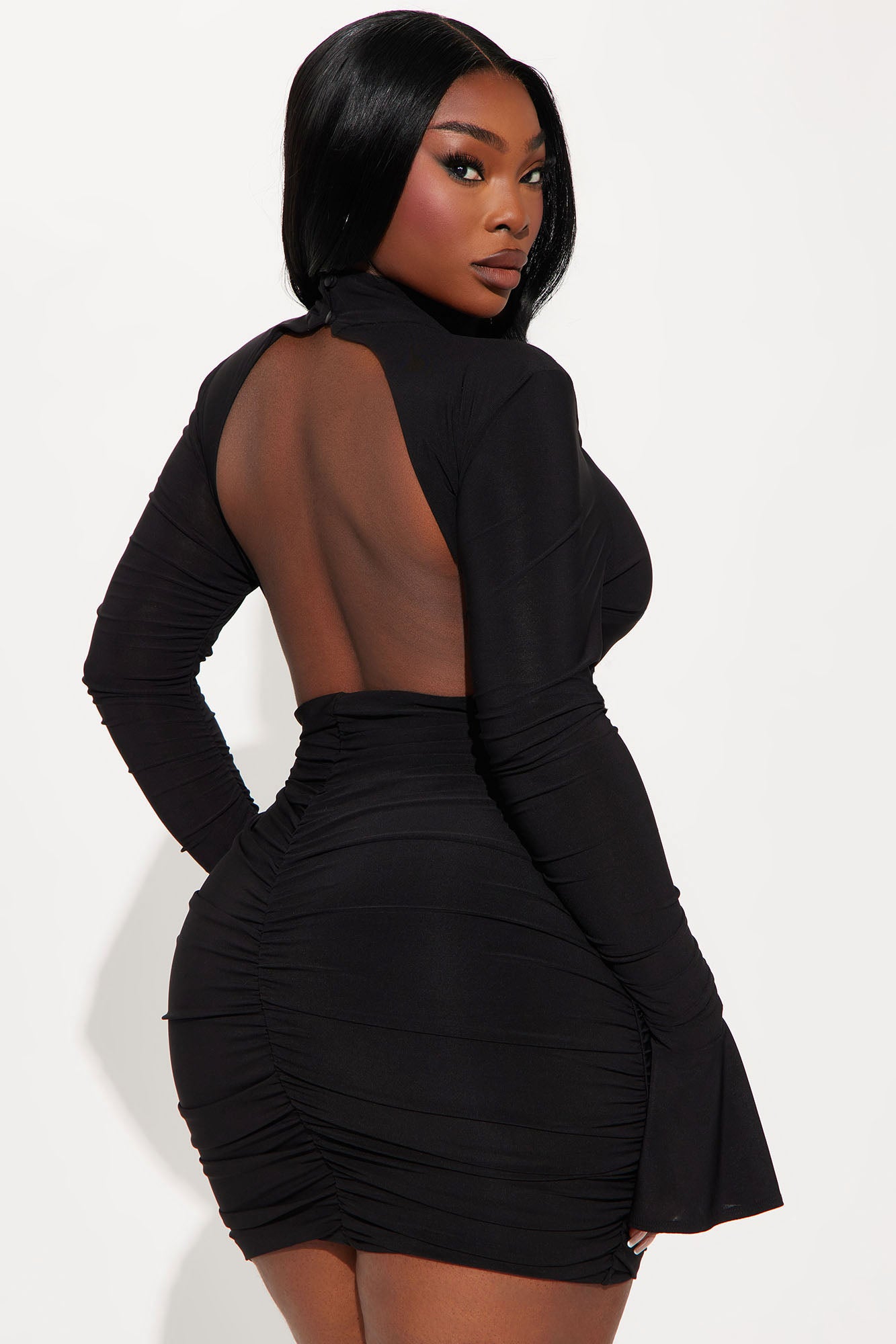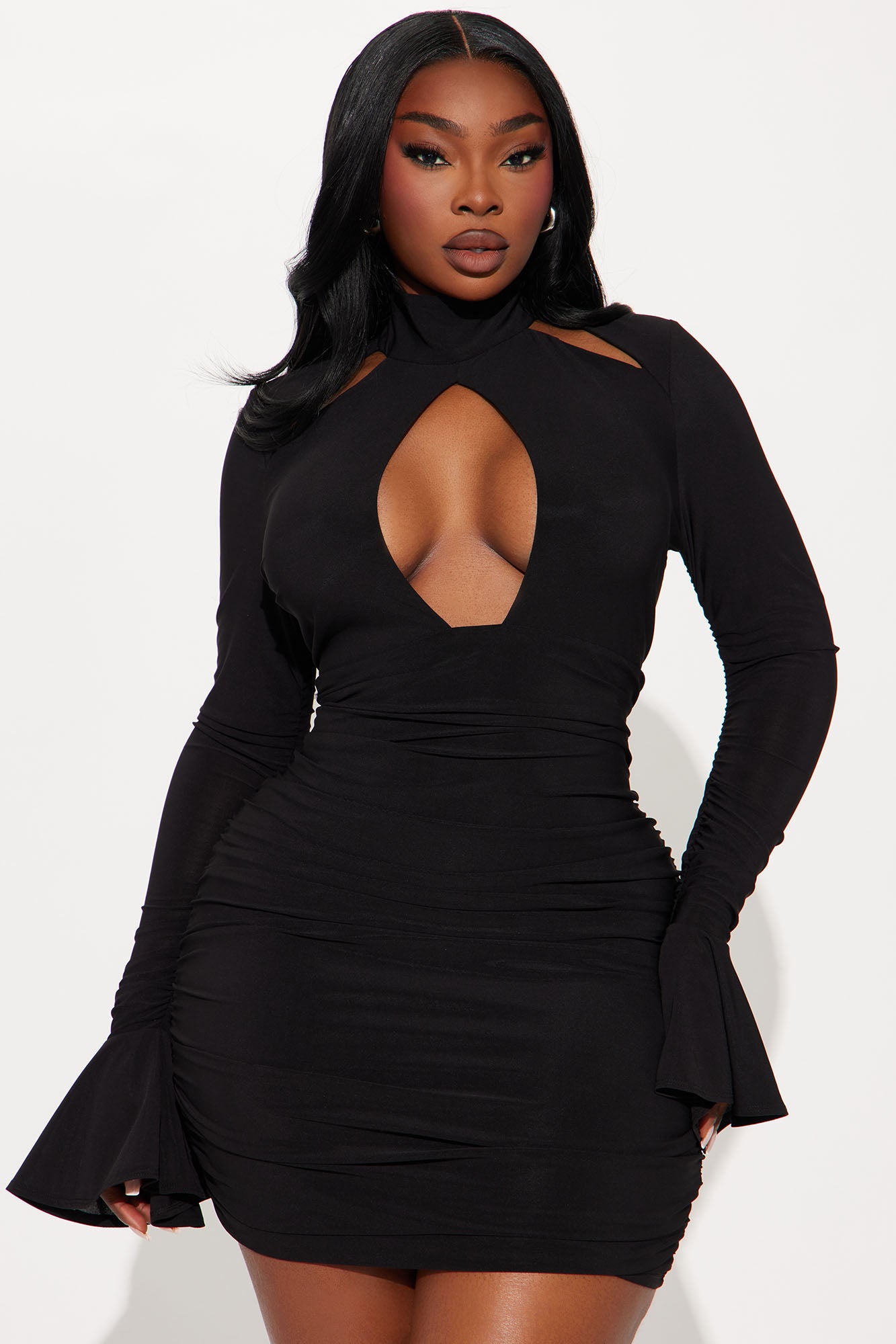 | Available In Black. Cut Out Mini Dress Mock neckline Long bell sleeves Cut outs Ruched Double Lined Stretch Length measured flat = 33" 95% Polyester 5% Spandex Imported |