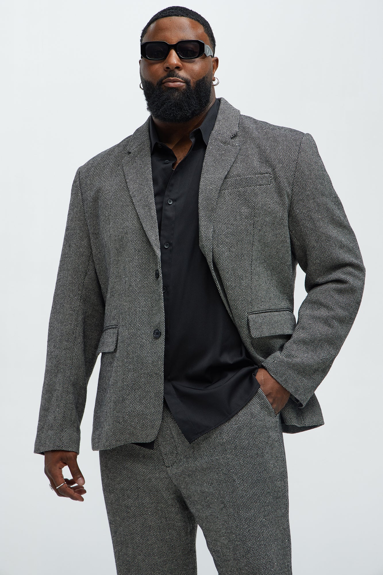 Available In Charcoal. Pointed Lapels 2 Button Closure Front Pockets Pair With "Hancock Tweed Textured Slim Trousers" 70% Polyester, 30% Wool Imported |