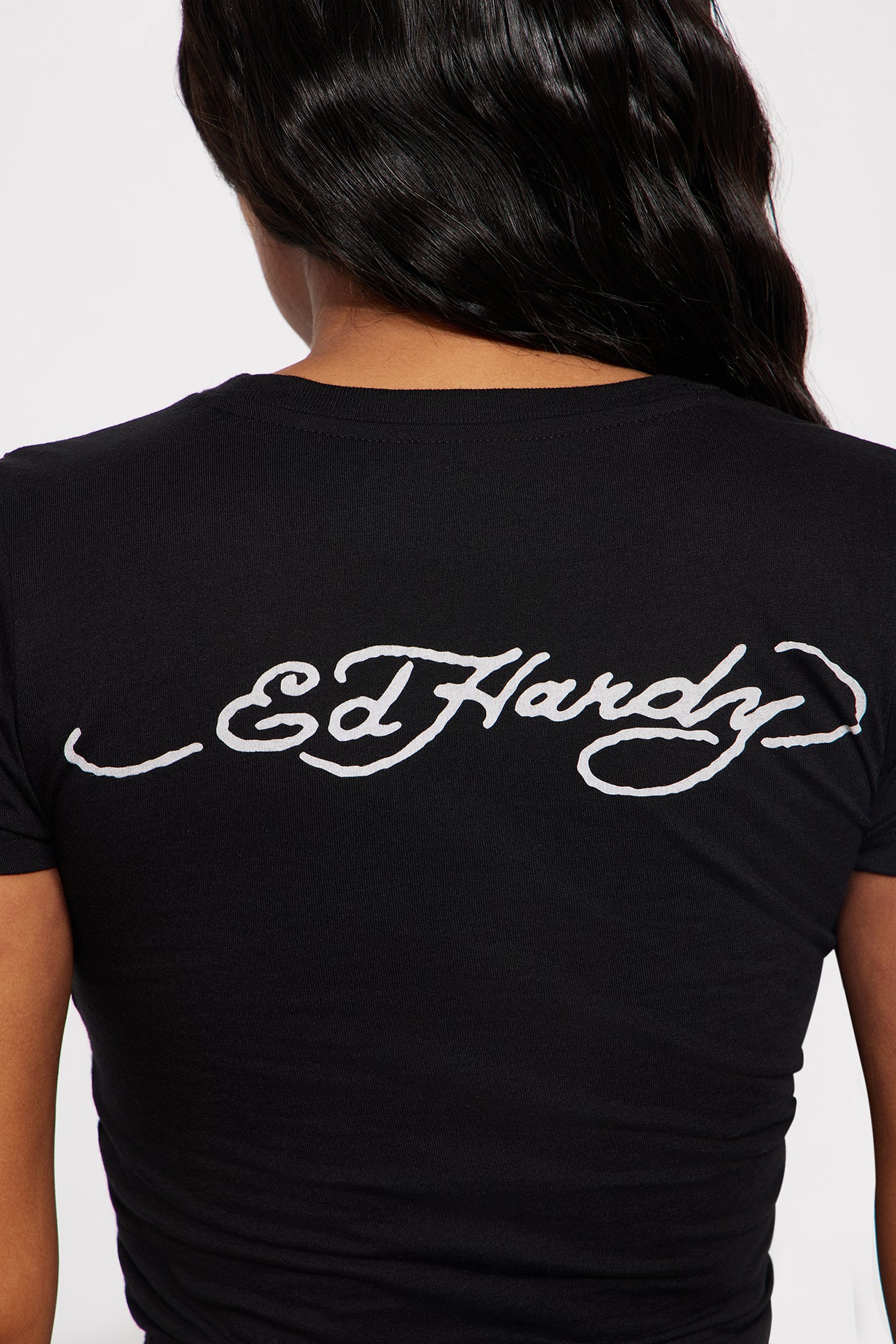 Available In Black. Crew Neck Short Sleeve Ed Hardy Graphic Front Screen Stretch Disclaimer: Due To The Specialized Screen Printing Process A Difference In Saturation May Occur. Each Garment Is Unique. 65% Polyester 35% Cotton Imported |