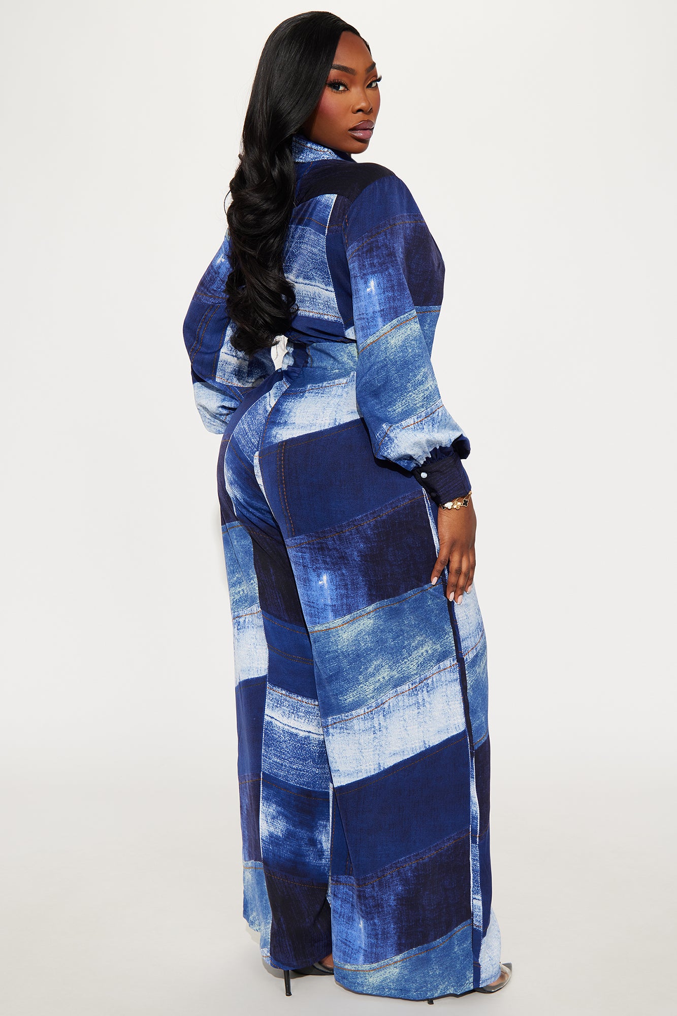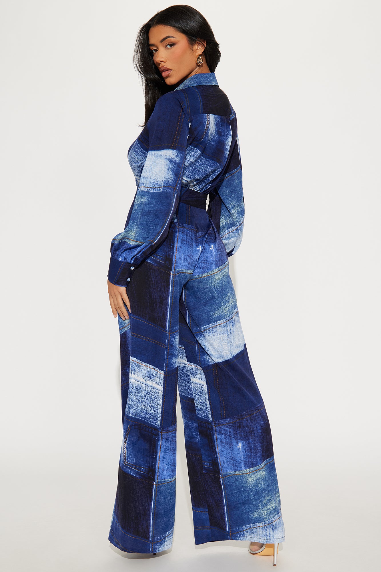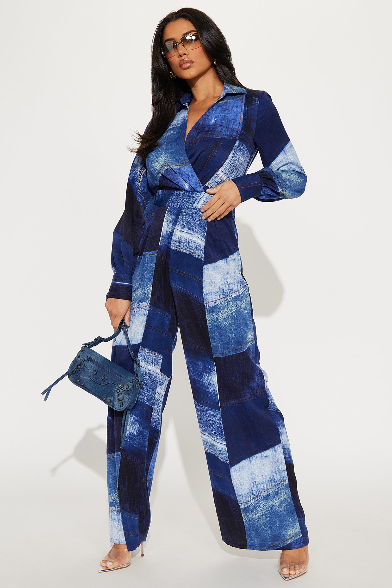 Available In Blue/combo. Jumpsuit Collar with Surplice Neckline Back Yoke Invisible Size Zip Closure Sleeve Cuff with Button Detail Wide Leg Non Stretch Inseam = 32" Disclaimer: Print Placement Will Vary Self 100% Polyester Imported |