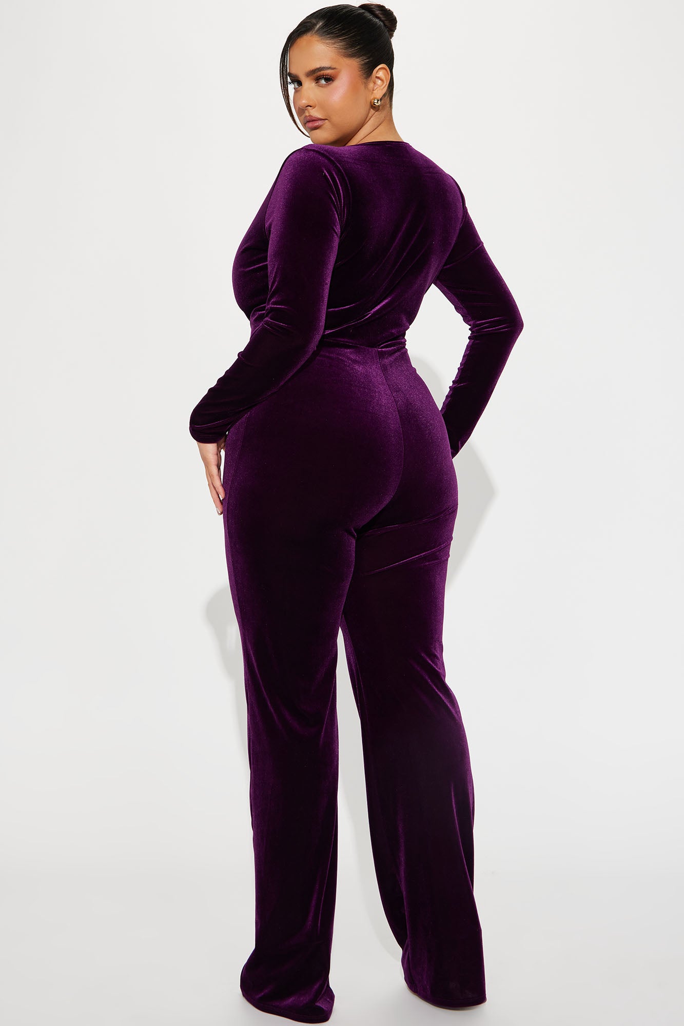 Available In Hunter And Purple. Velvet Jumpsuit Long Sleeve Deep V Neck Ruched Stretch Wide Leg Inseam= 34" Self: 95% Polyester 5% Spandex Lining: 100% Polyester Lining: 100% Polyester Imported |