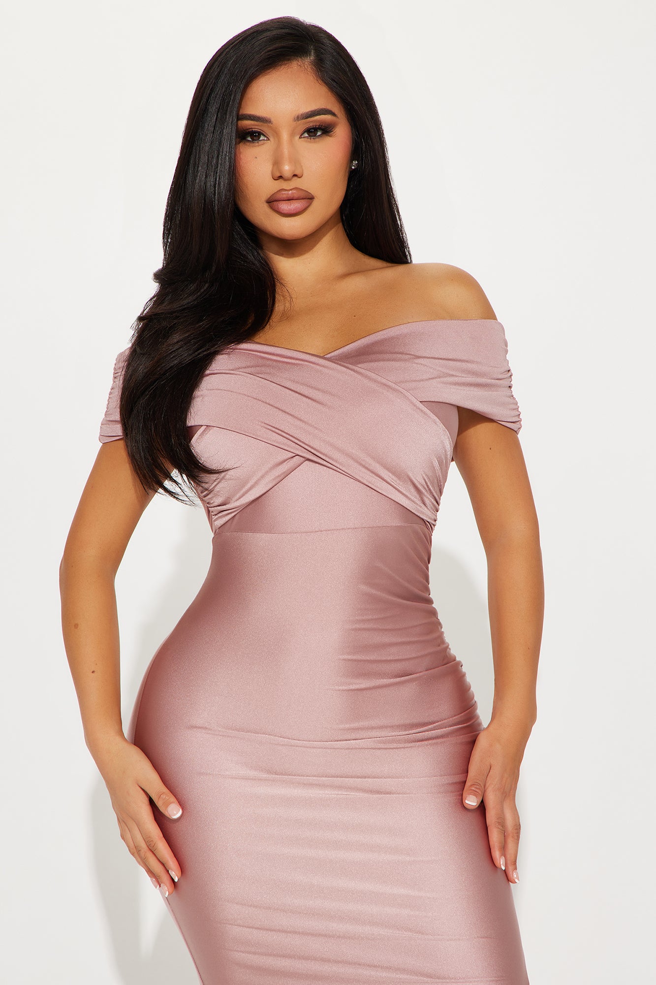 Available In Hunter, Mauve, And Silver. Maxi Dress Off Shoulder Front Slit Ruched Detailing On Side Hidden Back Zipper Stretch Body: 82% Nylon 18% Spandex Lining: 100% Polyester Imported |