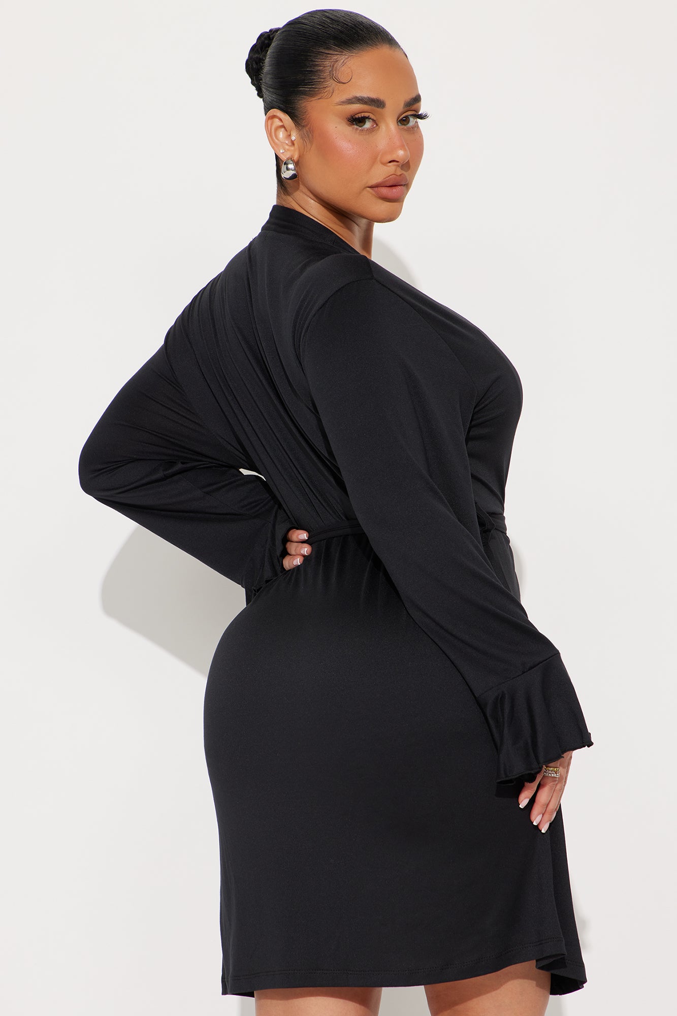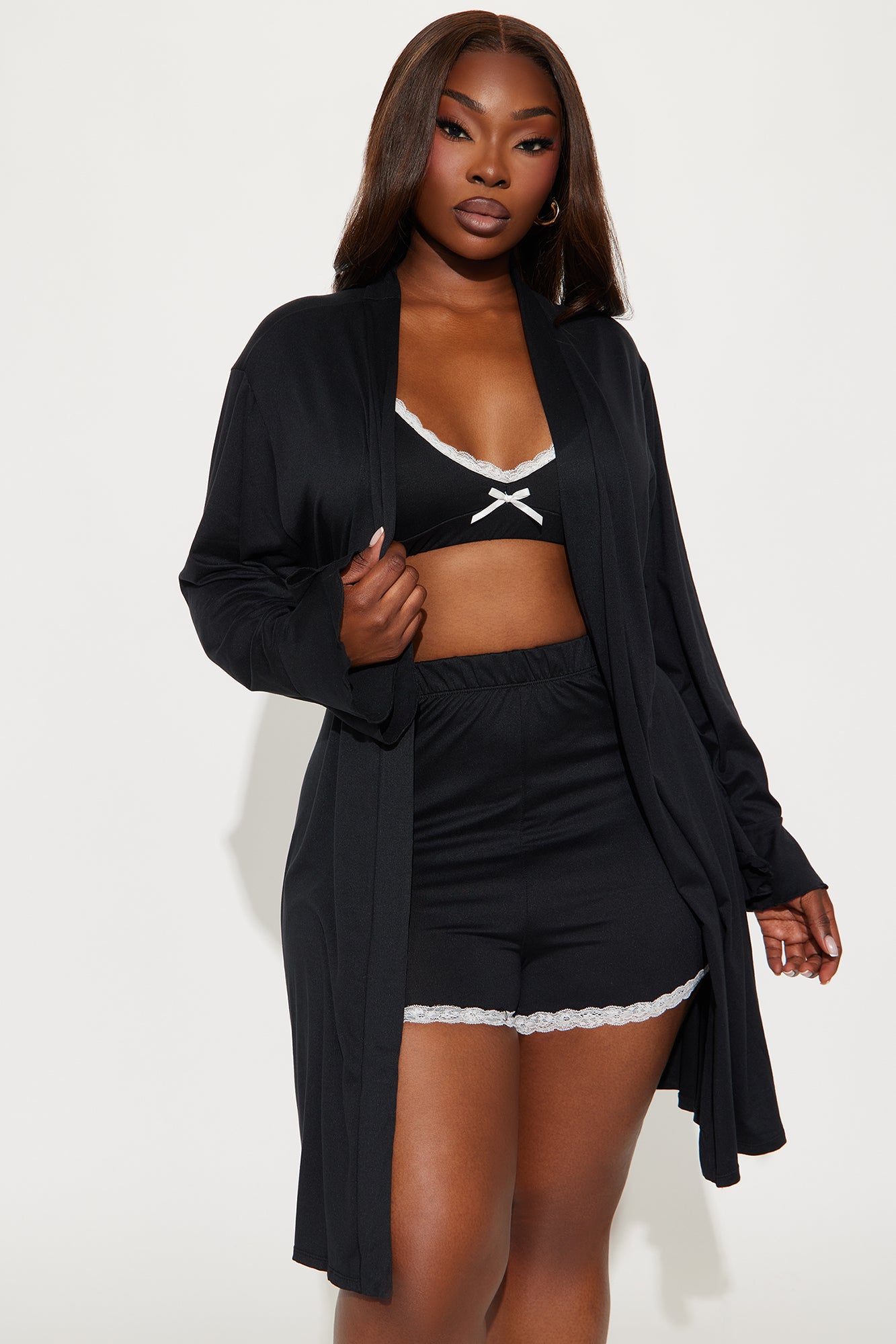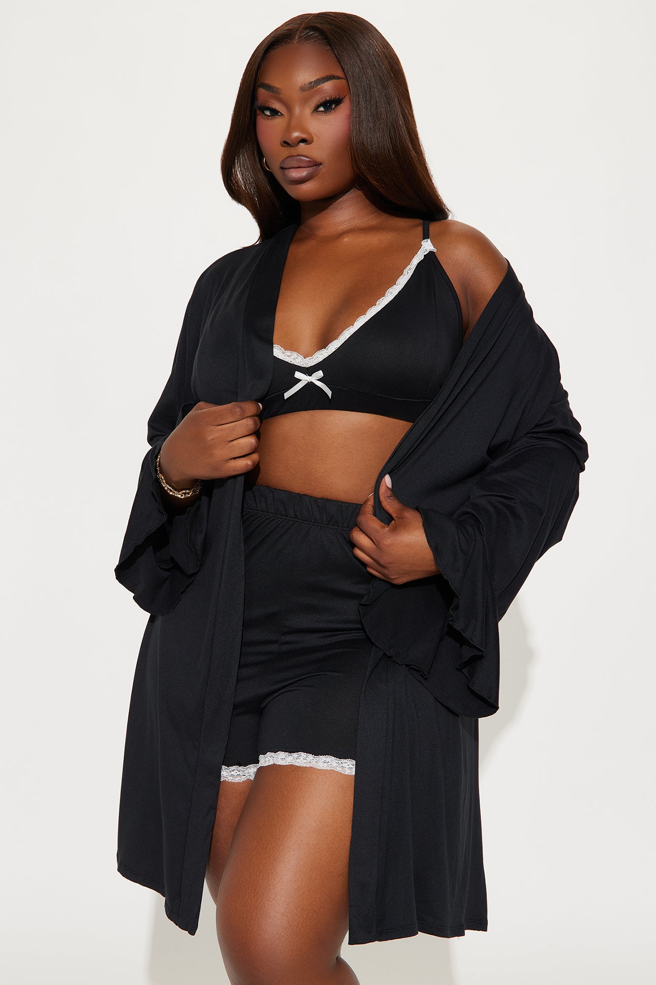 Available In Black/White And Pink. 3 Piece PJ Set Triangle Bralette Adjustable Straps Bow Detail Matching Shorts Elastic Waistband Lace Trim Matching Robe Long Sleeve Tie Waist Stretch Final Sale 92% Polyester 8% Spandex Imported |