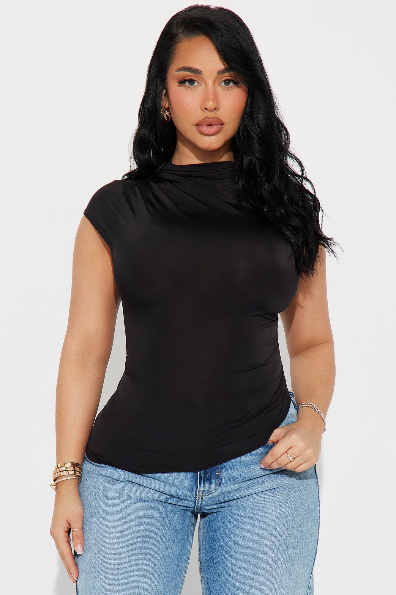 Available In Magenta And Black. High Neck Top Stretch Ruched Cap Sleeve Asymmetrical Cropped Self: 95% Rayon 5% Spandex Imported |