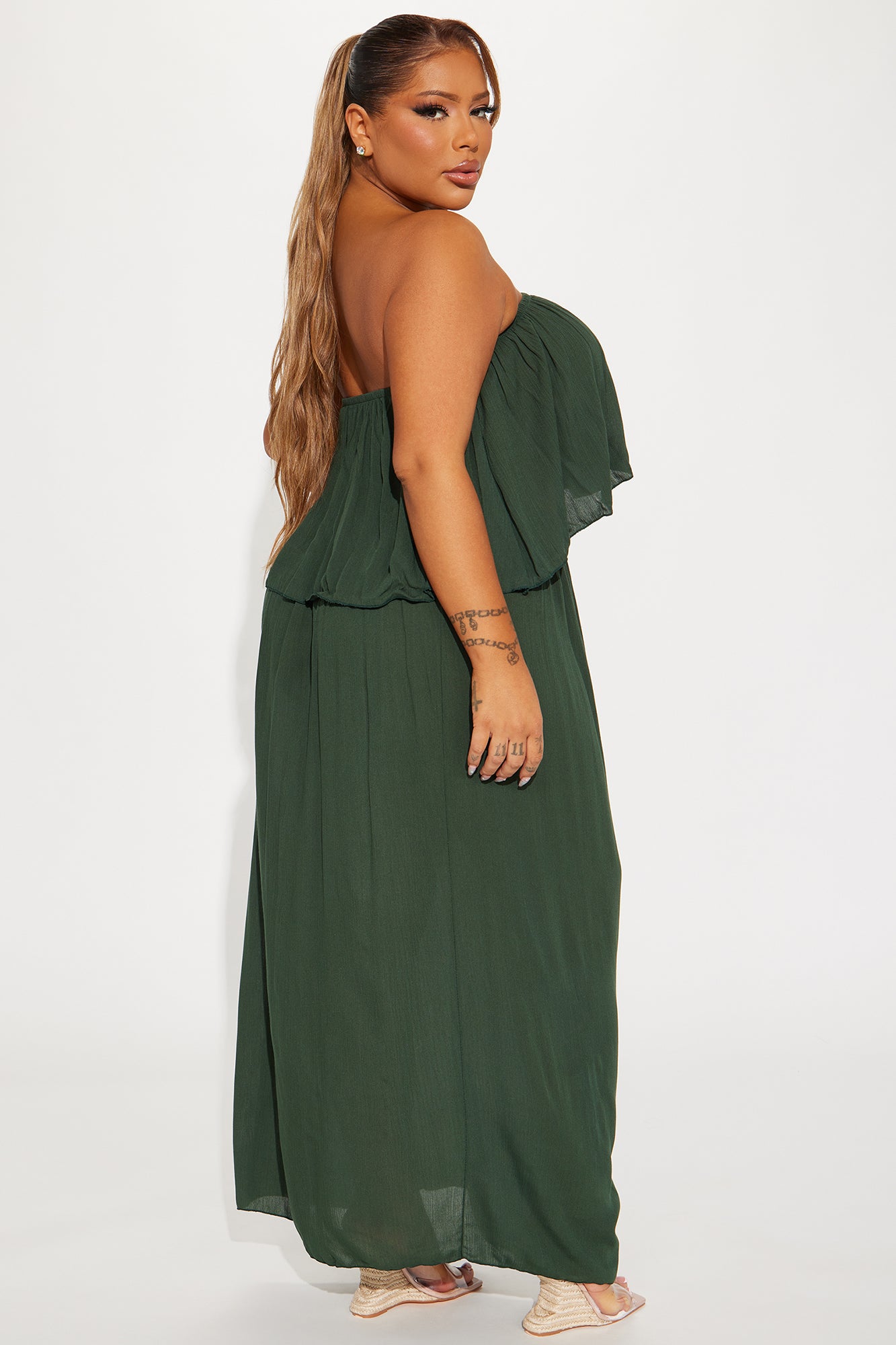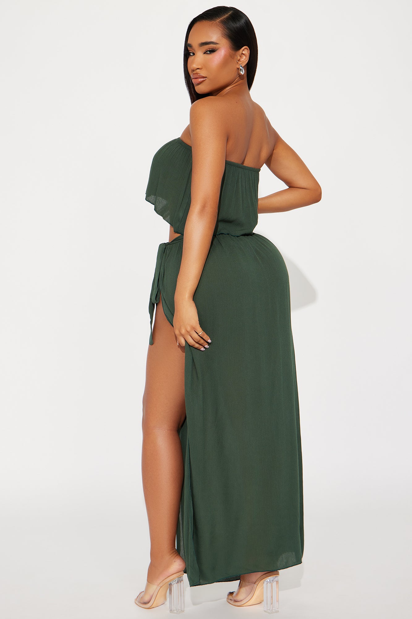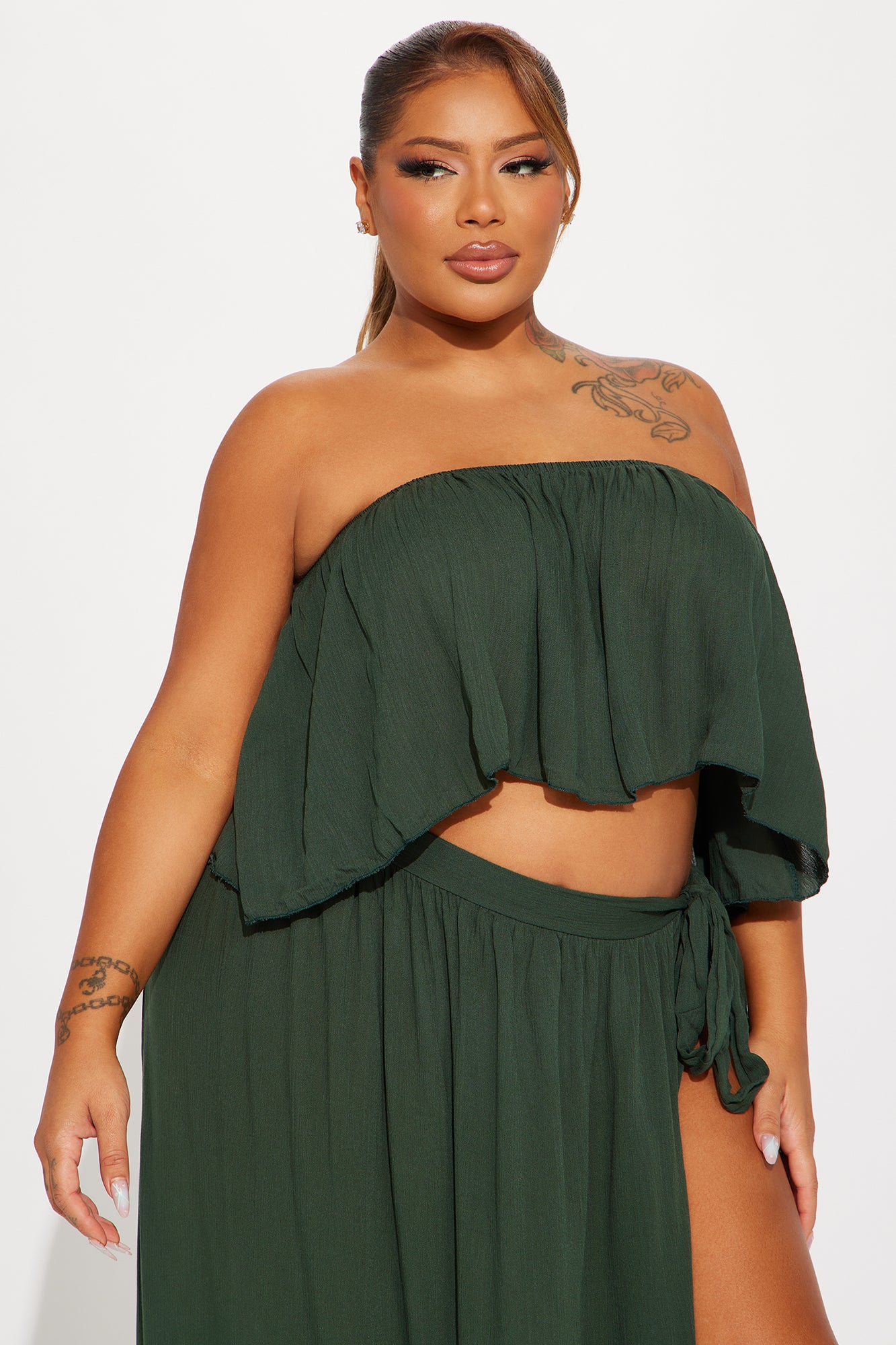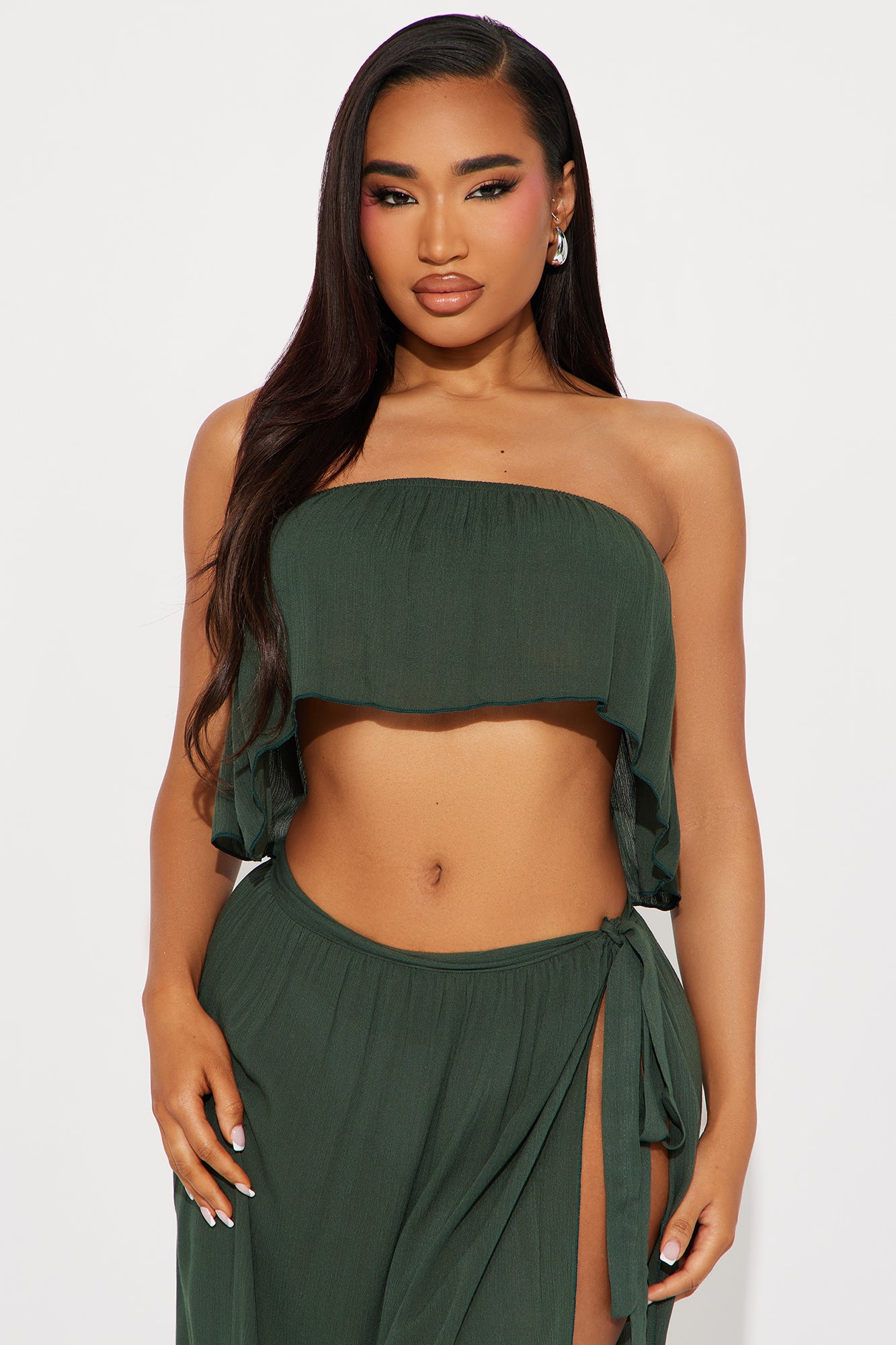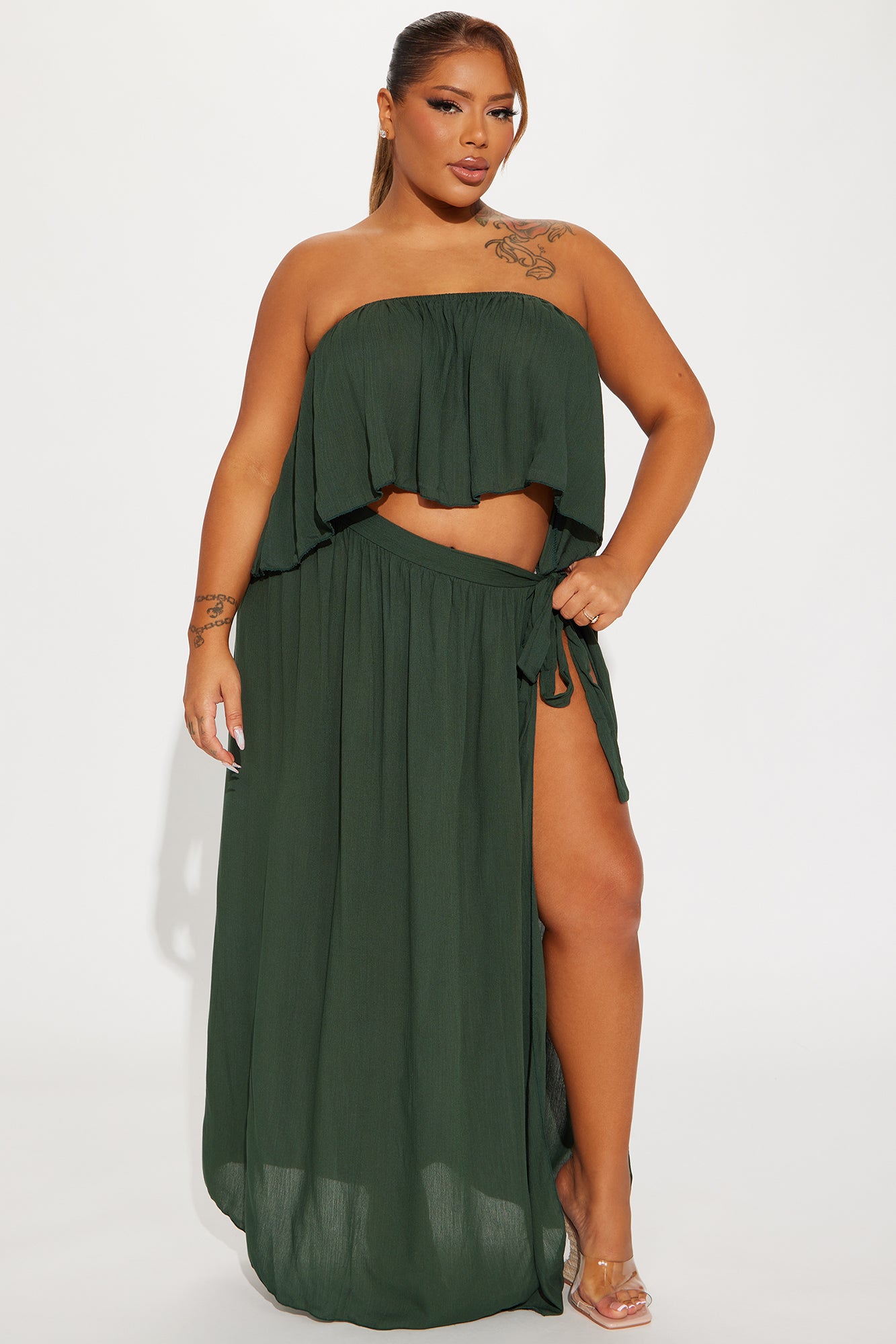 Available In Olive. Swim Cover Up Skirt Set Crinkle Gauze Crop Top Strapless Flowy Maxi Skirt Side Tie High Side Slit Full Stretch Final Sale 100% Polyester Imported |