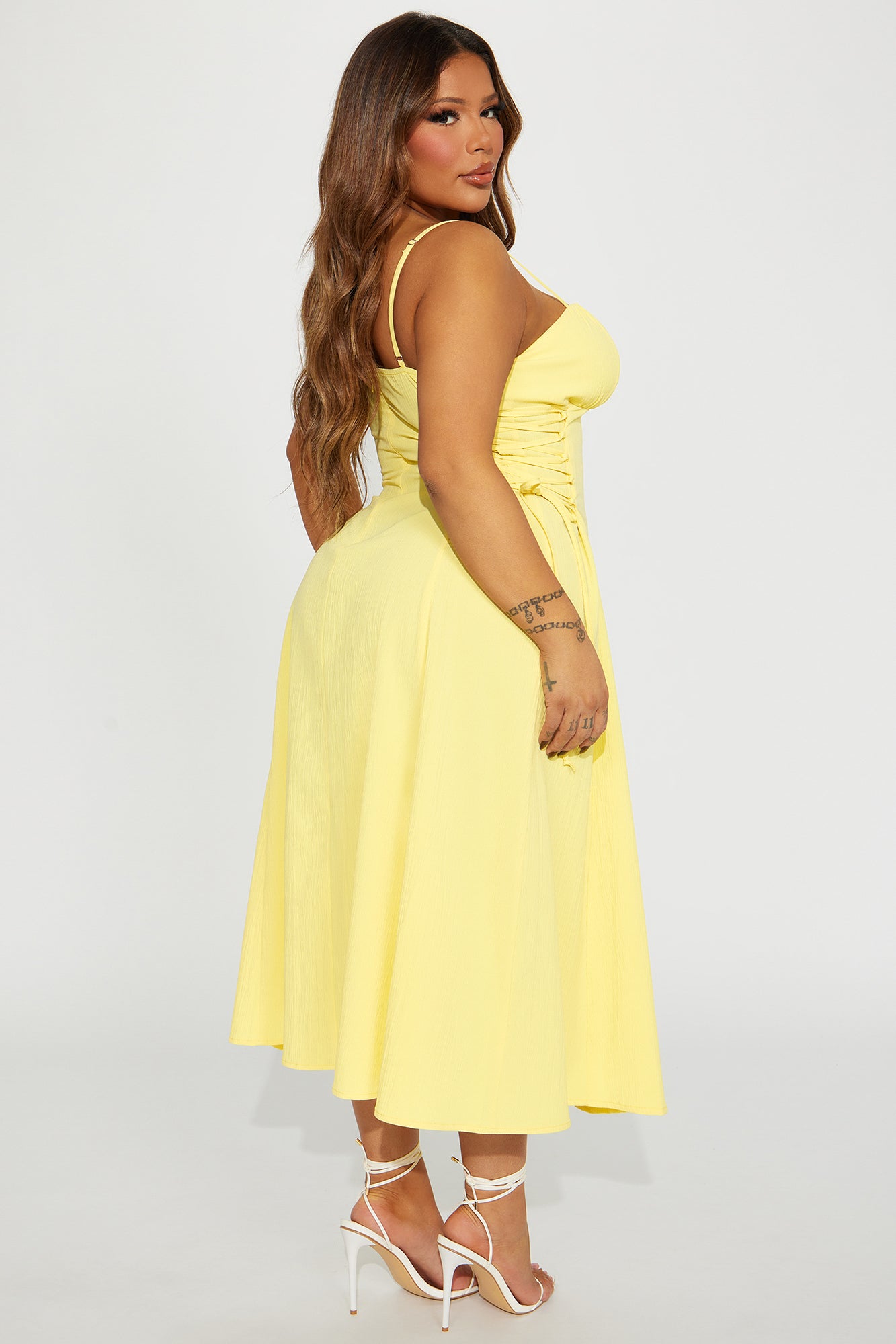 Available In Yellow And Kelly Green. Midi Dress Adjustable Spaghetti Straps Square Neckline Ruched Detail Back Zipper Side Lace Up Semi Stretch 97% Polyester 3% Spandex Imported |