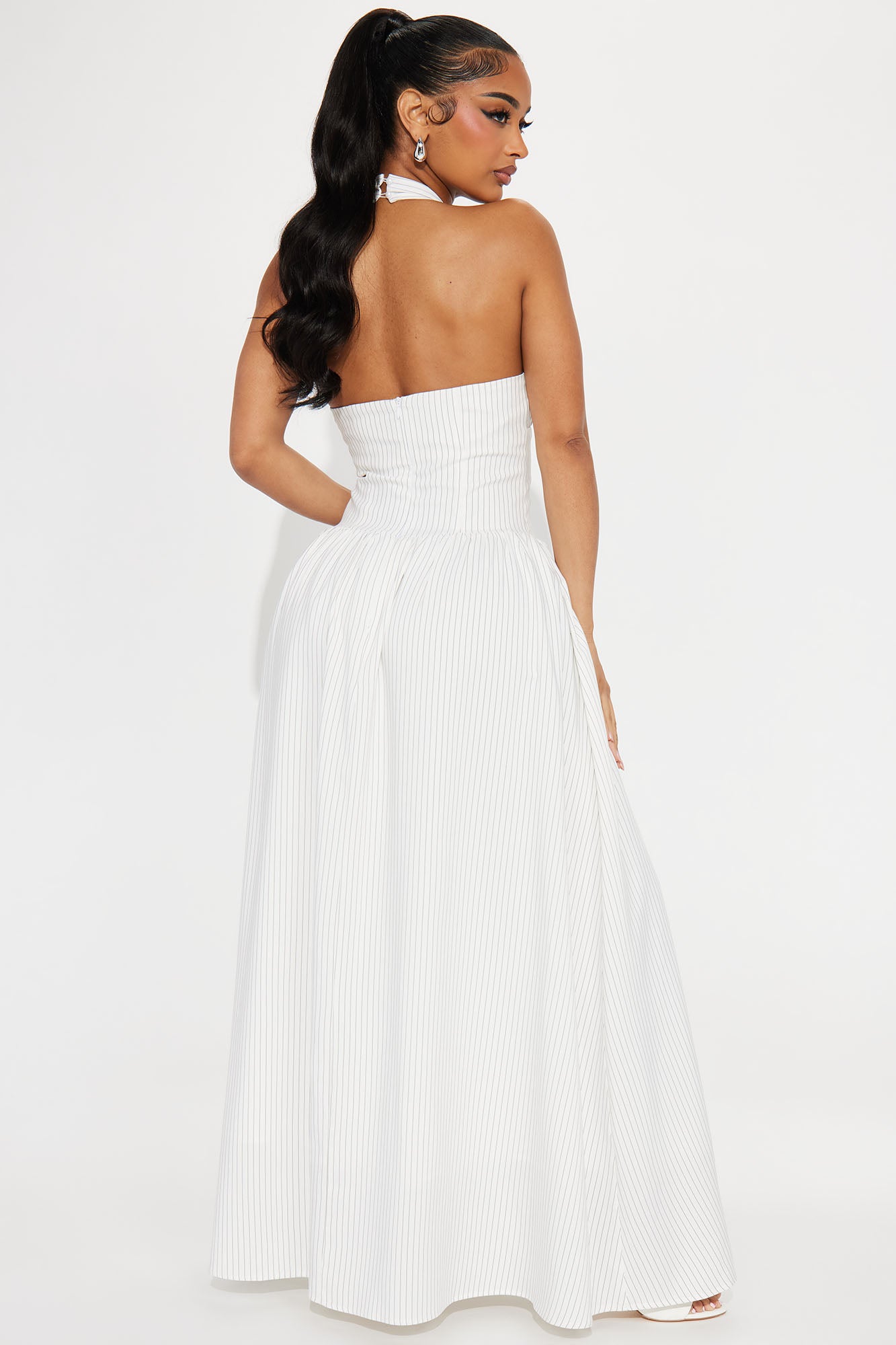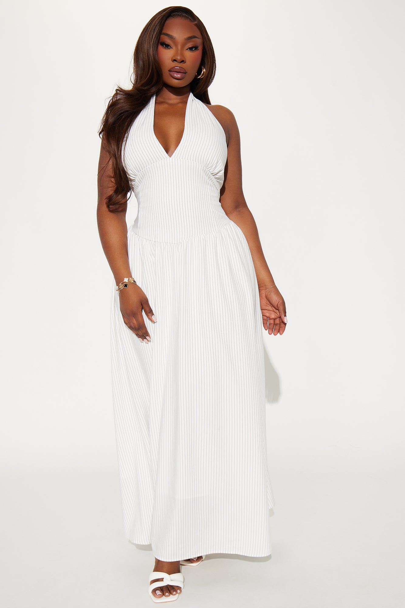 Available In White/combo And Navy/combo. Pinstripe Maxi Dress Halter V-Neckline Drop Waist Hidden Back Zipper Lined Slight Stretch Disclaimer: Stripe Placement MayVary. Shell: 90% Polyester 7% Rayon 3% Spandex Lining: 100% Polyester Imported |