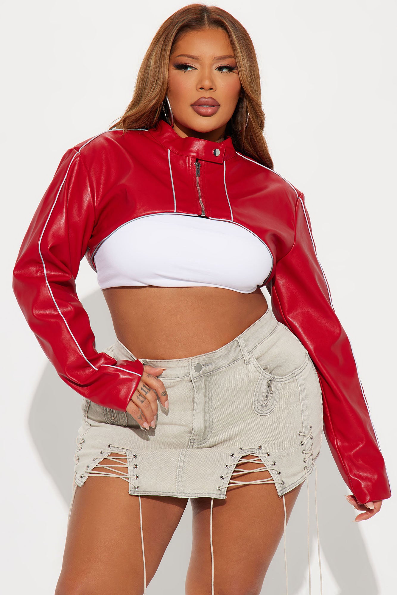 | Available In Black And White. Faux Leather Jacket Snap Button Neck Closure Contrast Stitch Cropped Shell: 100% Polyester, Coated With PU Lining: 100% Polyester Imported |