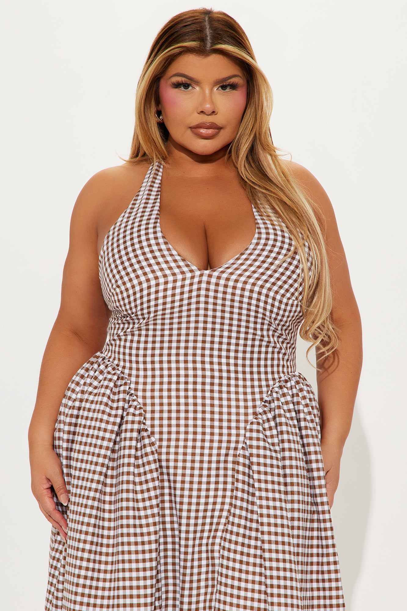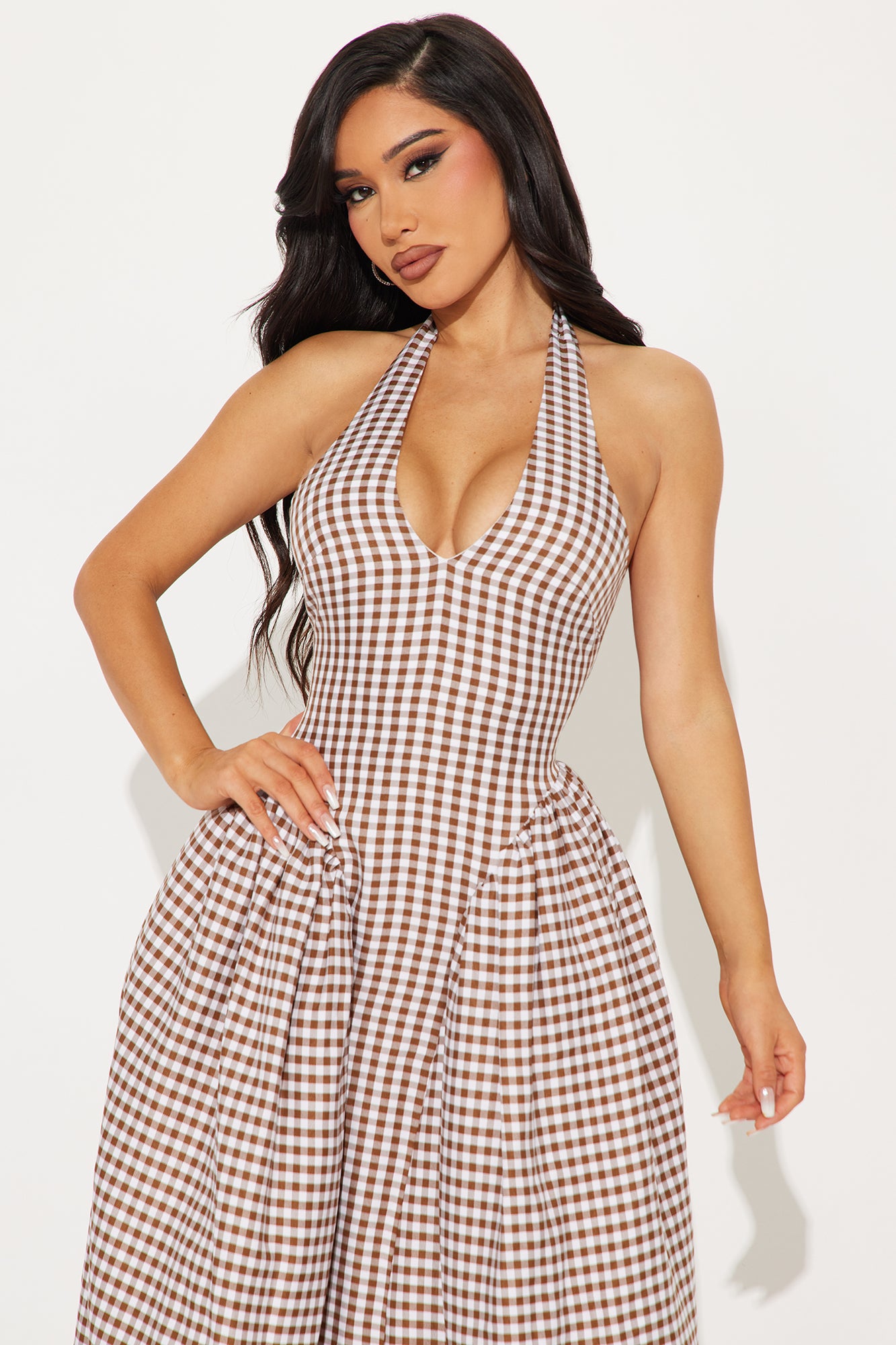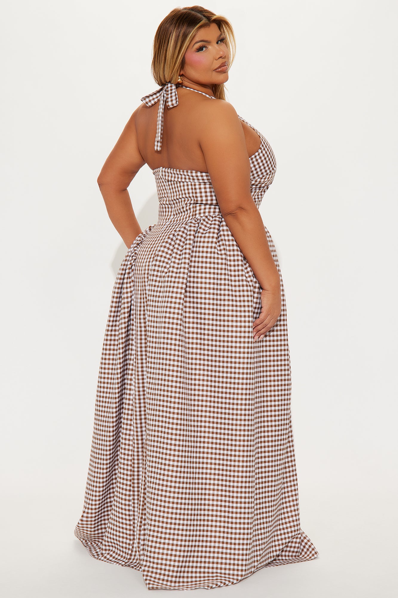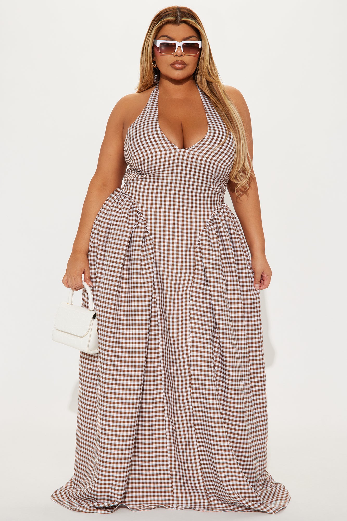 Available In Pink/combo And Chocolate/Combo. Maxi Dress Halter V-Neckline Hidden Back Zipper Lined No Stretch SHELL: 100% POLYESTER LINING: 1 & 2 100% POLYESTER Imported |