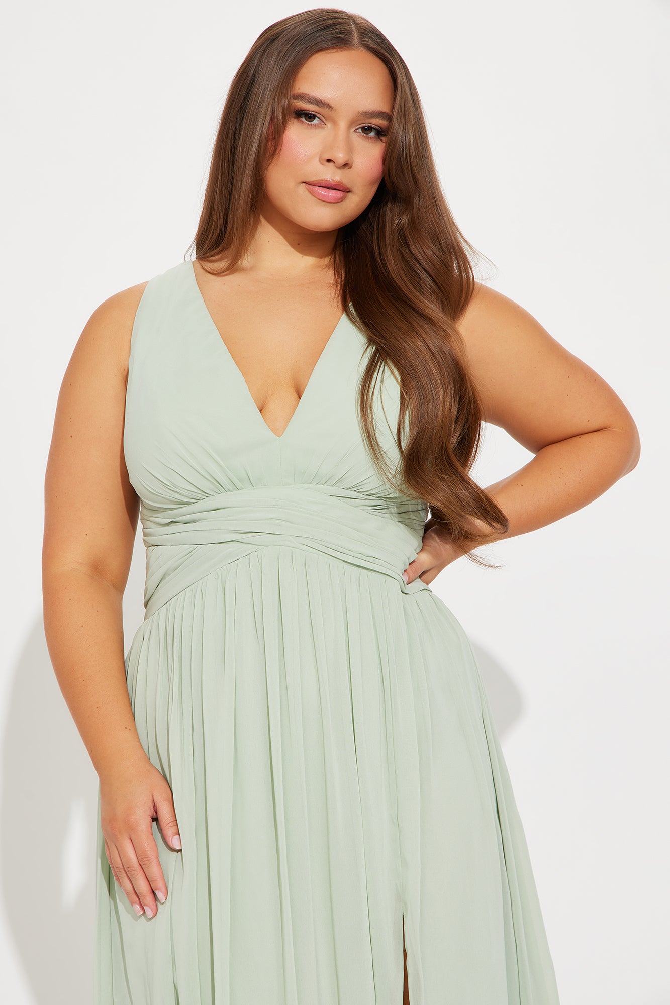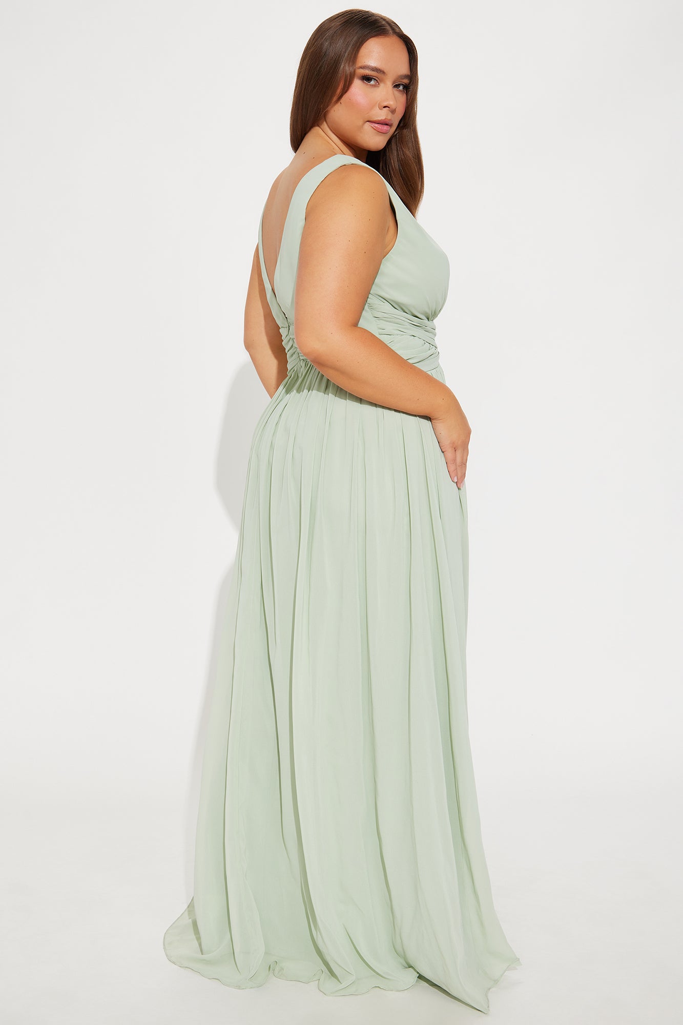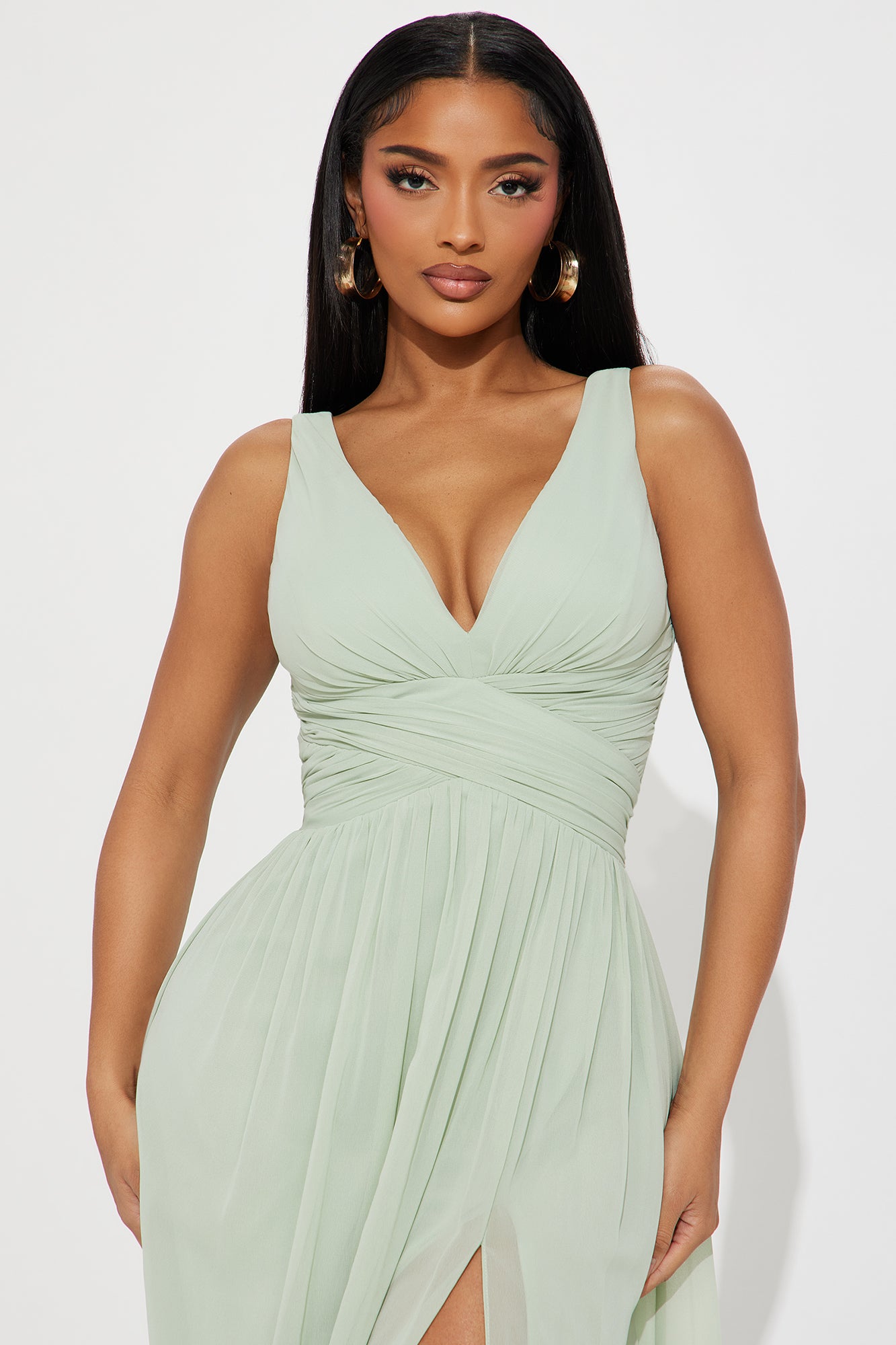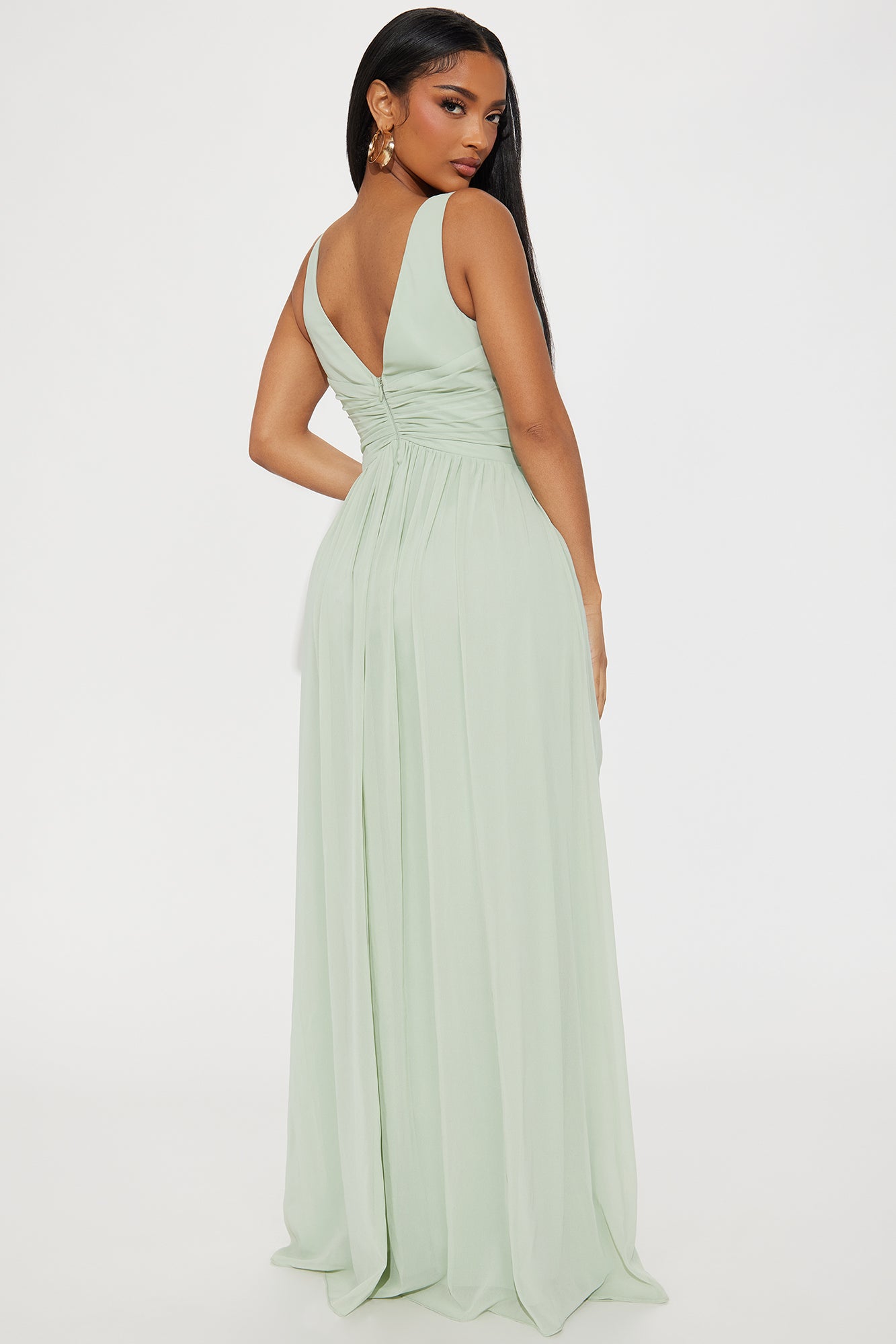 Available In Sage, Light Blue, Butter Yellow, And Mauve. Chiffon Maxi Gown Deep V Neck Low Back Ruched Pleated Slit Lined Back Zipper Closure Non Stretch Self: 100% Polyester Lining: 100% Polyester Imported |
