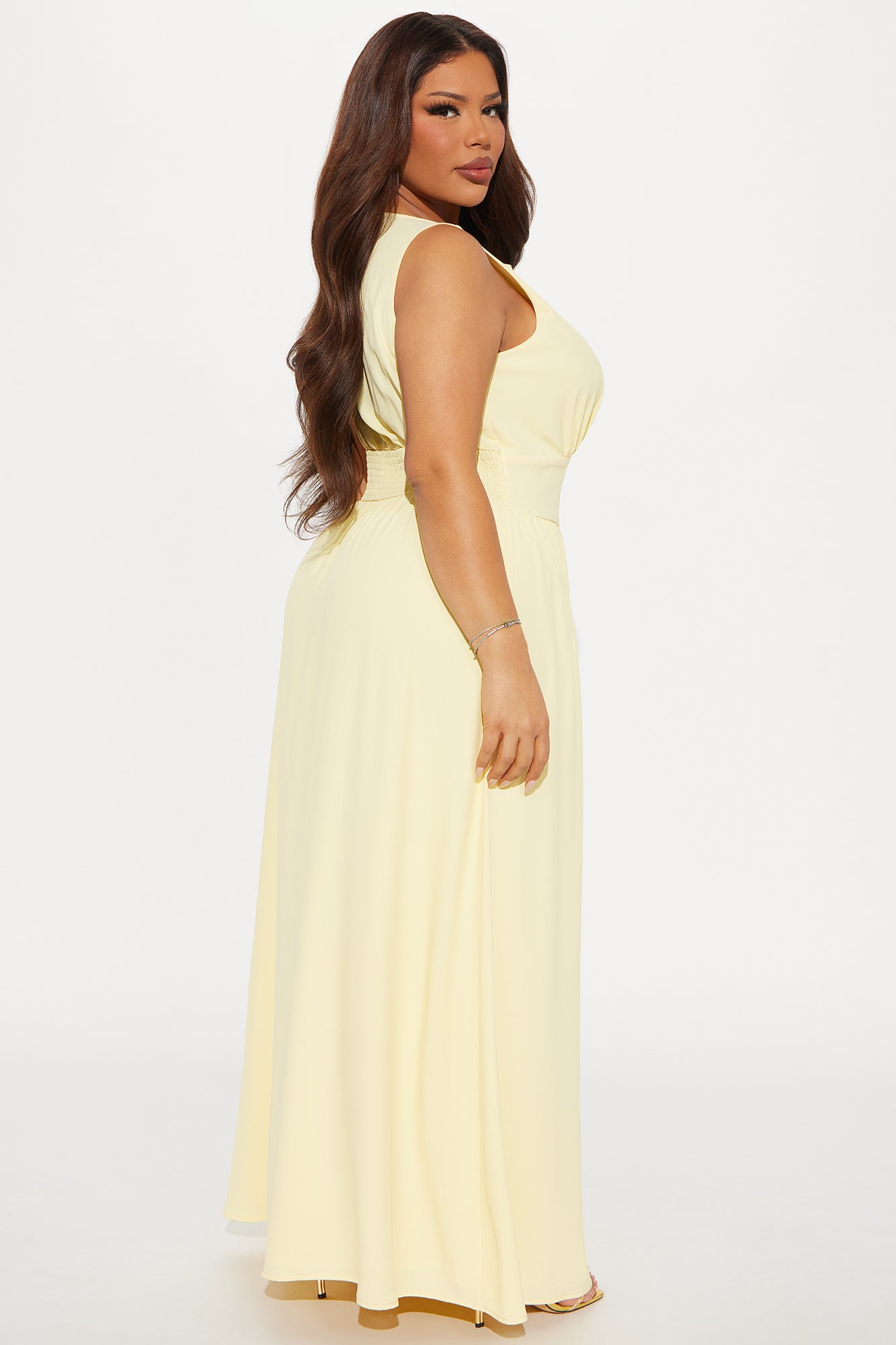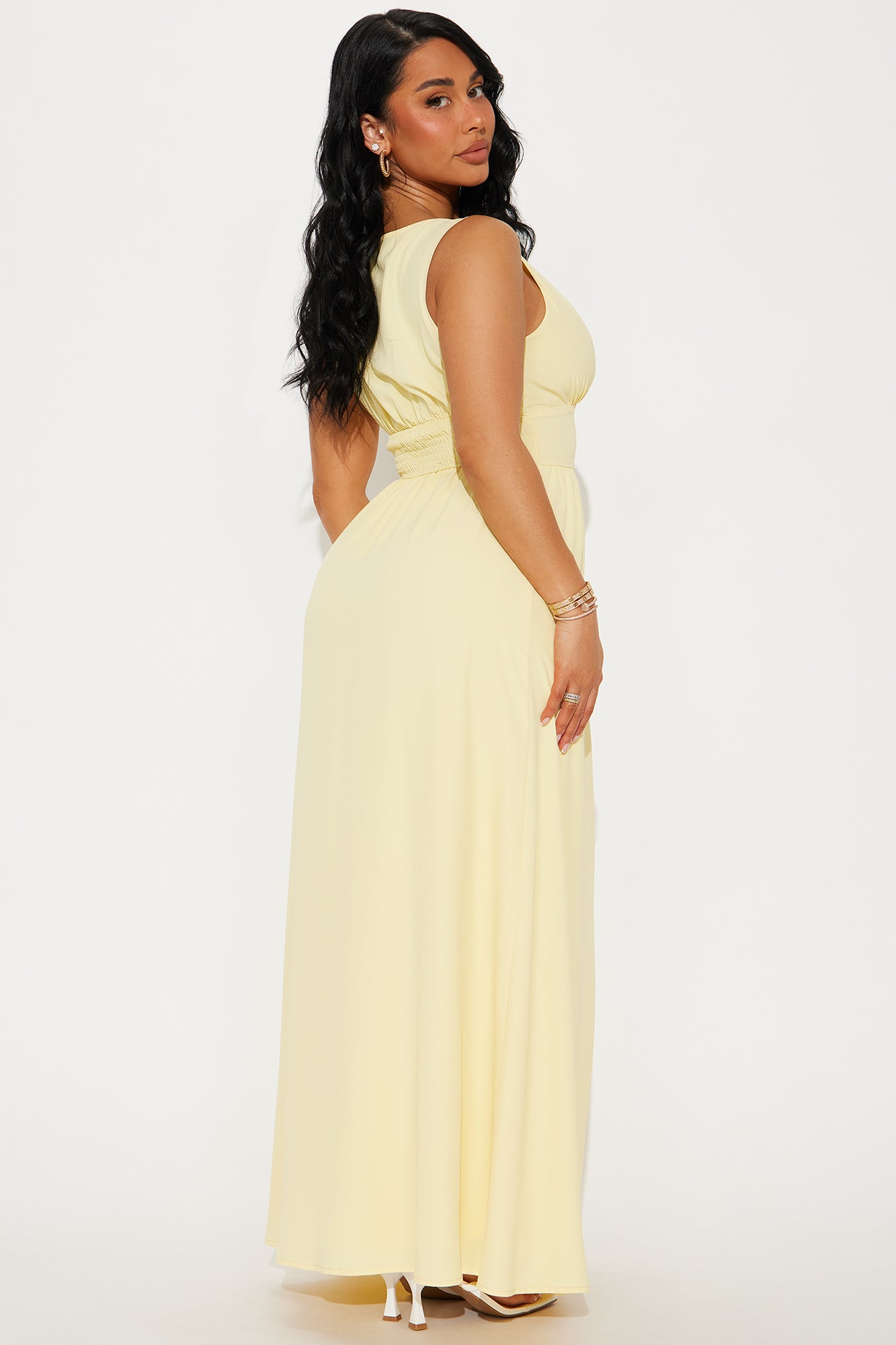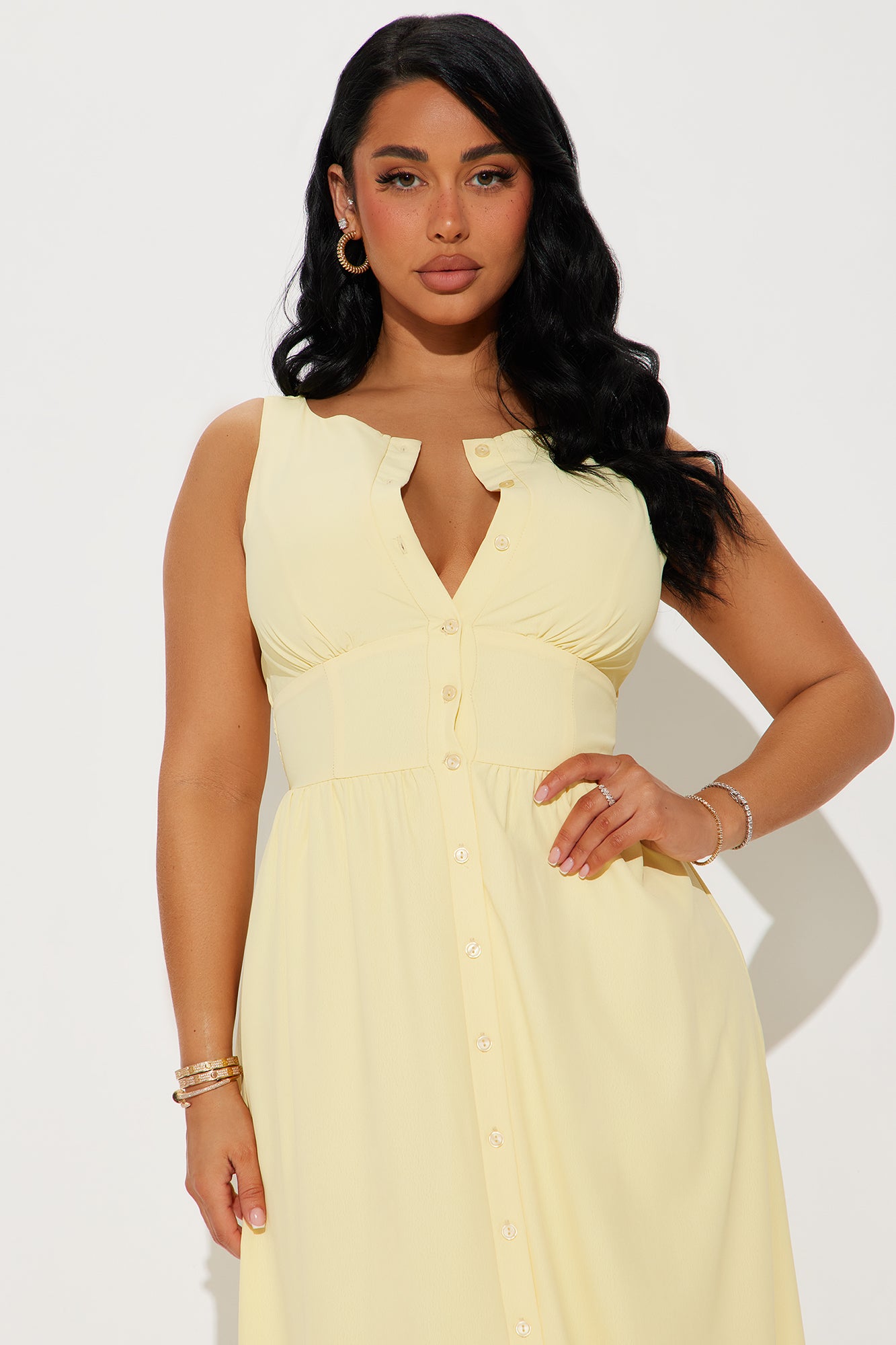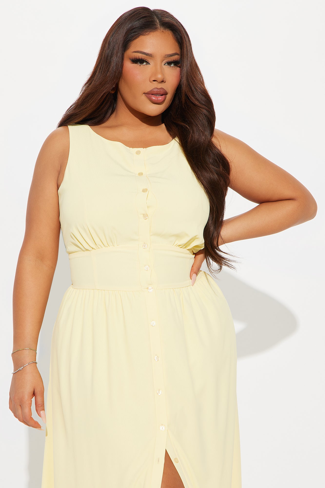 Available In Butter Yellow. Maxi Dress High Neck Sleeveless Button Front Smocked Waist Lined No Stretch Pockets Self: 100% Polyester Lining; 100% Polyester Imported |