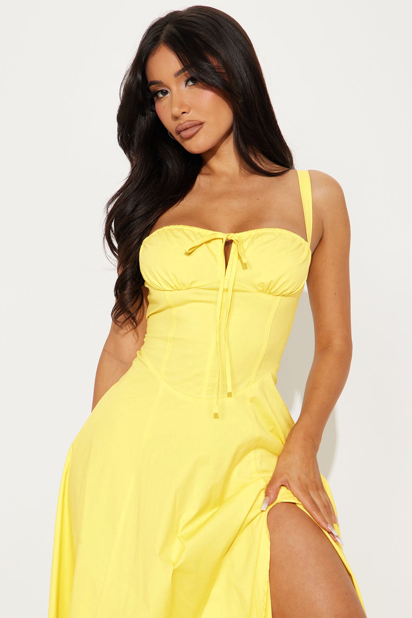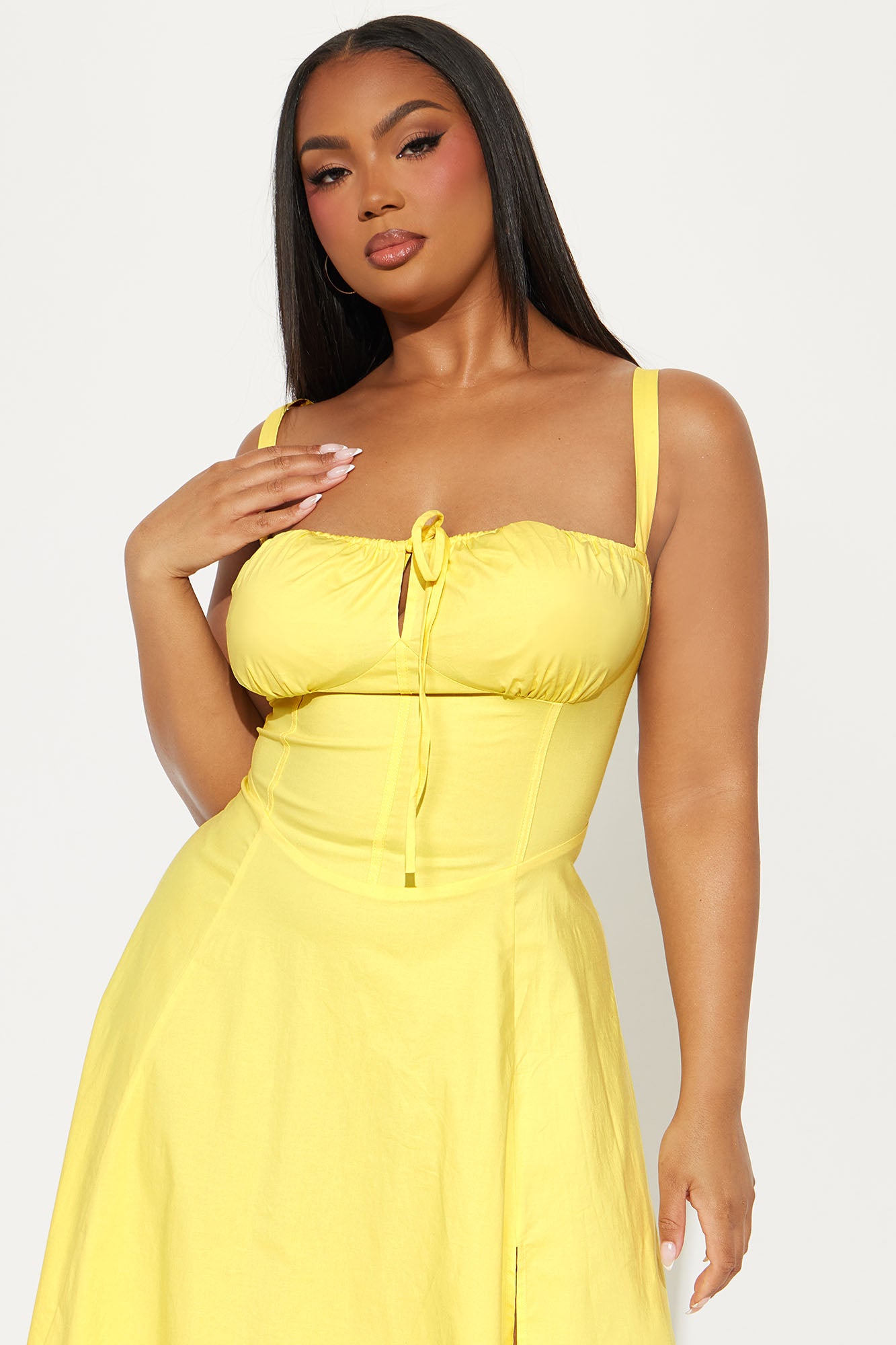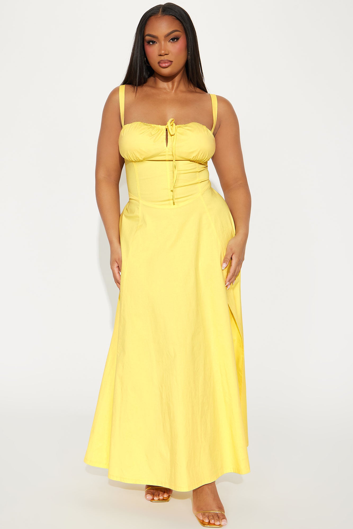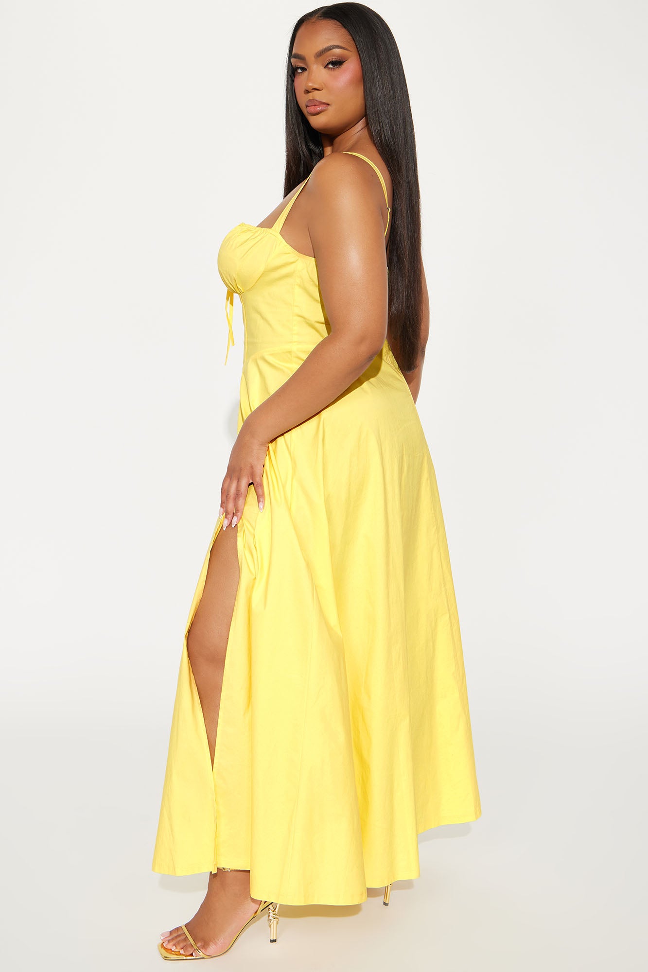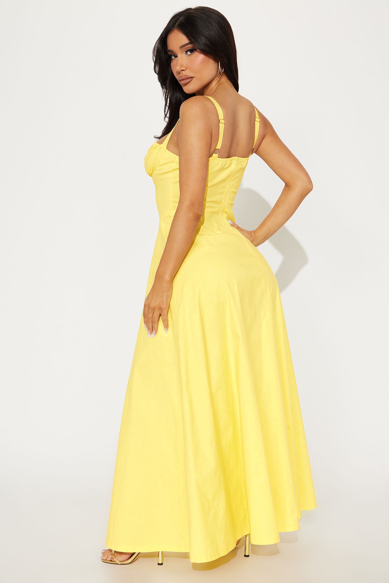 Available In Butter Yellow And Light Blue. Maxi Dress Sweetheart Neckline Sleeveless Bra Cups Drawstring Corset Waist High Slit Back Zipper Non Stretch 97% Cotton 3% Spandex Imported |