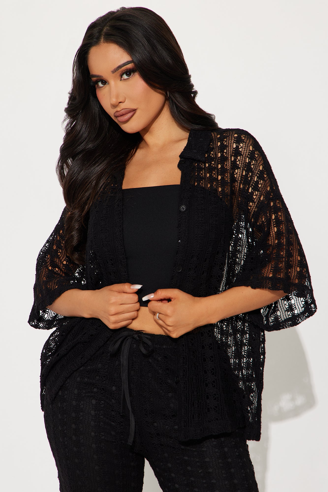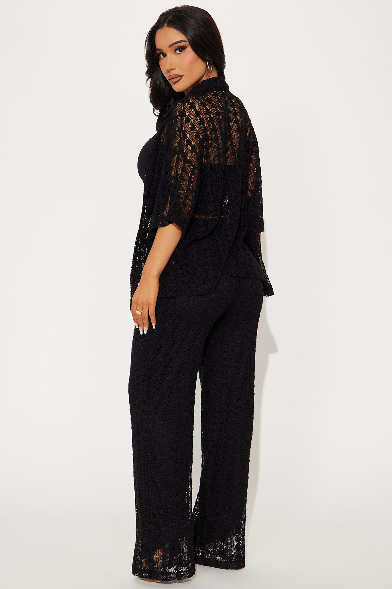 Available In Black, Cream, And Brown. Crochet Button Up Shirt and Pant Set Stretch 32" Inseam Regular Elastic Waistband Lined Self 65% Polyester 35% Cotton Lining 100% Polyester Imported |