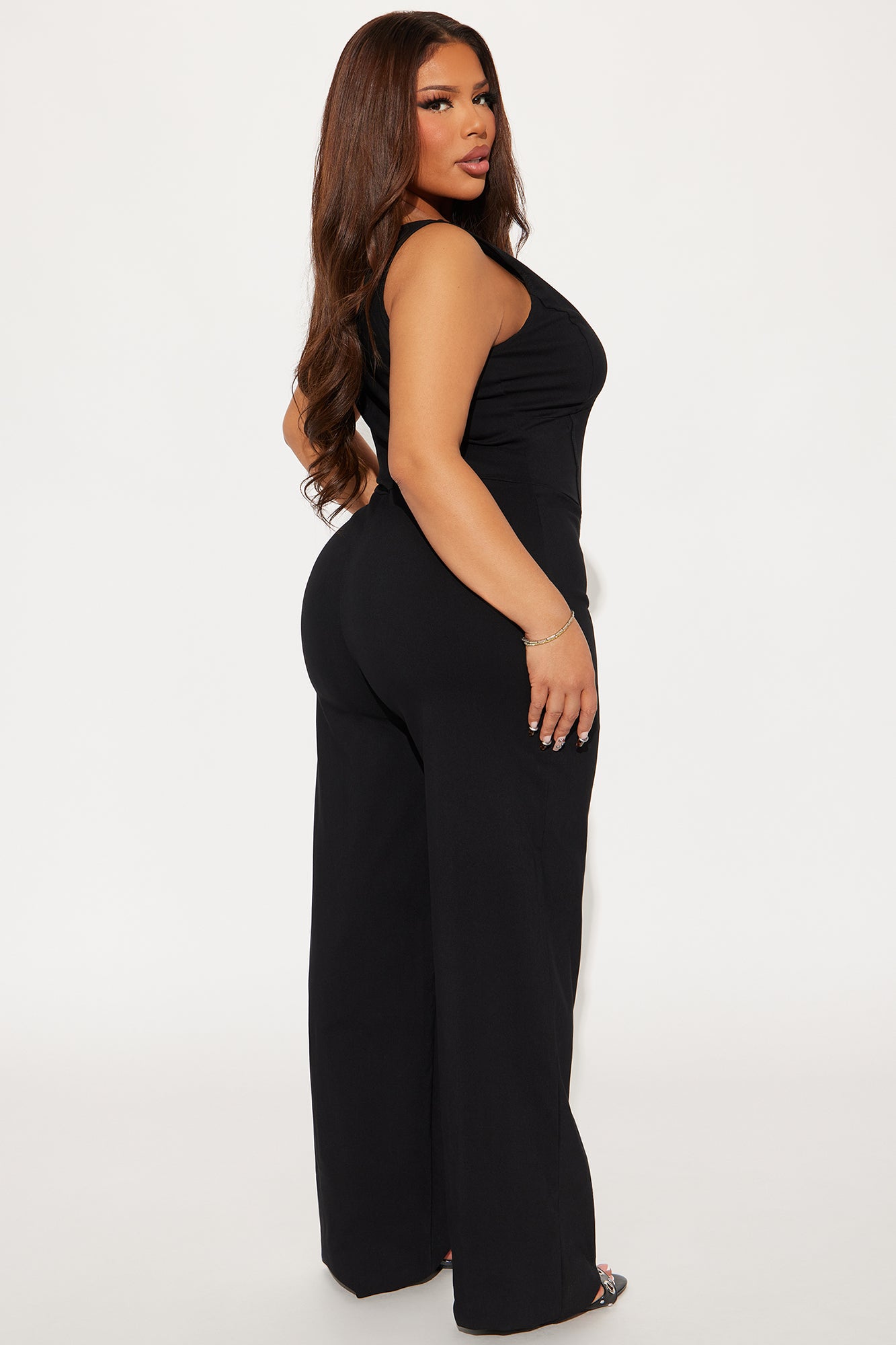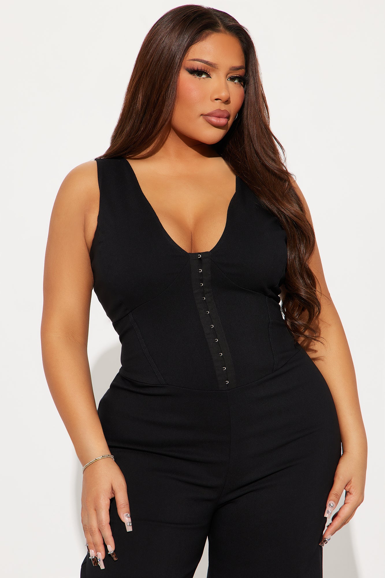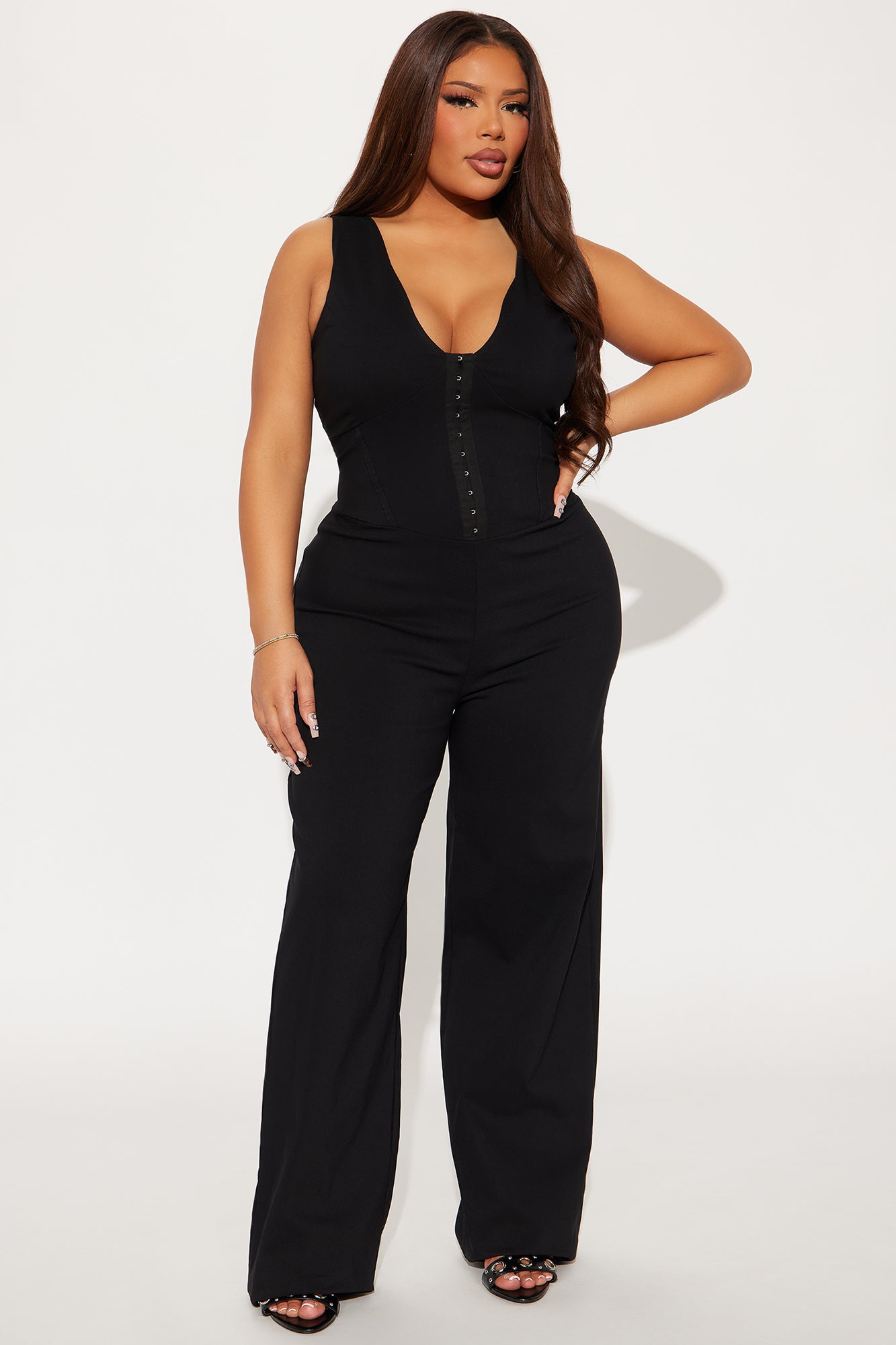 Available In Black And Light Blue. Jumpsuit Hook And Eye Front Closure Straight Leg Stretch Inseam = 34" Self: 74% Rayon 22% Nylon 4% Spandex Imported |