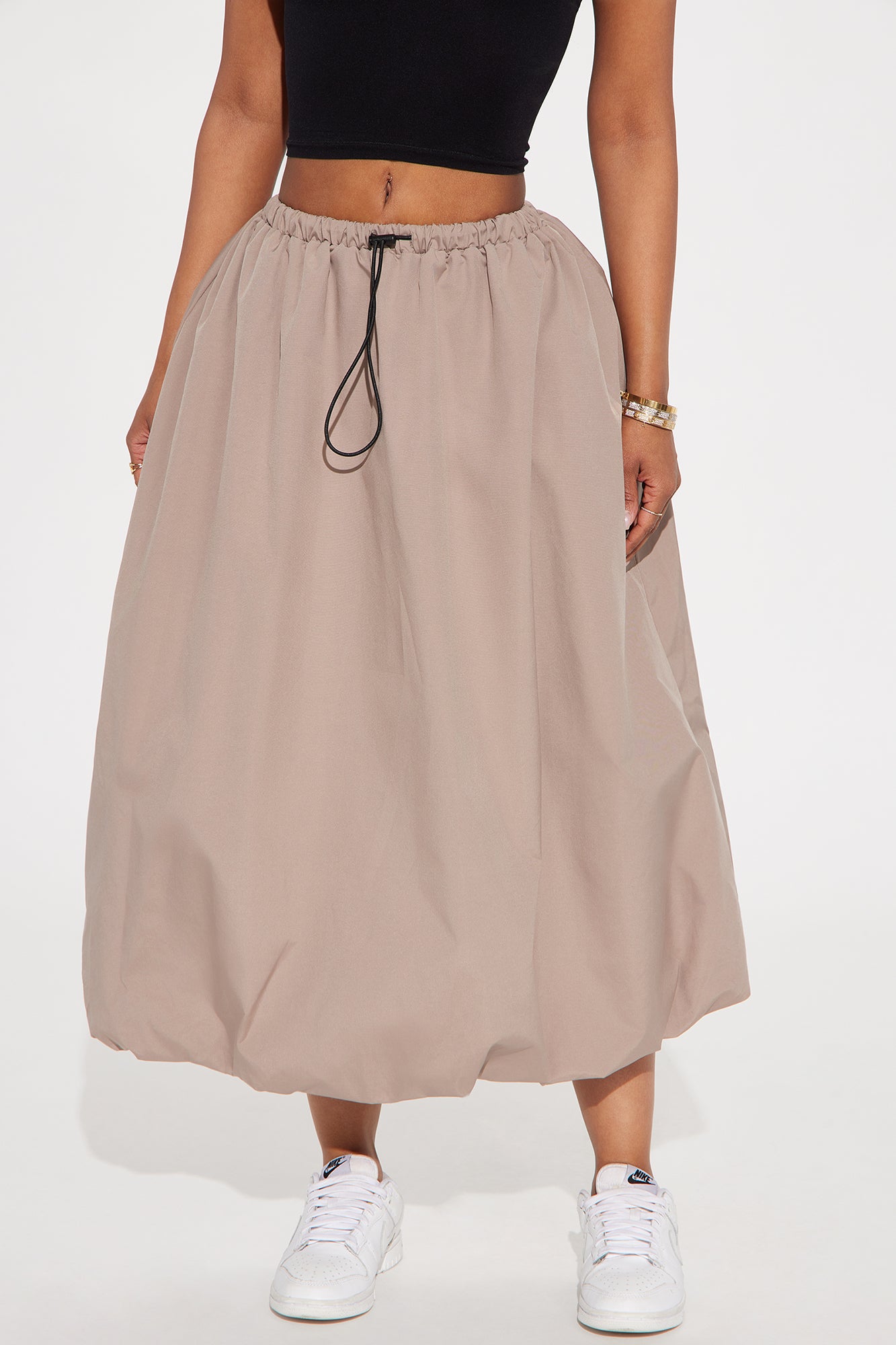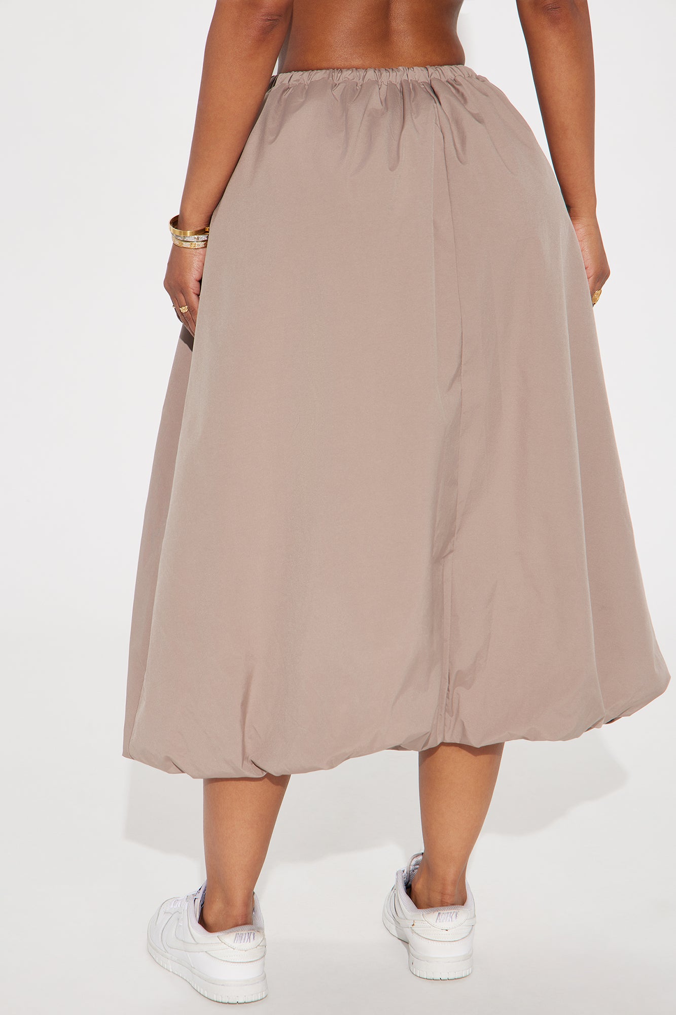 Available In Taupe. Windbreaker Midi Skirt High Rise Elastic Waistband Adjustable Toggle Detail Bubble Hem Non Stretch Self : 100% Polyester Lining: 97% Polyester; 3% Spandex, Imported |