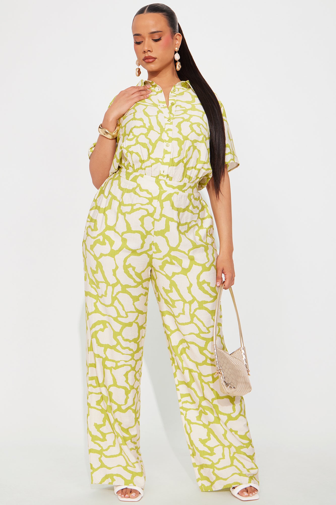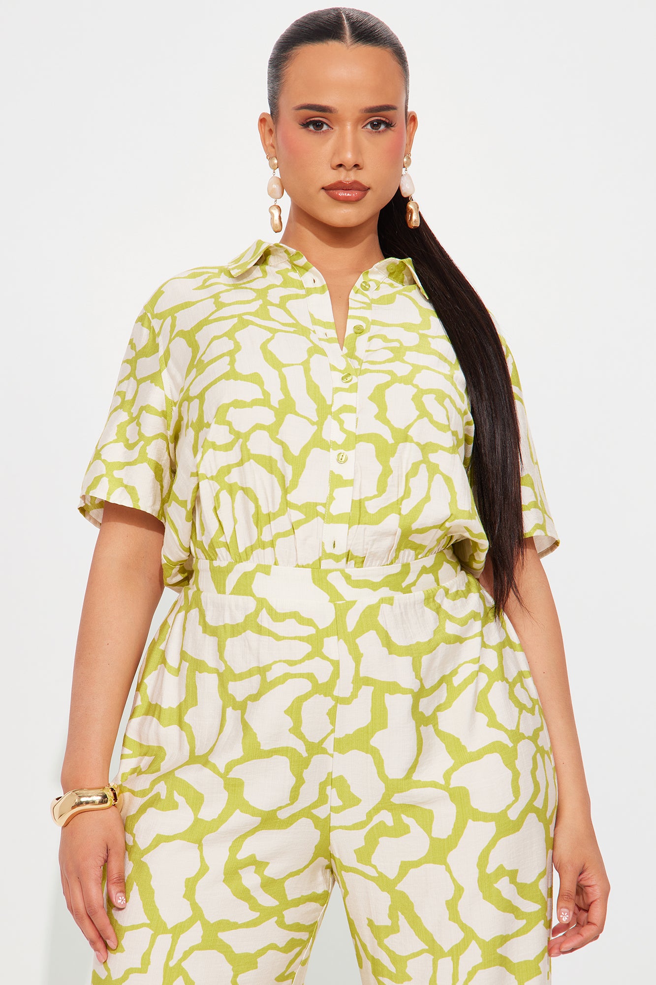 Available In White/Black, Chartreuse, And Taupe. Jumpsuit Button Down Collar Back Elastic Waist Band Short Sleeved 33" inseam Disclaimer Print Placement May Vary 90% Rayon 10% Nylon Imported |