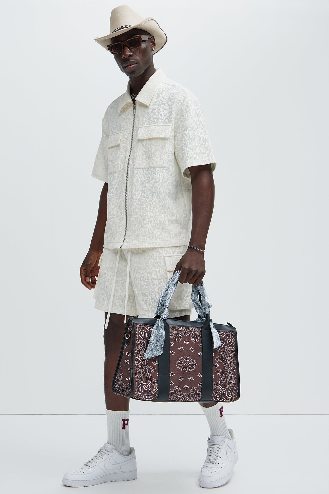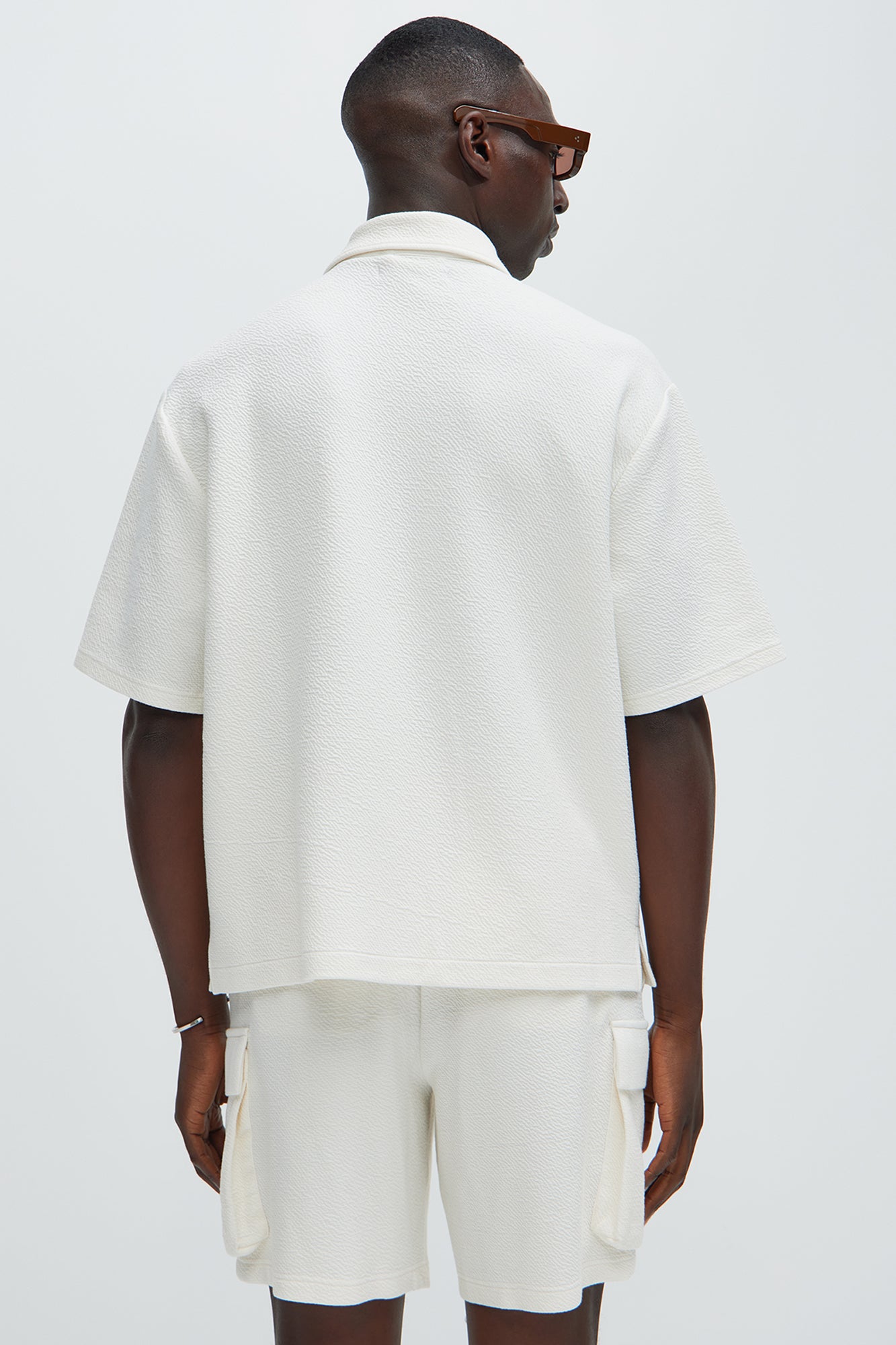 Available In Cream. Fold Down Collar Front Zipper Closure Chest Pockets Bottom Side Slit Pair With "Lewis Relaxed Shorts" 69% Polyester 28% Cotton 3% Spandex Imported |