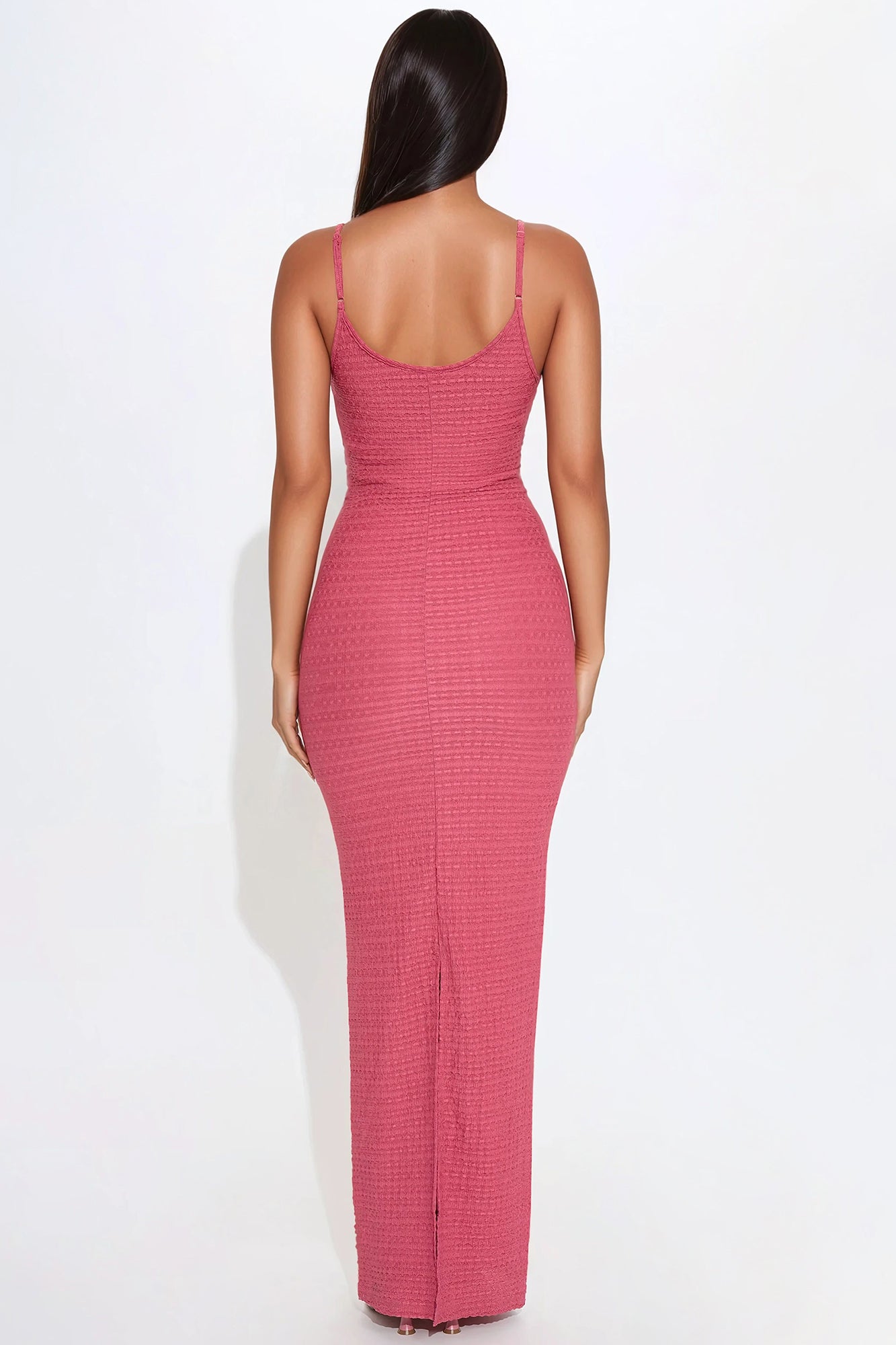 Available In Blue And Mauve. Textured Maxi Dress Adjustable Spaghetti Straps Double Scoop Neck Back Slit Lined Stretch Self: 95% Polyester 5% Spandex Lining: 100% Polyester Imported |