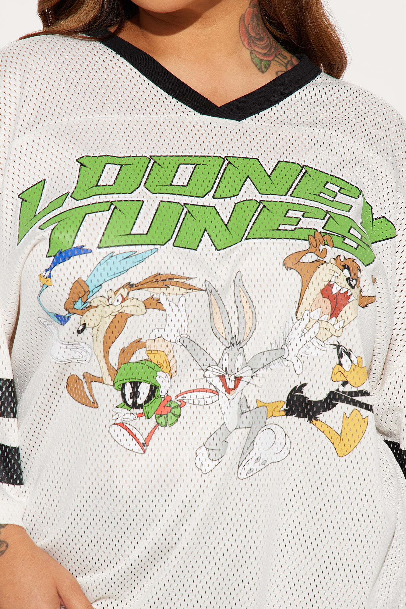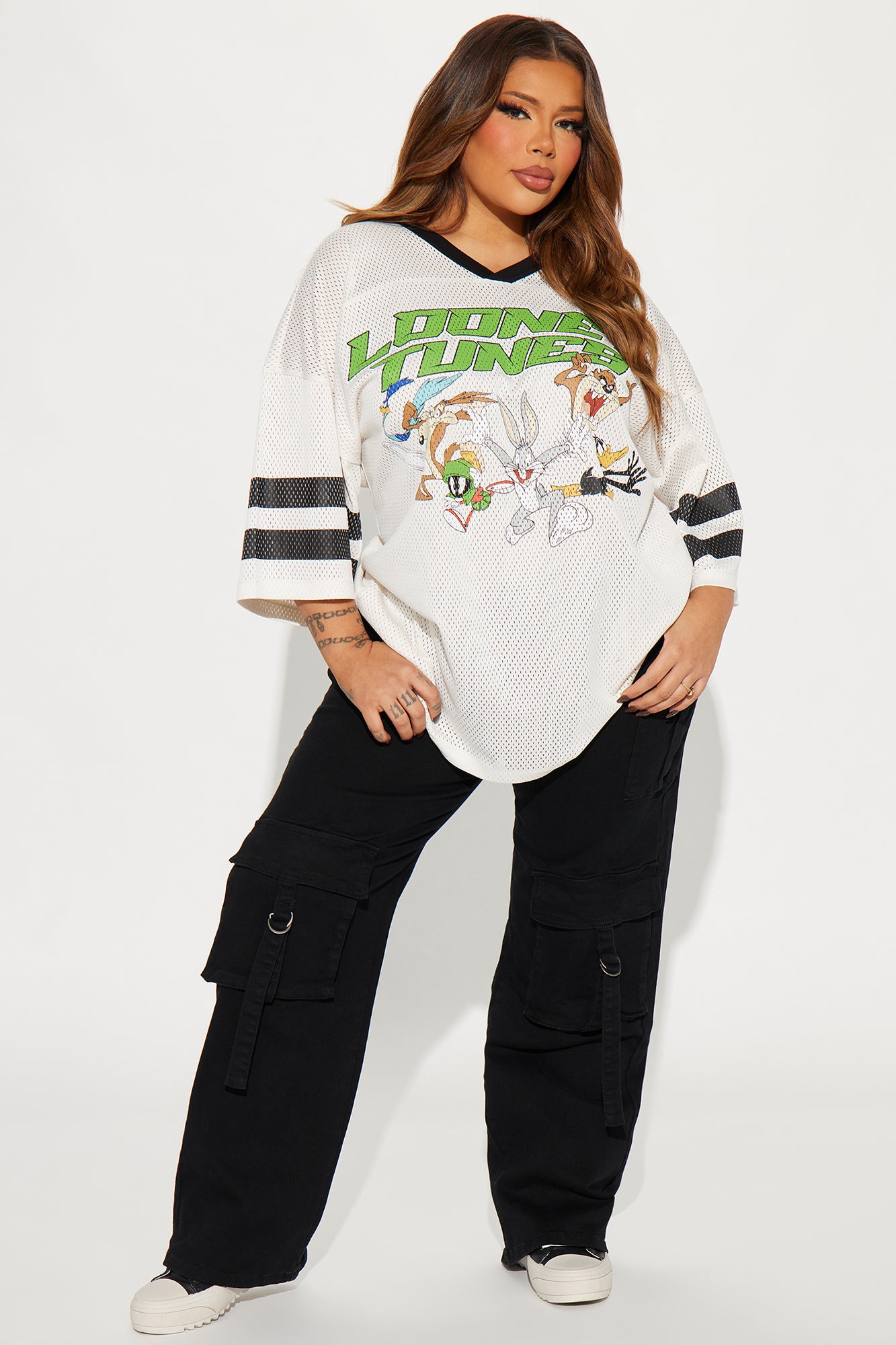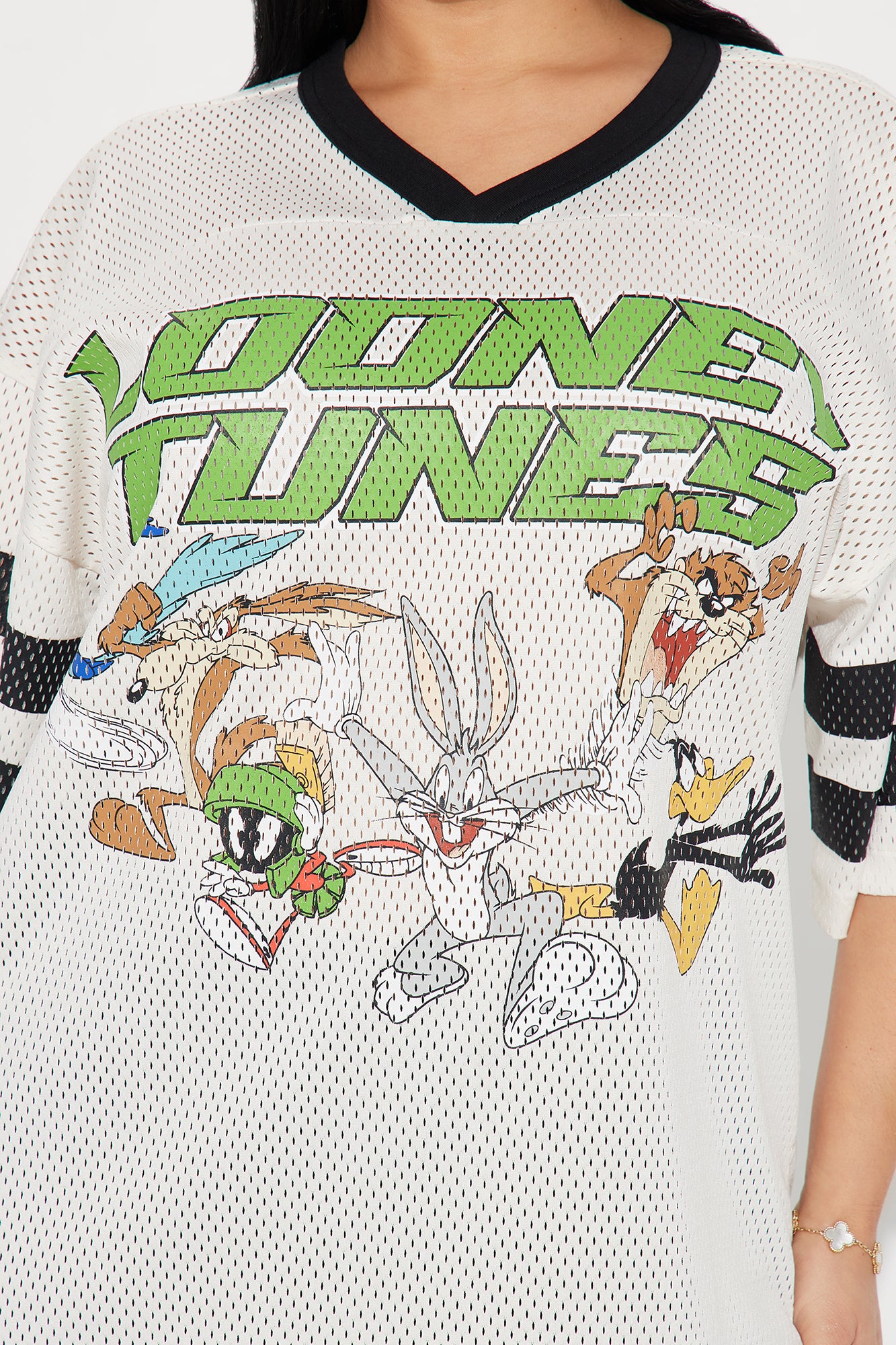 Available In Beige. V-Neck Short Sleeve Loose Fit Looney Tunes Graphic Jersey Mesh Disclaimer: Due To The Specialized Screen Printing Process A Difference In Saturation May Occur. Each Garment Is Unique. 100% Polyester Imported |
