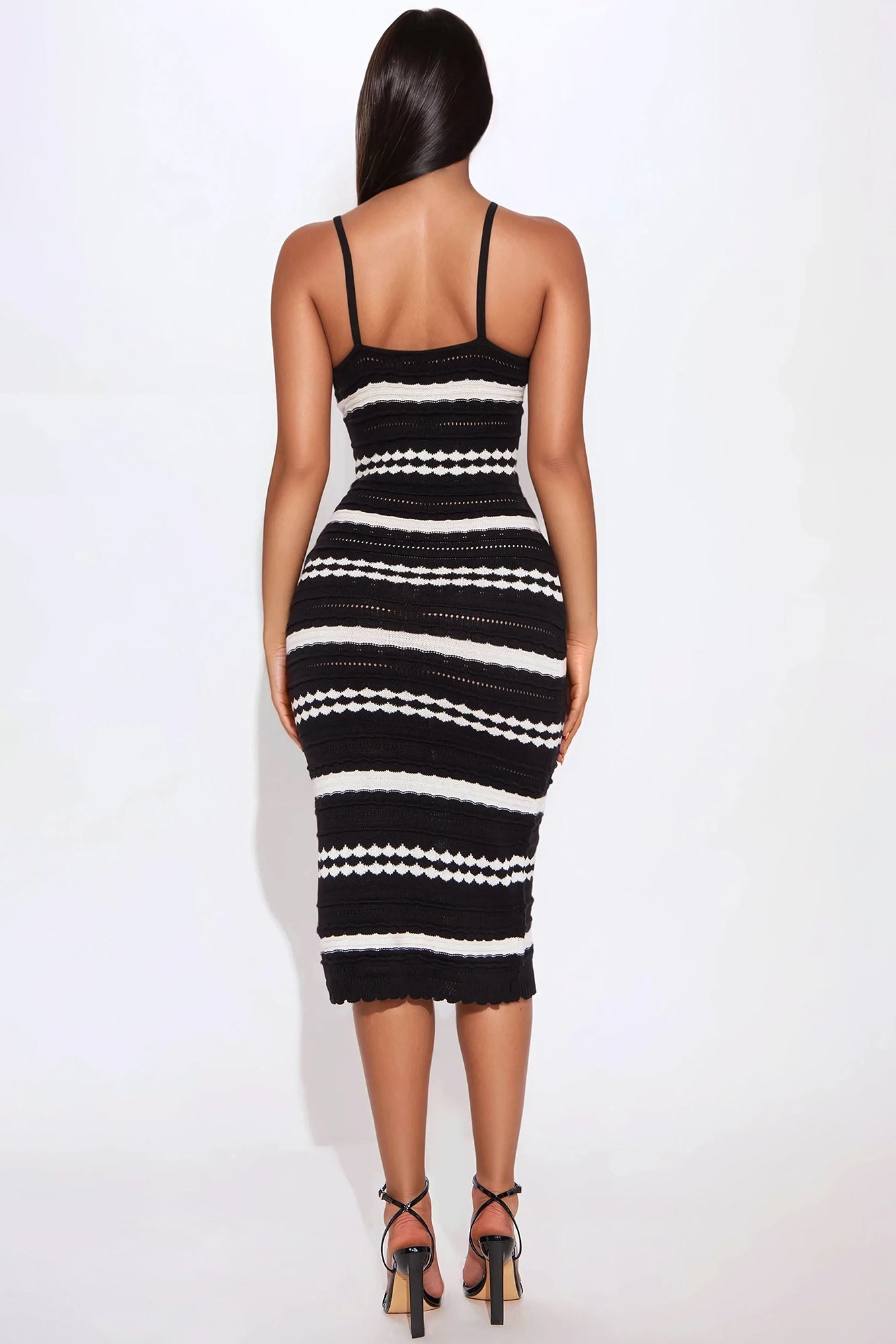 Available In Black/combo And Ivory/combo. Striped Crochet Midi Dress V-neck Spaghetti strap Keyhole Slight stretch Disclaimer Pattern Placement May Vary 100% Acrylic Imported |