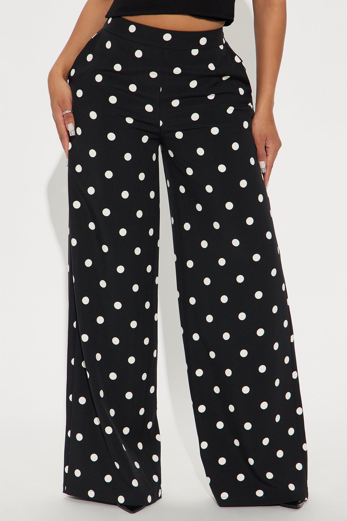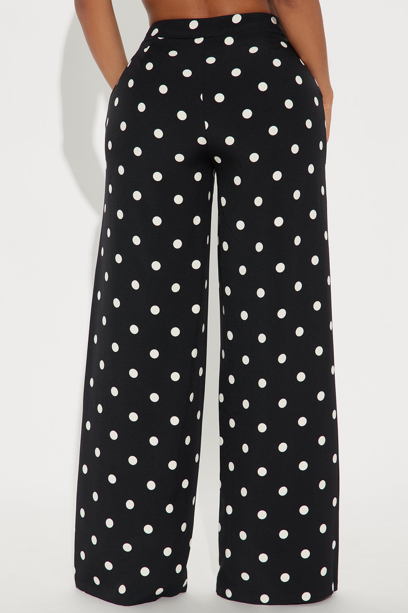 Available In Cream/combo And Black/White. Trouser Pant High Rise Hook & Eye Closure Side Zip Polka Dot Wide Leg Non Stretch 32" Inseam Disclaimer: Print Placement Will Vary Self 97 % Polyester 3% Spandex Lining 100% Polyester Imported |