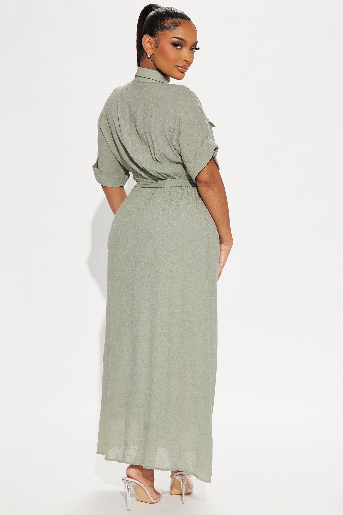 Available In Sage And Taupe. Maxi Dress Short Sleeve Collar Button Front Pockets Tie Waist Elastic Waistband Half Lined Self: 100% Polyester Lining: 100% Polyester Imported |