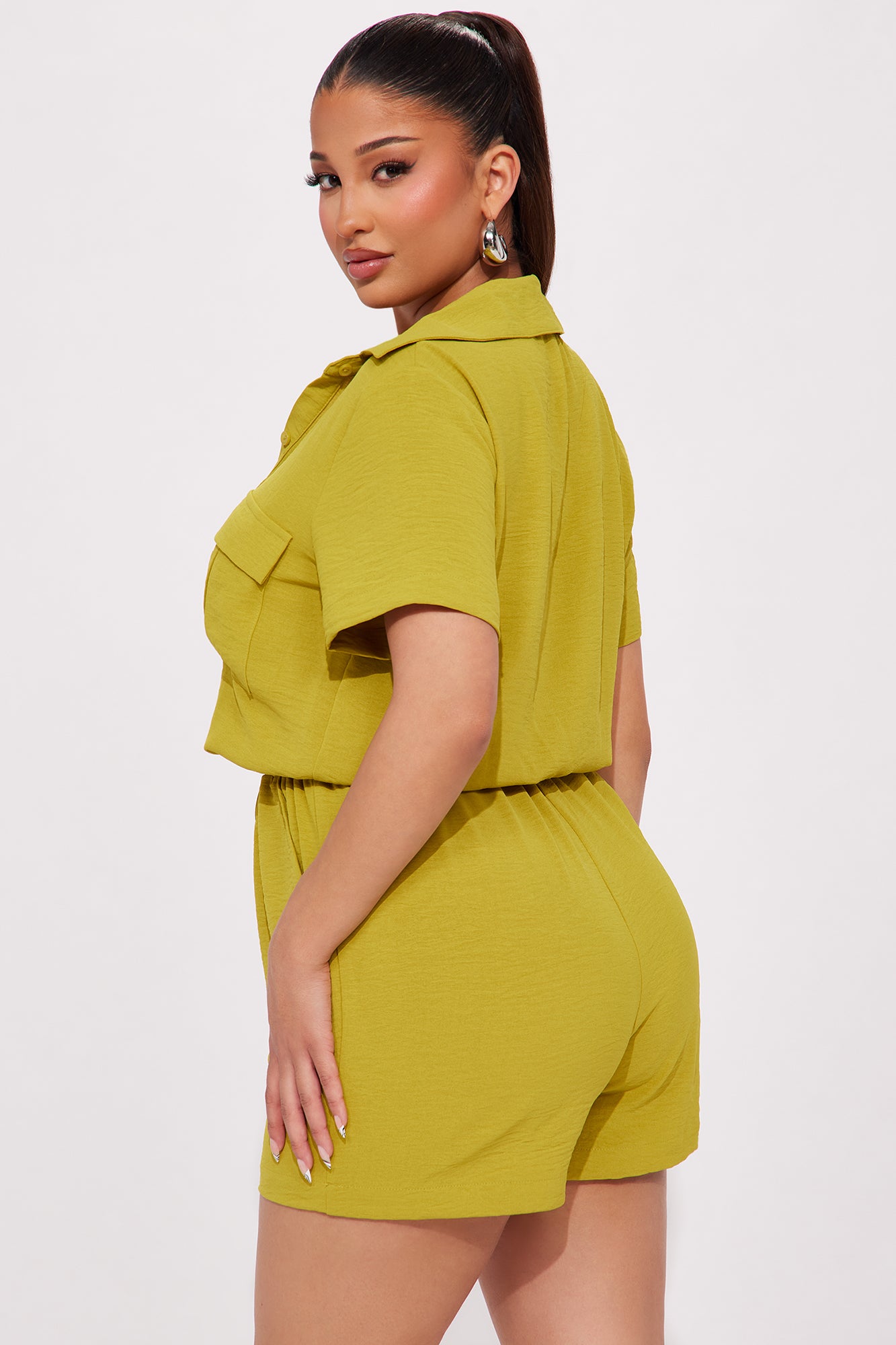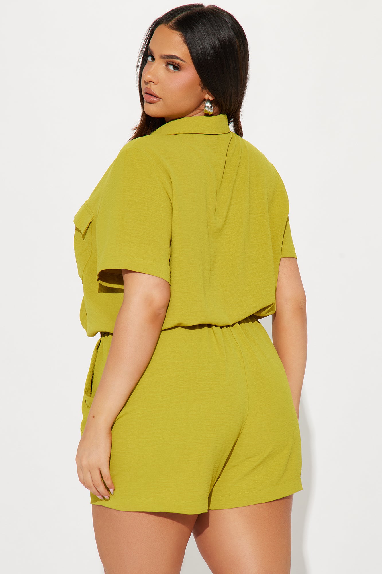 Available In Chartreuse, Orange, And Chocolate. Romper Collar Short Sleeve Button Up Drawstring Short 100% Polyester Imported |