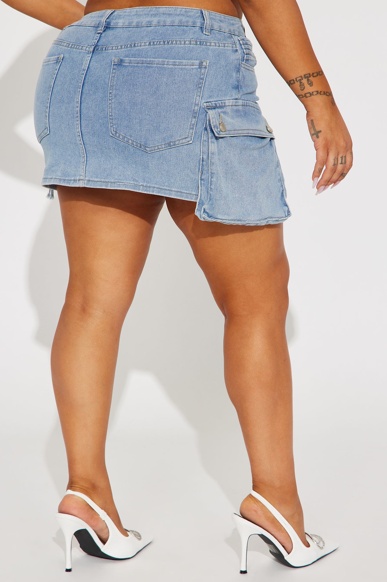Available In Light Wash. Cargo Mini Skirt High Rise Button & Zipper Closure Front & Back Hand Pockets Denim Stretch Disclaimer: Due To The Specialized Wash Process, Each Garment Is Unique. 70% Cotton 28% Polyester2% Spandex Imported |