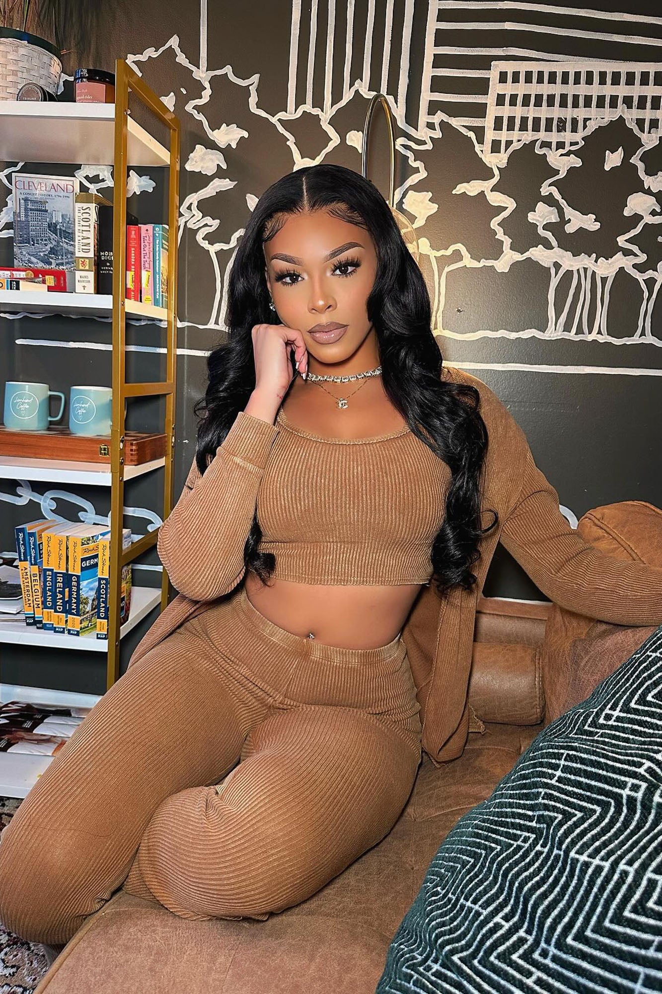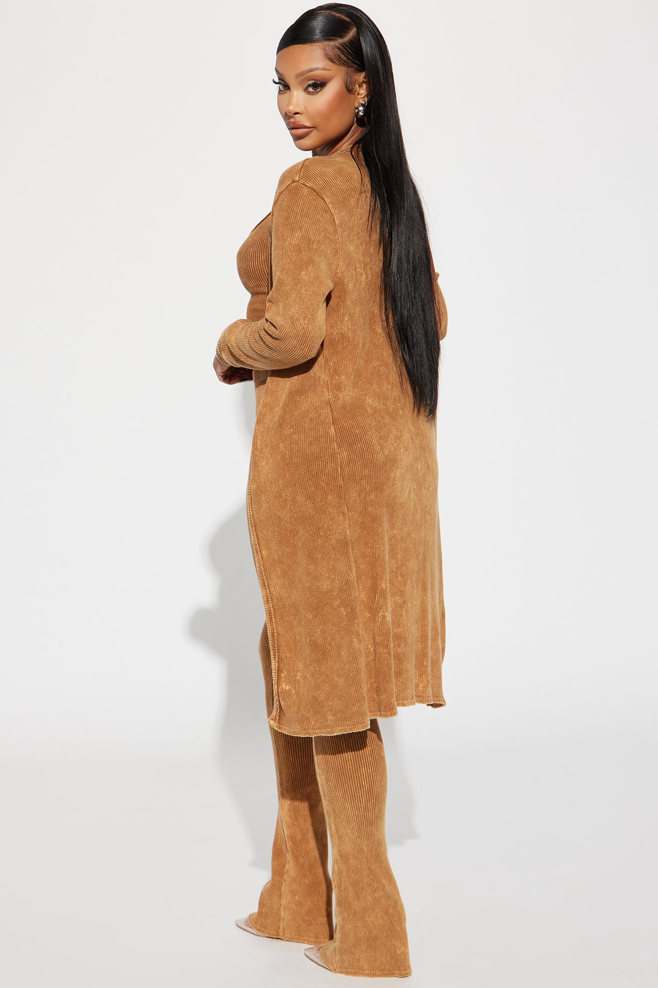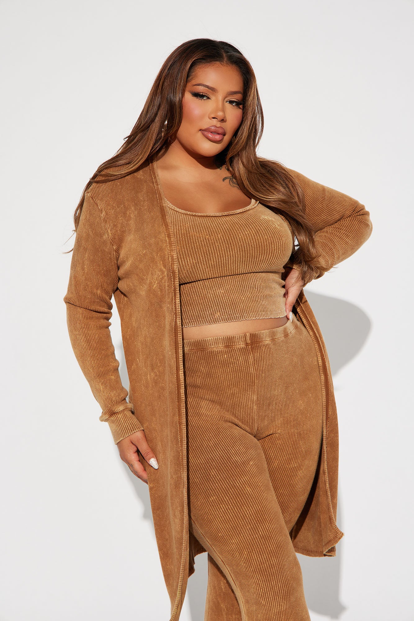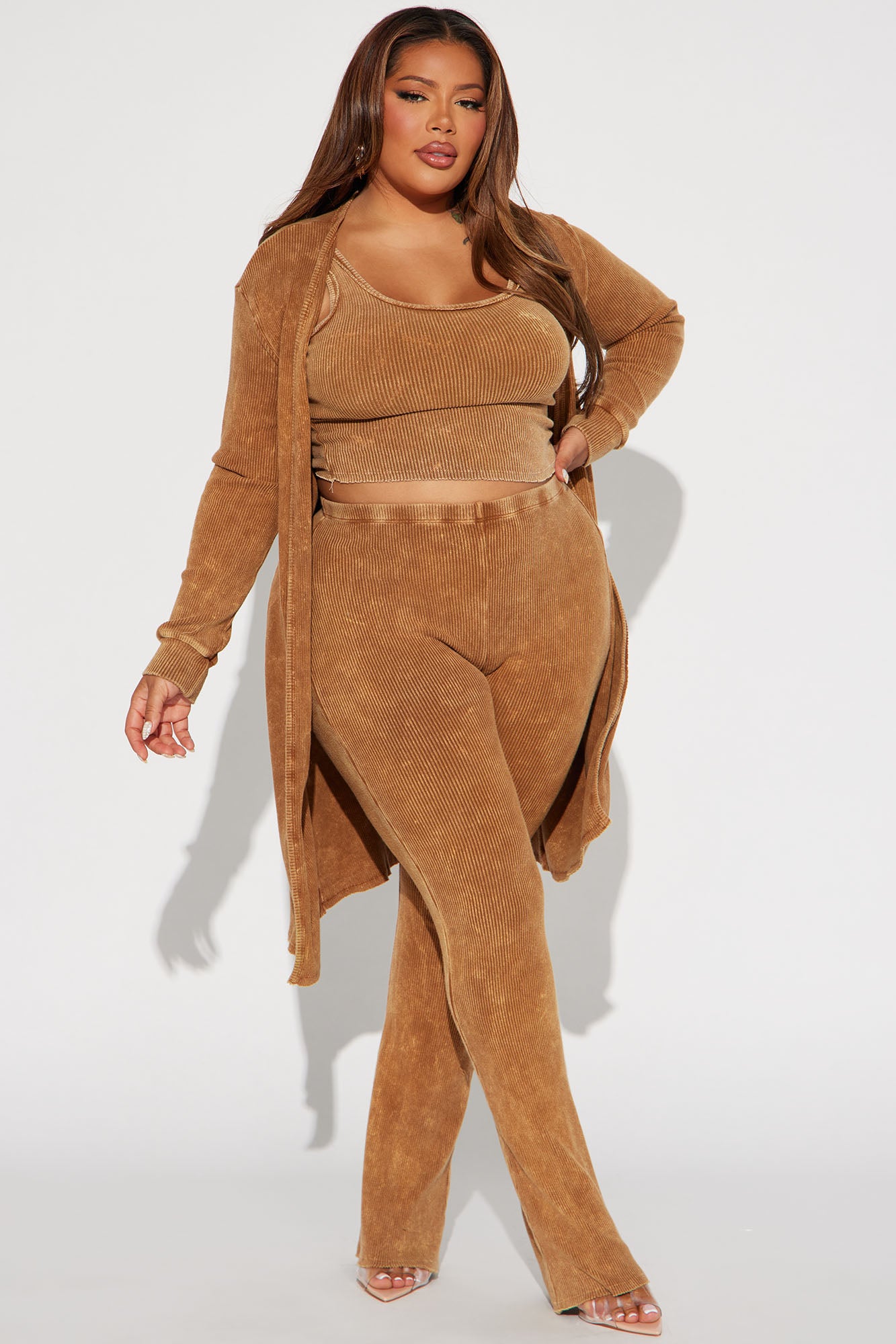 Available In Mocha. 3 Piece Set Cardigan Tank Top Straight Leg Elastic Waistband Stretch Disclaimer: Due To The Wash Process Each Garment Is Unique. 94% Cotton 6% Spandex Imported  |
