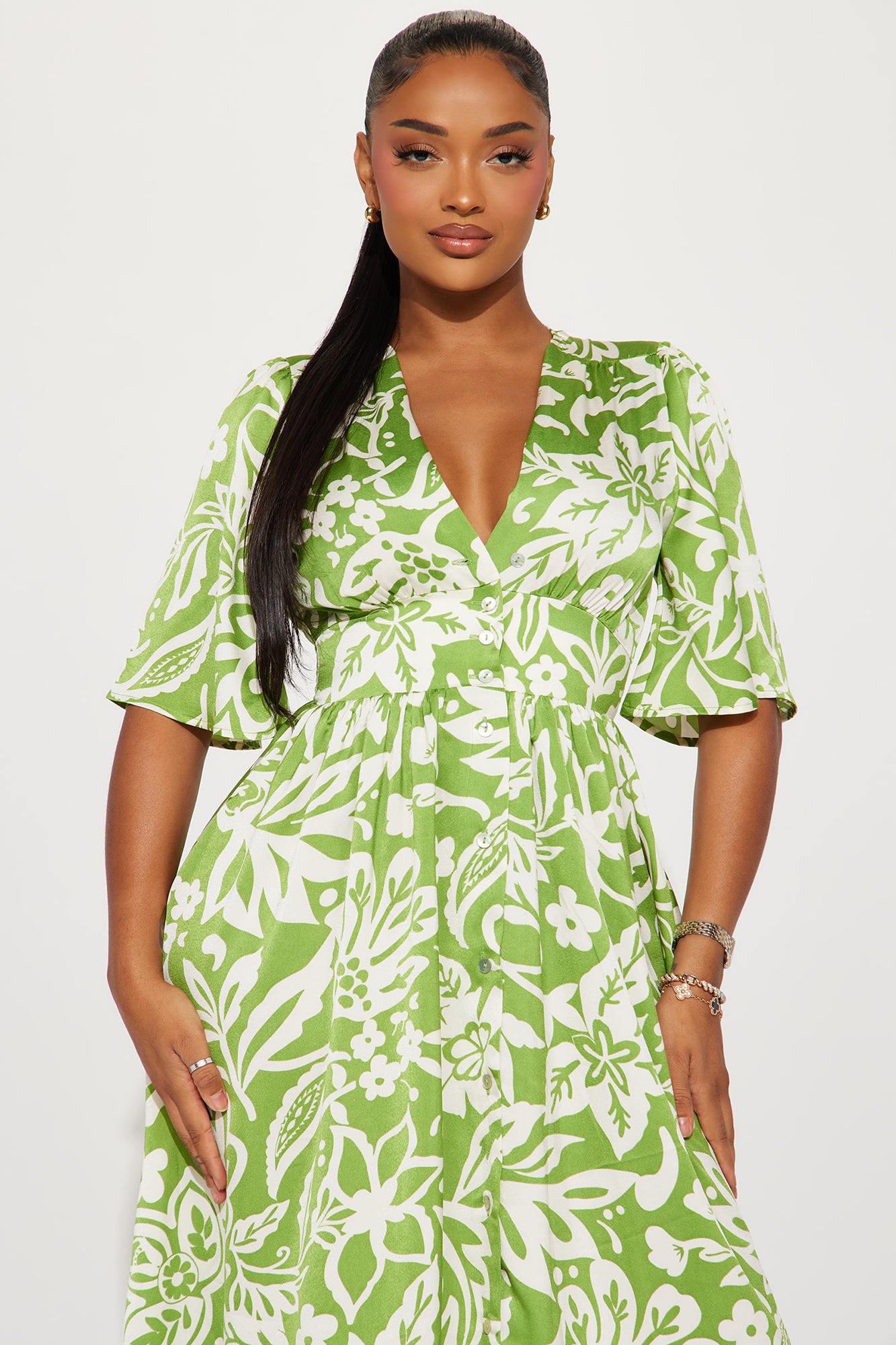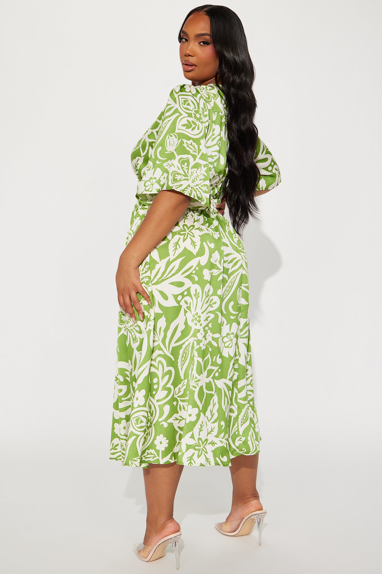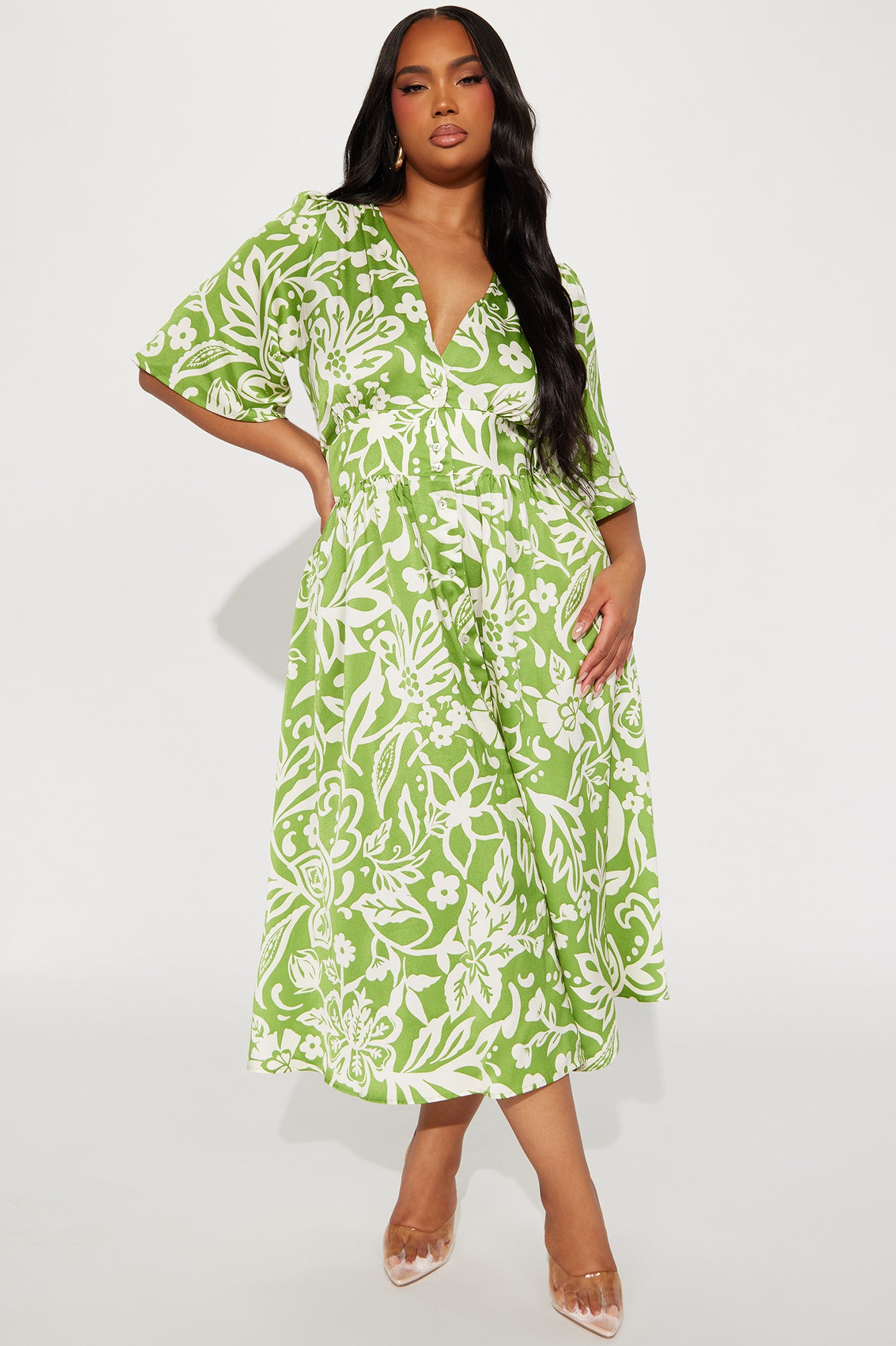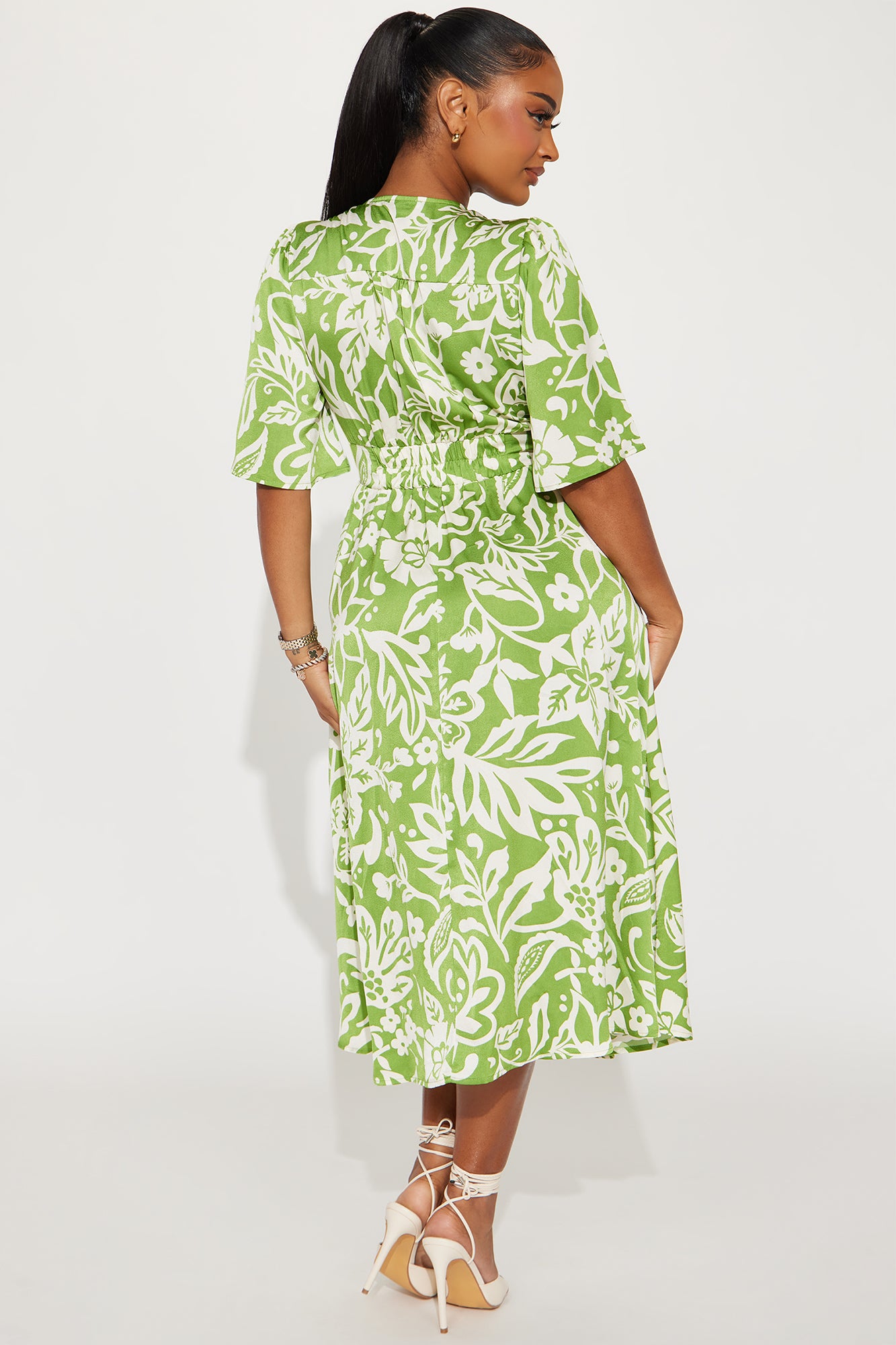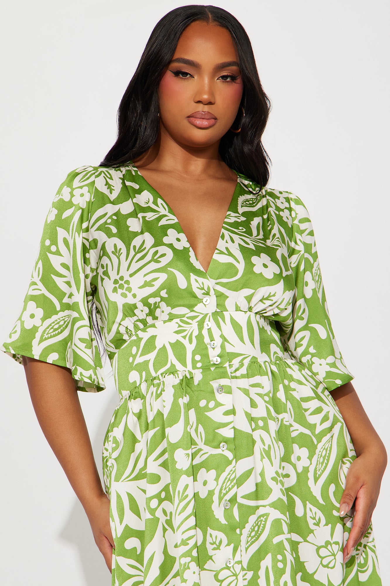 Available In Black And Green. Satin Midi Dress Short Sleeve V-Neckline Button Up Elastic Back Ruffle Hem Disclaimer Pattern Placement May Vary Self: 100% Polyester Imported |