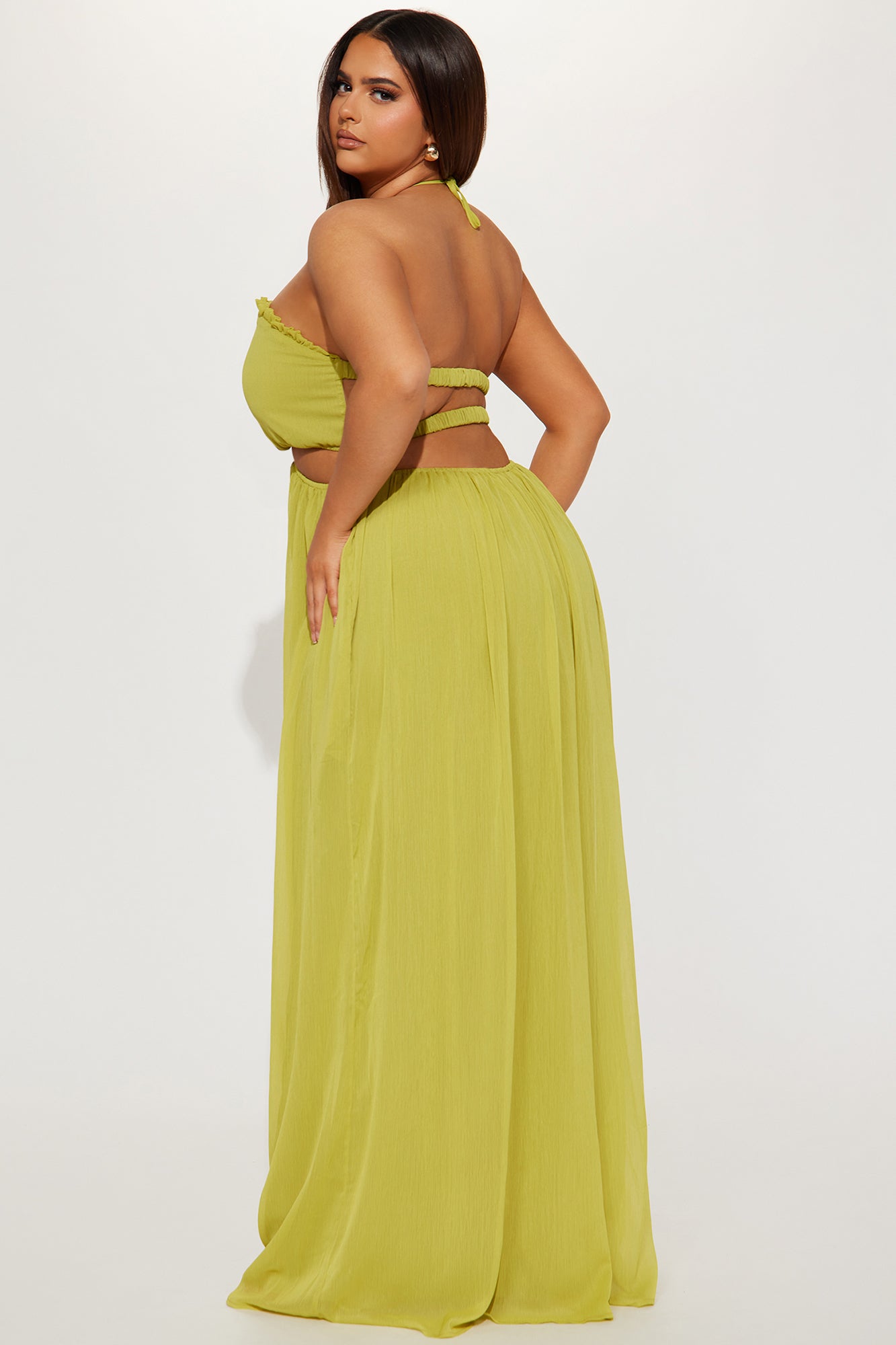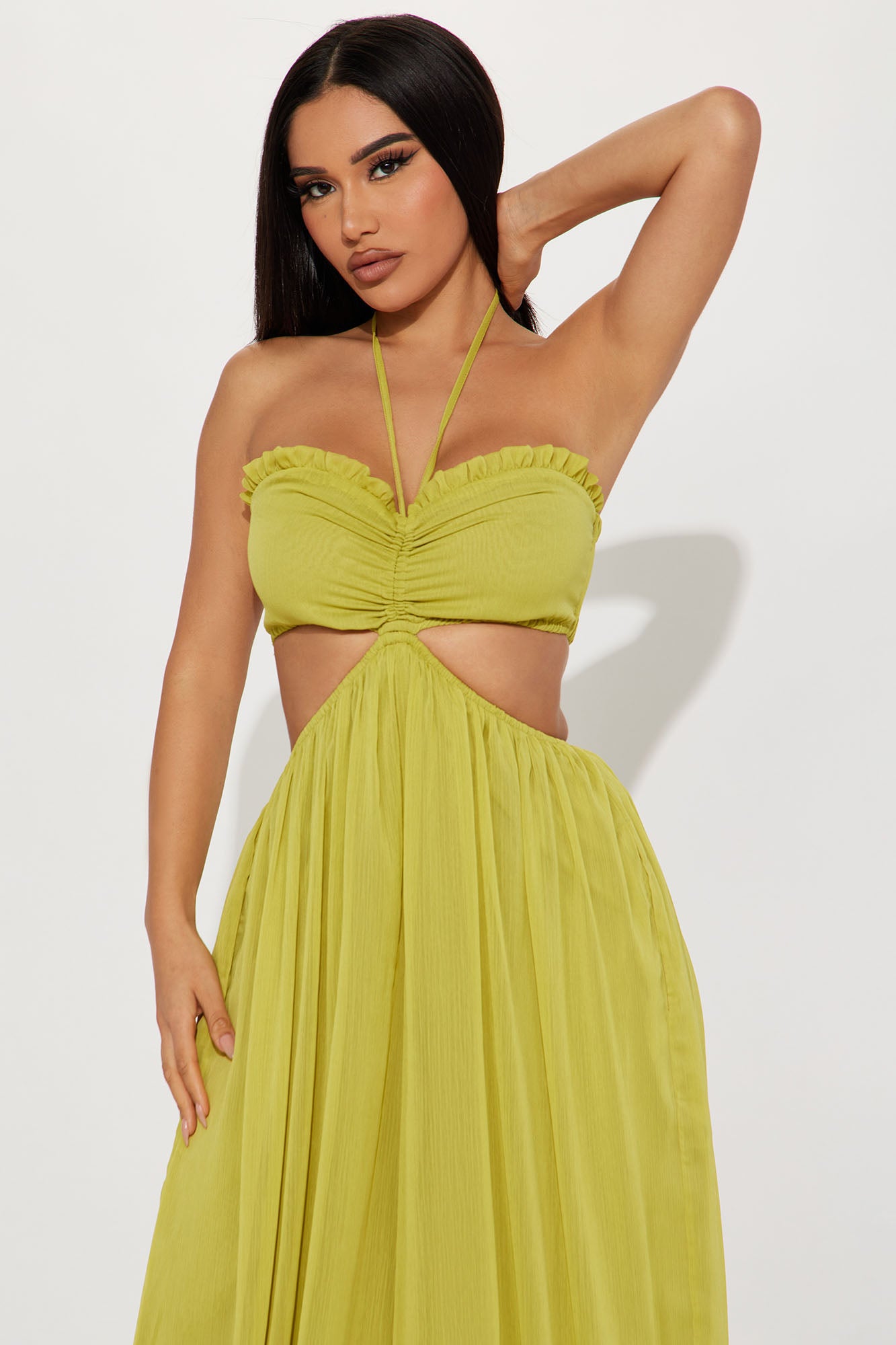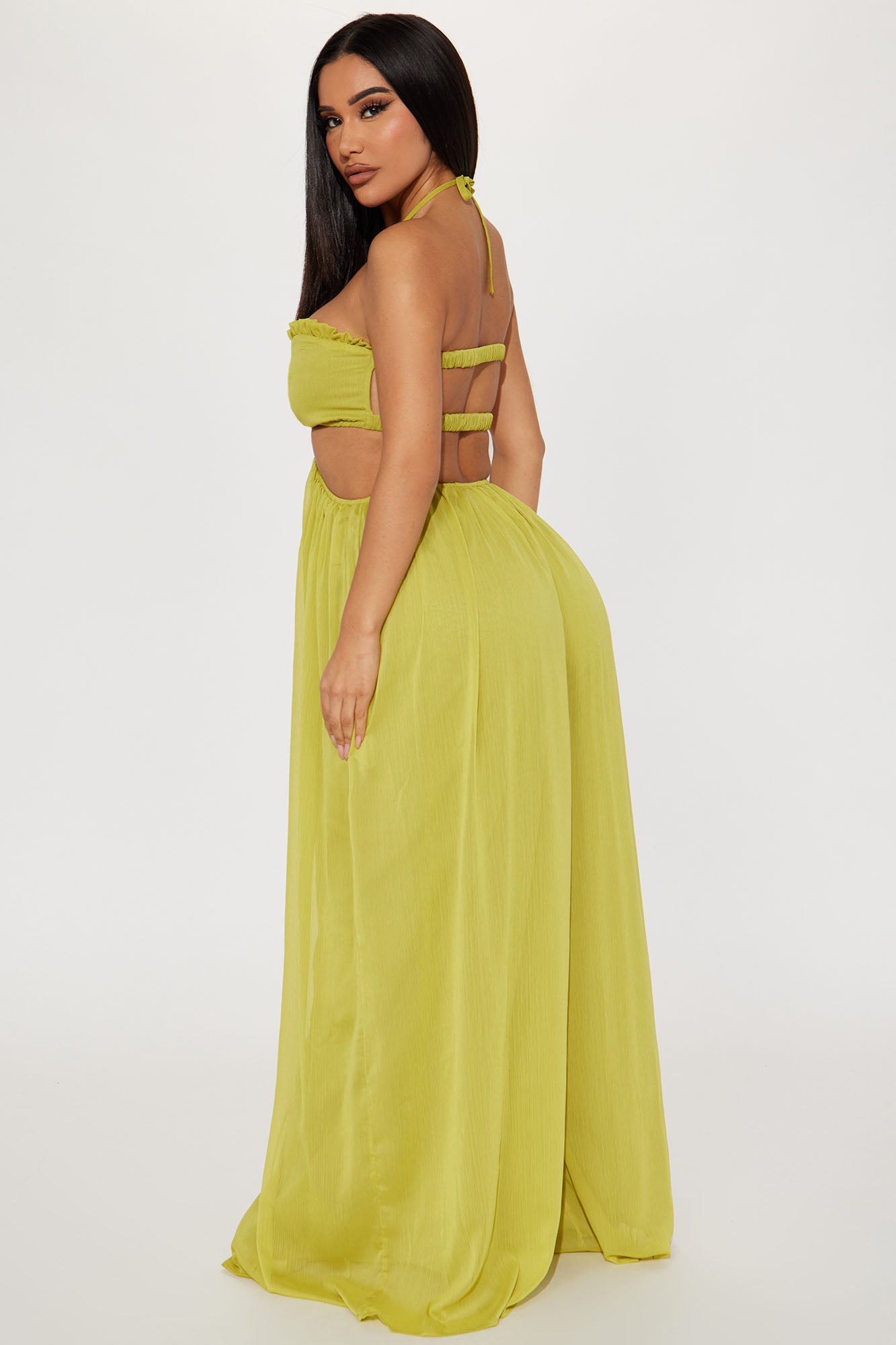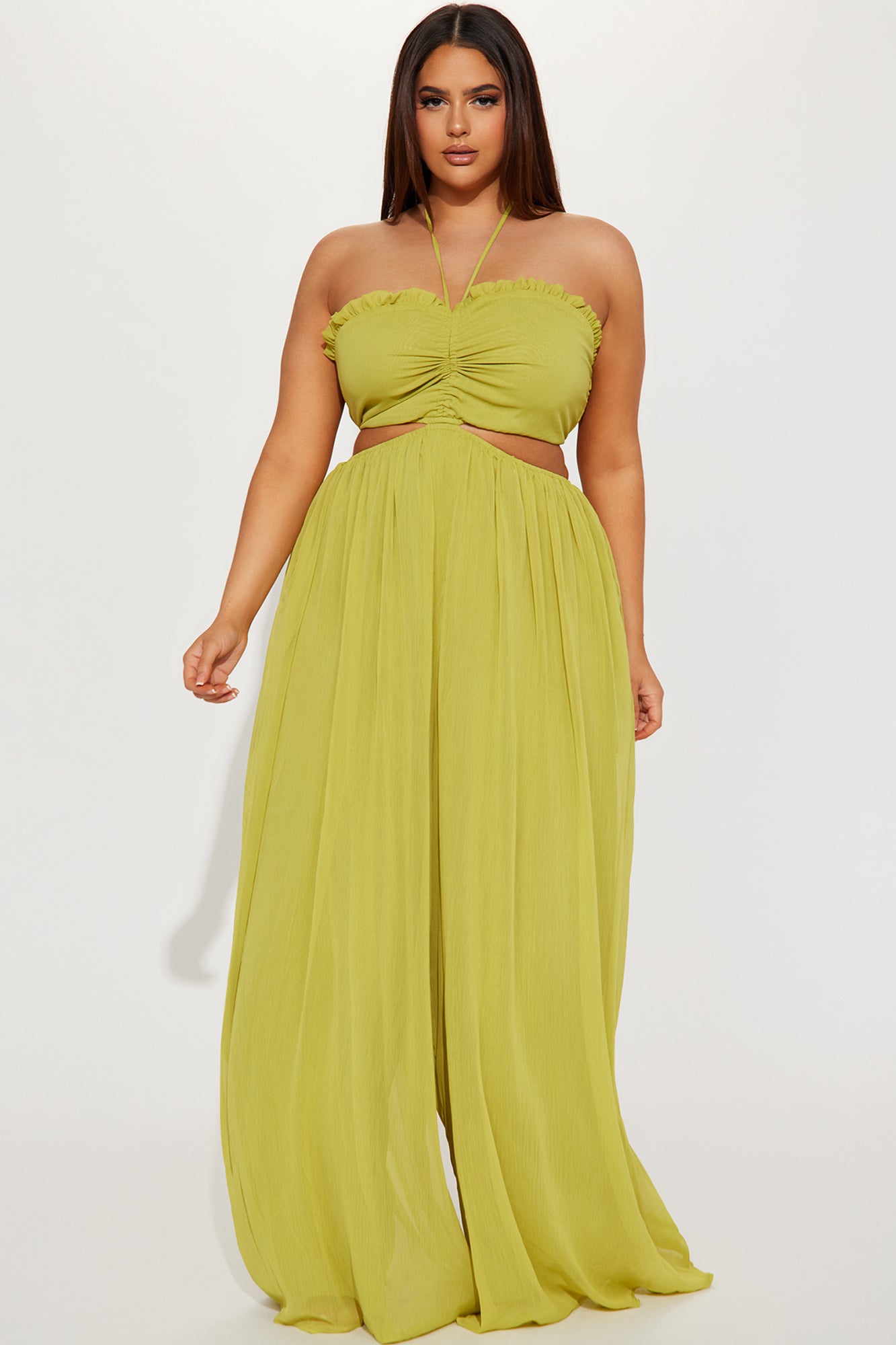 Available In Chartreuse And Off White. Jumpsuit Halter Sweetheart Neckline Cut Out Ruching Detail Wide Leg 100% Polyester Imported |