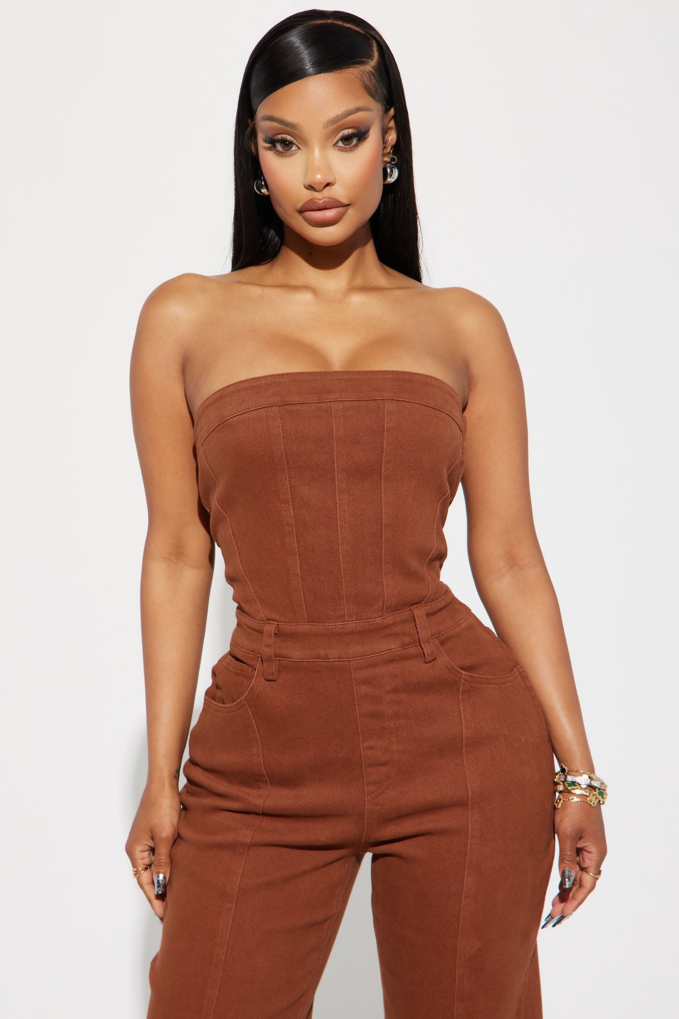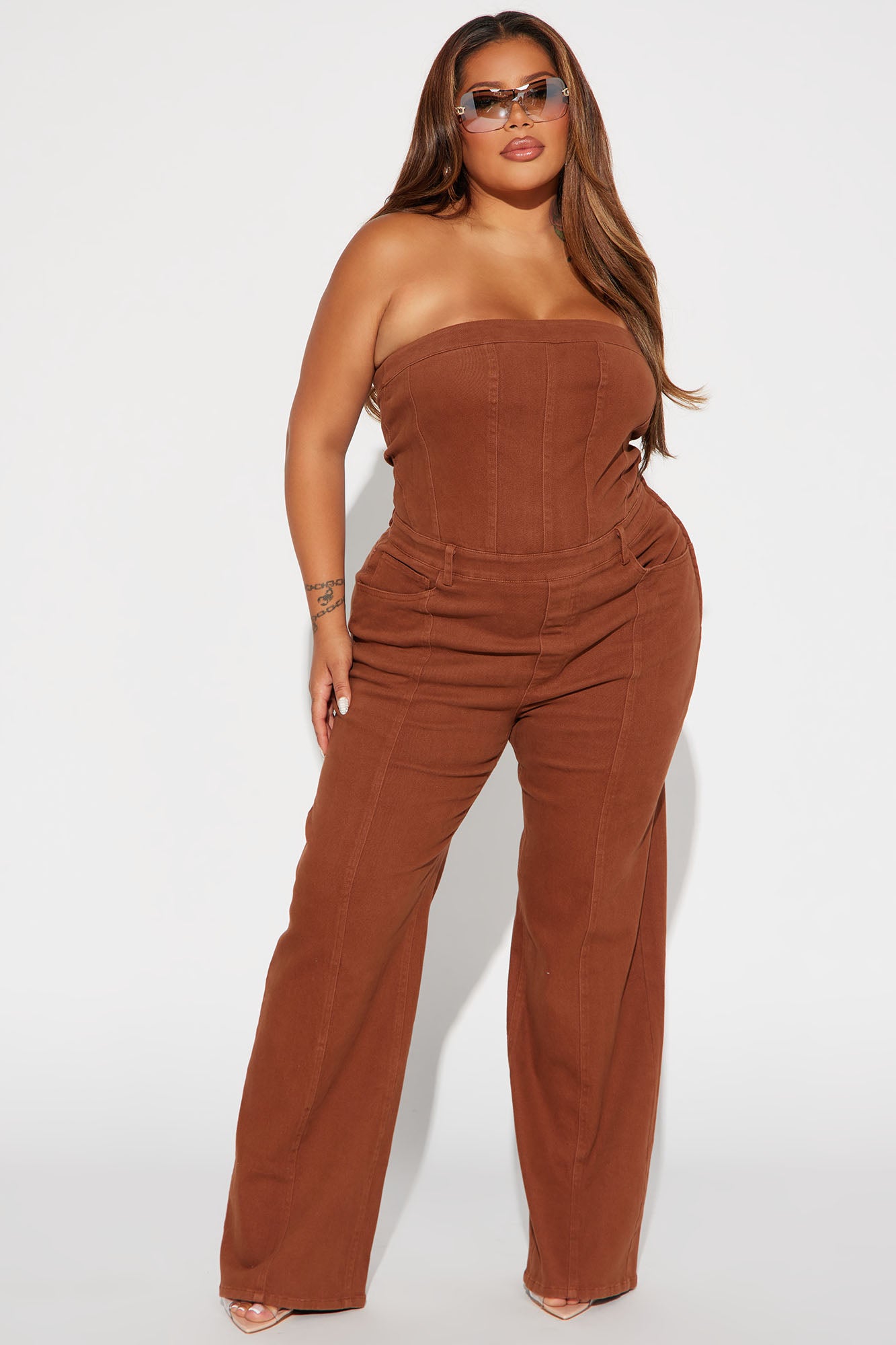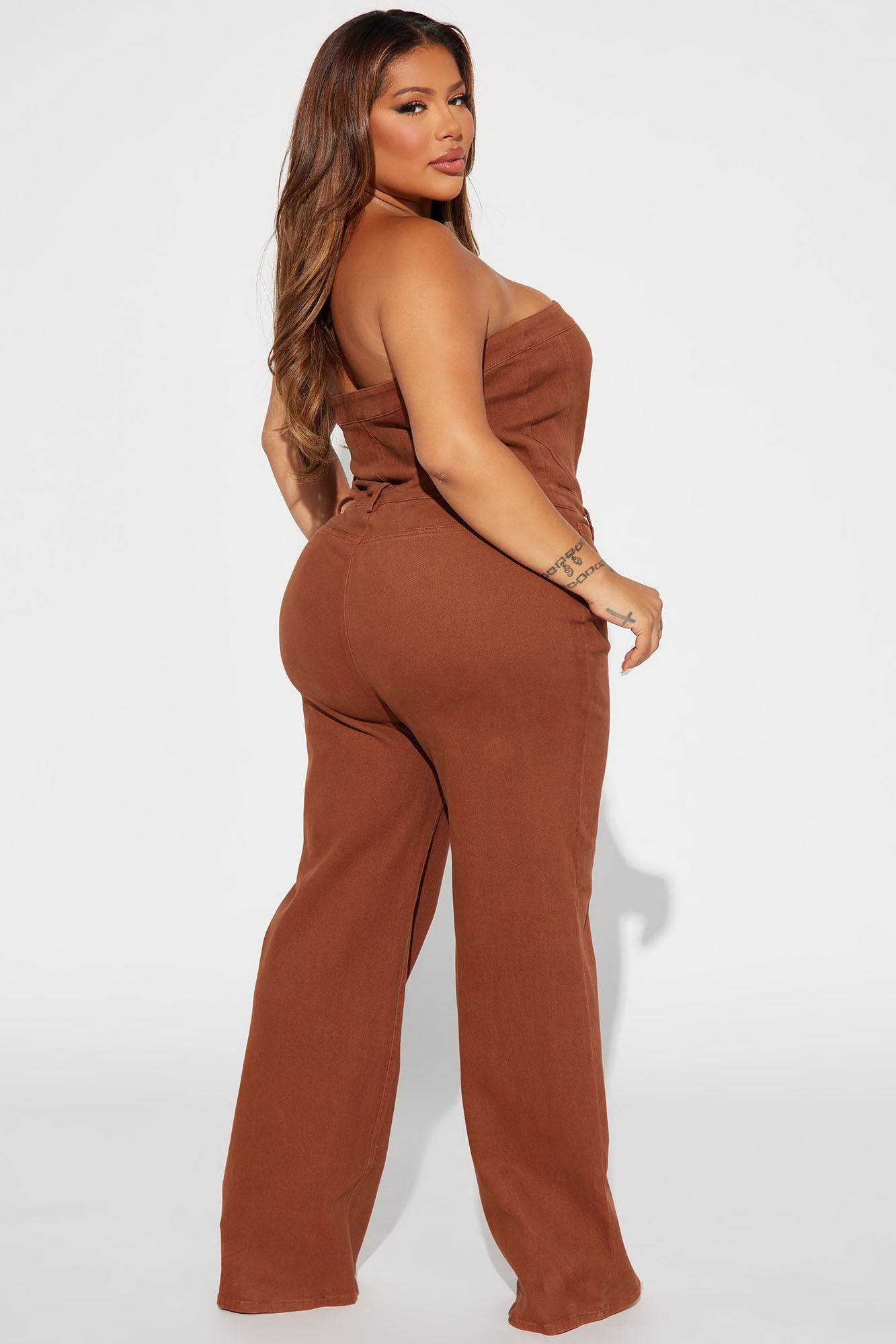 Available In Cognac. Jumpsuit Tube Hidden Side Zipper Pockets Wide Leg Inseam= 32" Disclaimer: Due To The Specialized Wash Process, Each Garment Is Unique. Self / Lining 97% Cotton 3% Spandex Imported |
