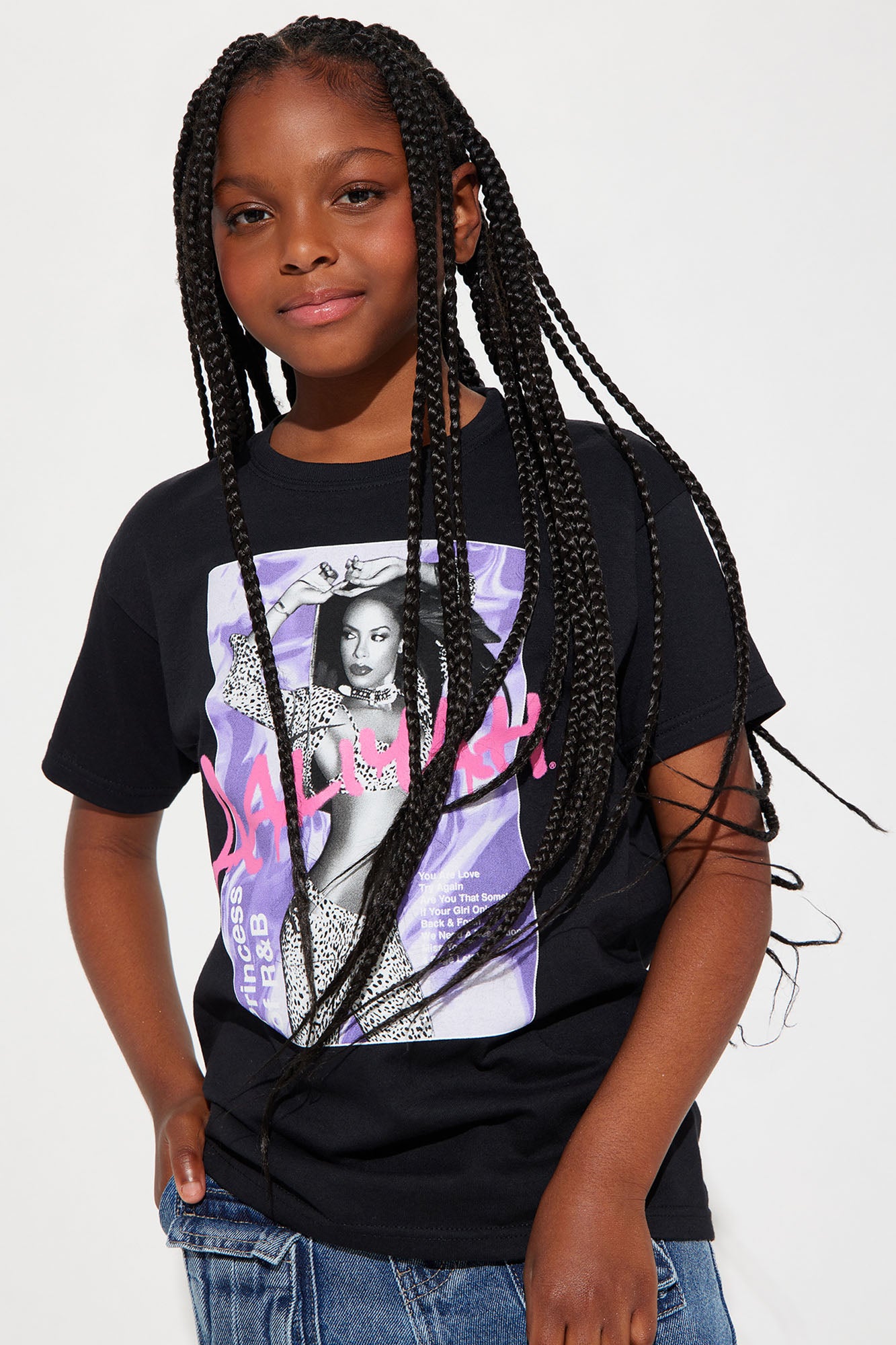 Available In Black. Short Sleeve Crew Neckline Aaliyah Graphic Screen Top License Model Wears Size 10/12 Disclaimer: Due To The Printing Process A Difference In Saturation May Occur. Each Garment Is Unique. 100% Cotton Imported |