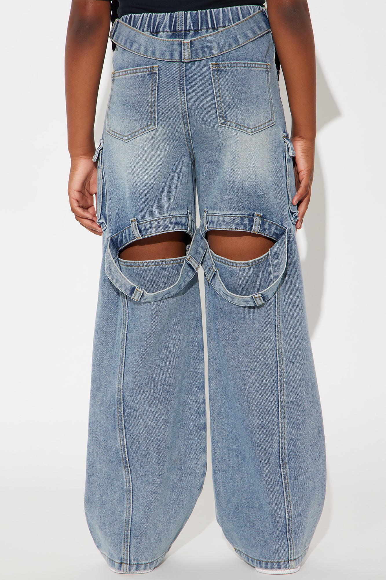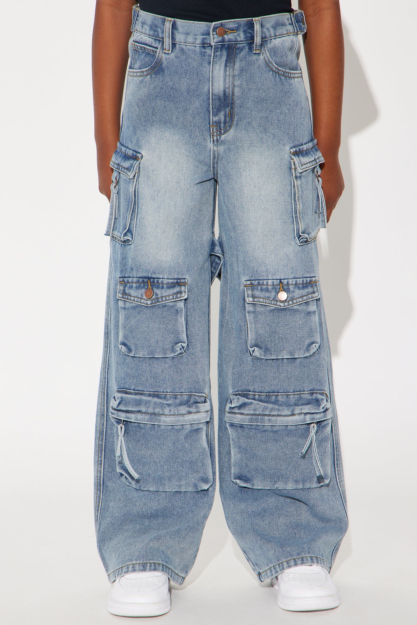 Available In Medium Wash. Cargo Jeans Wide Leg Multi Pocket Washed Foe Belt on Back 5 Pocket Detail Front Zipper And Button Closure 90% Cotton, 10% Polyester Model Wears Size 10/12 Mommy & Me Takedown Of "According To You Baggy Cargo Jeans" Imported |