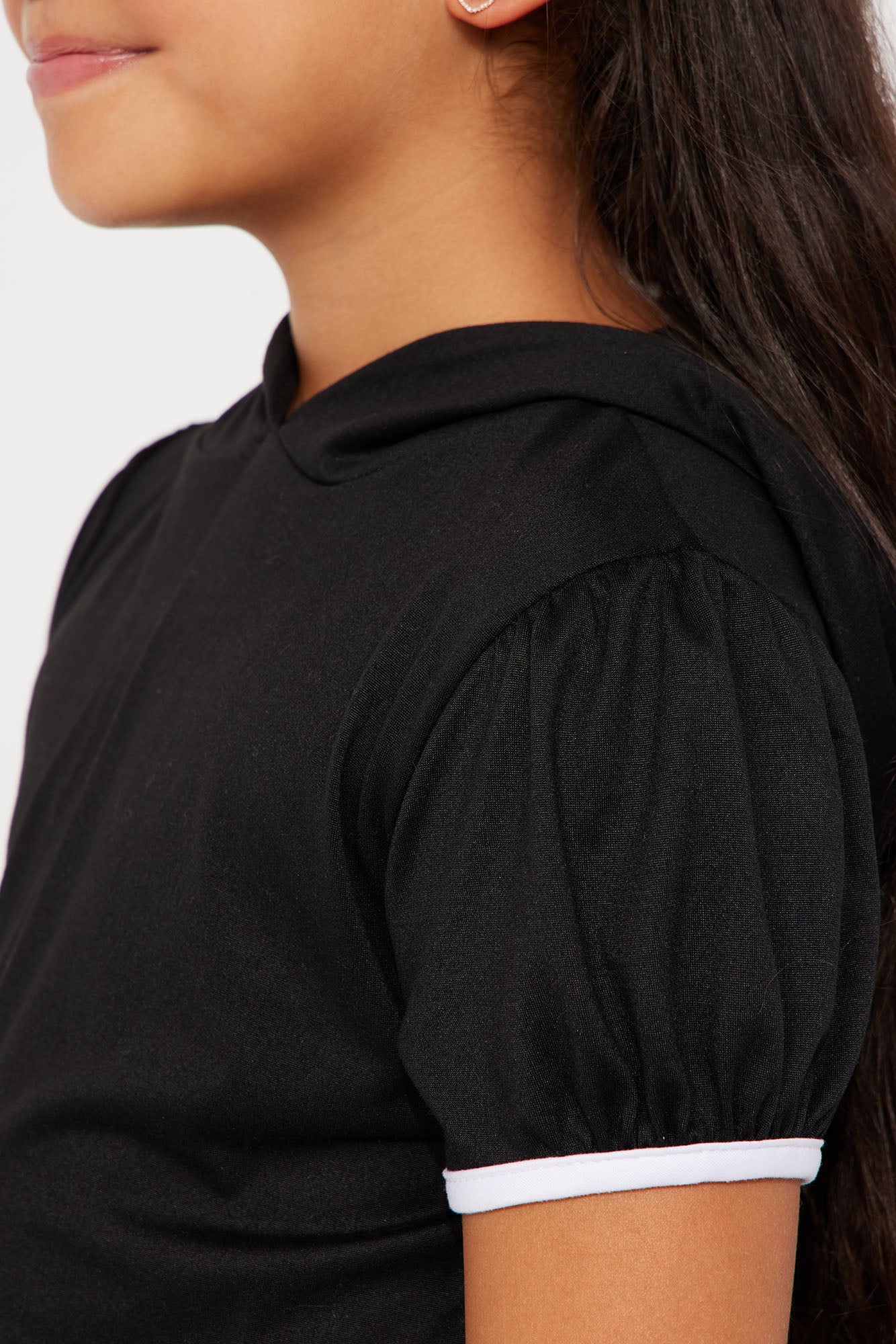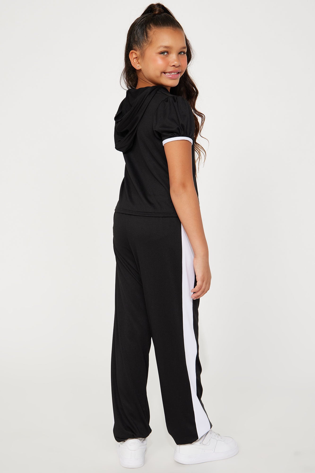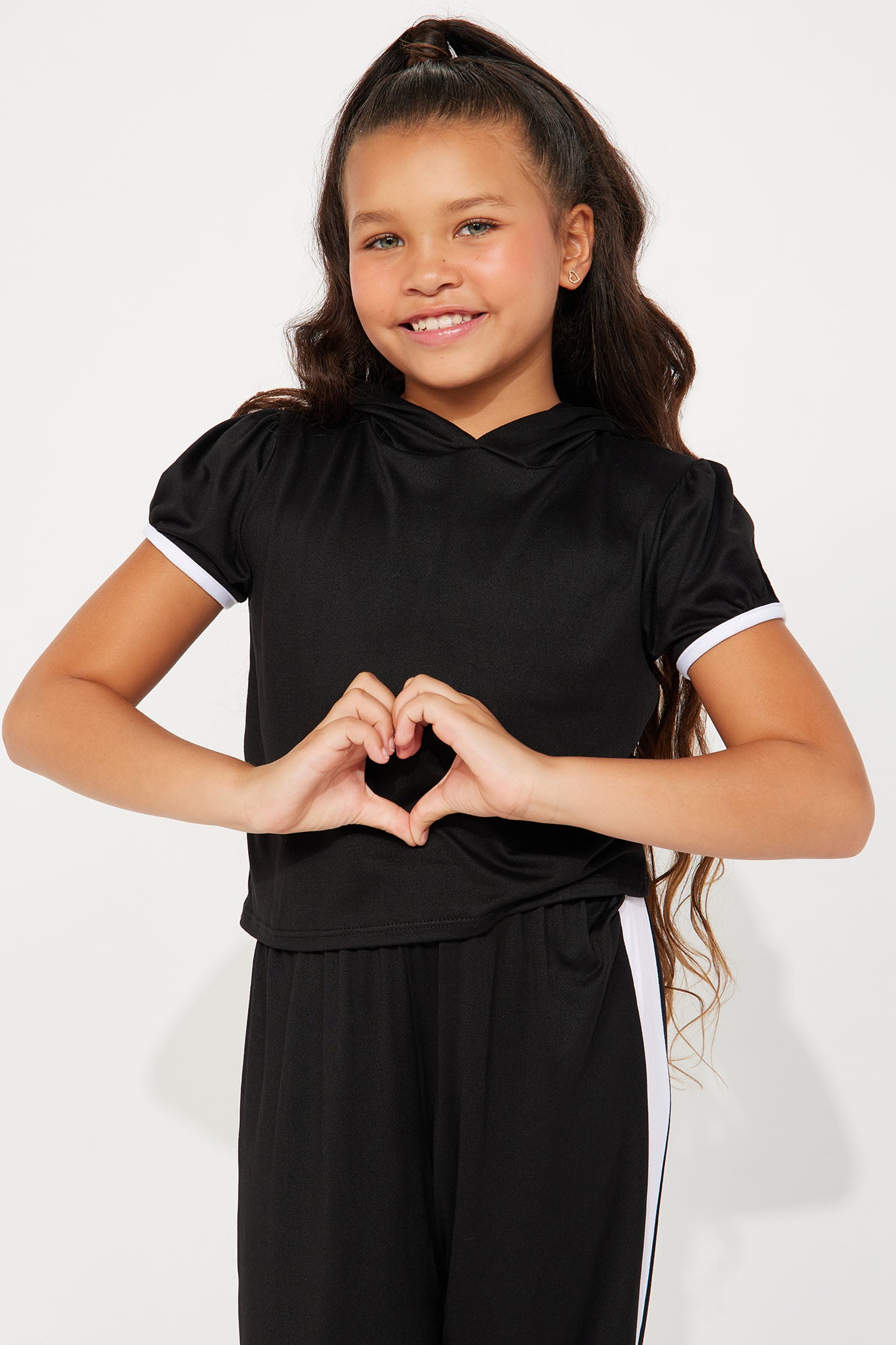 Available In Black. Matching Pant Set Short Sleeve Yummy Hooded Top Jogger Pant With Side Stripe 96% POLYESTER/ 4% SPANDEX Model Wears Size 10/12 Domestic |