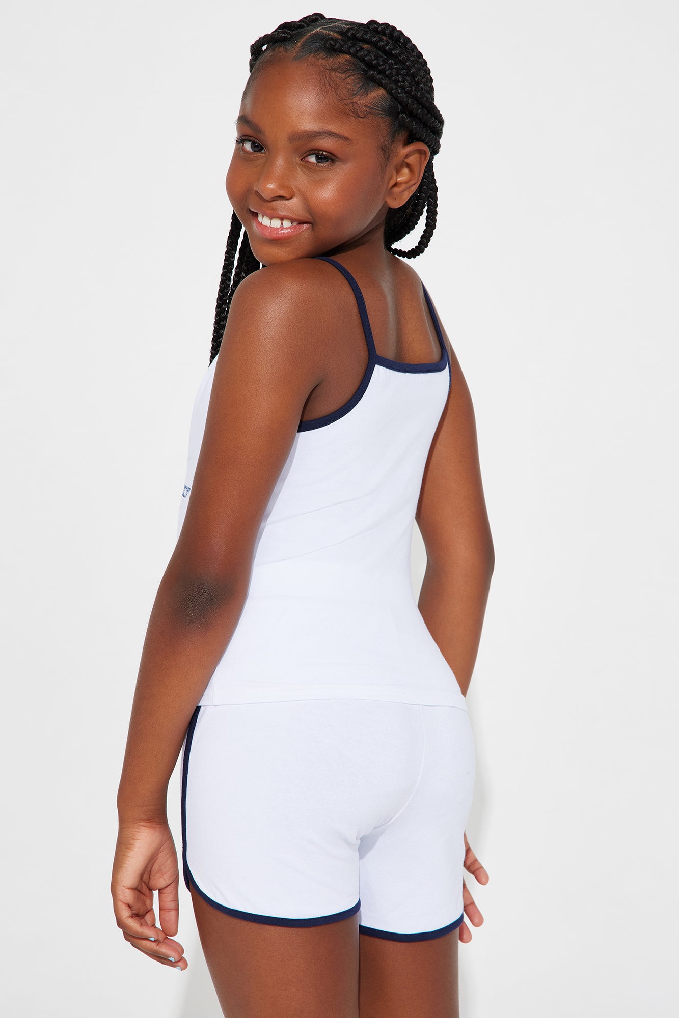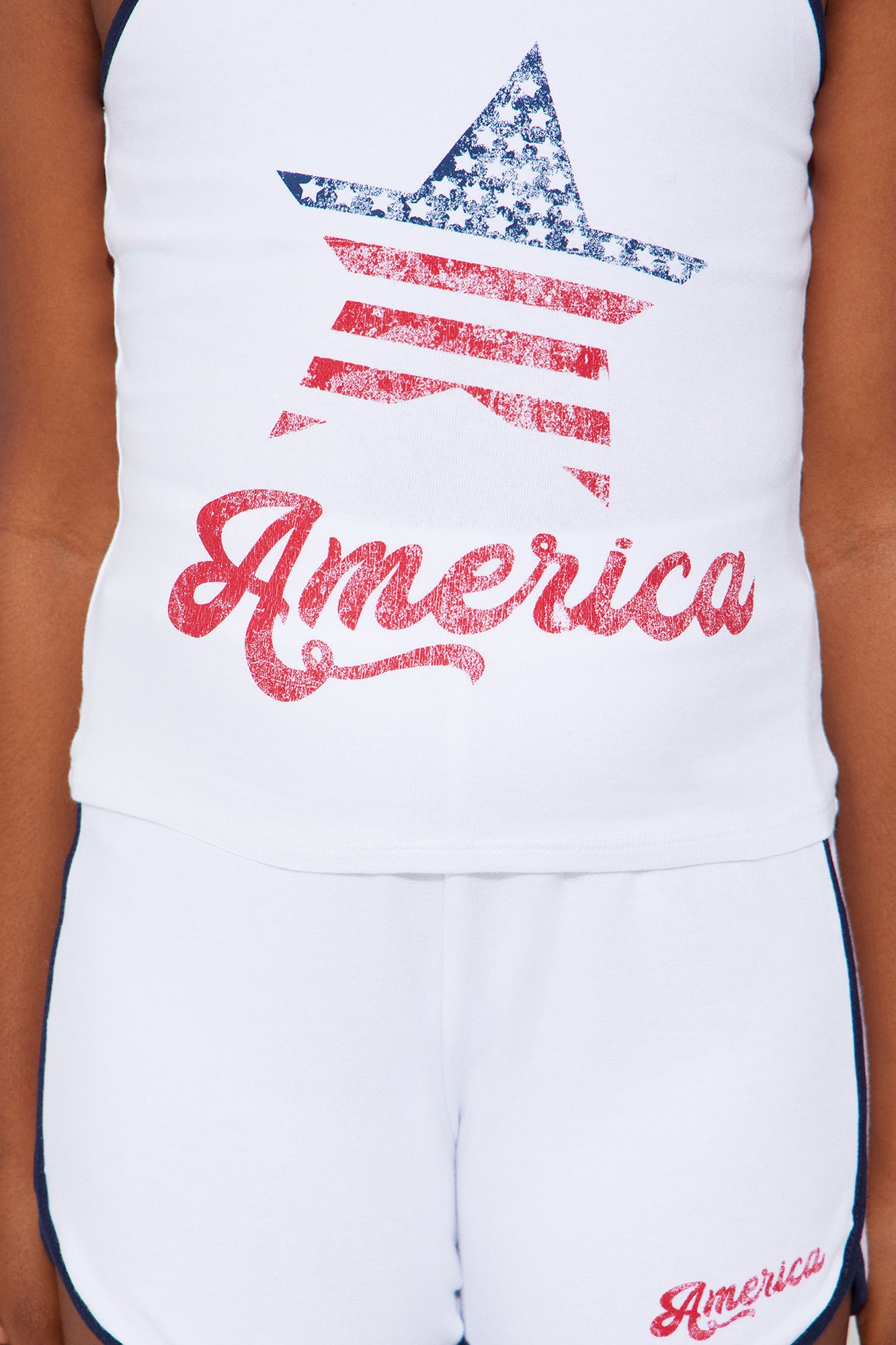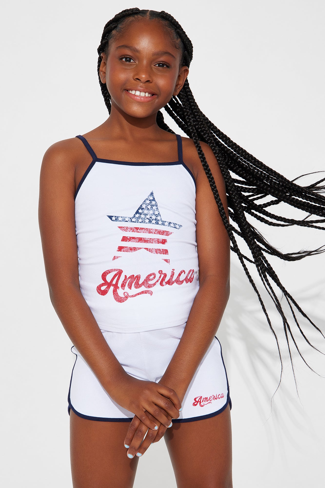 Available In White. Matching Short Set Screen Print Cami Top Short Shorts Contrast Trim Cotton & Spandex Model Wears Size 10/12 Mommy & Me Takedown of "America Rocks Short Set" 95% Cotton 5% Spandex Imported |