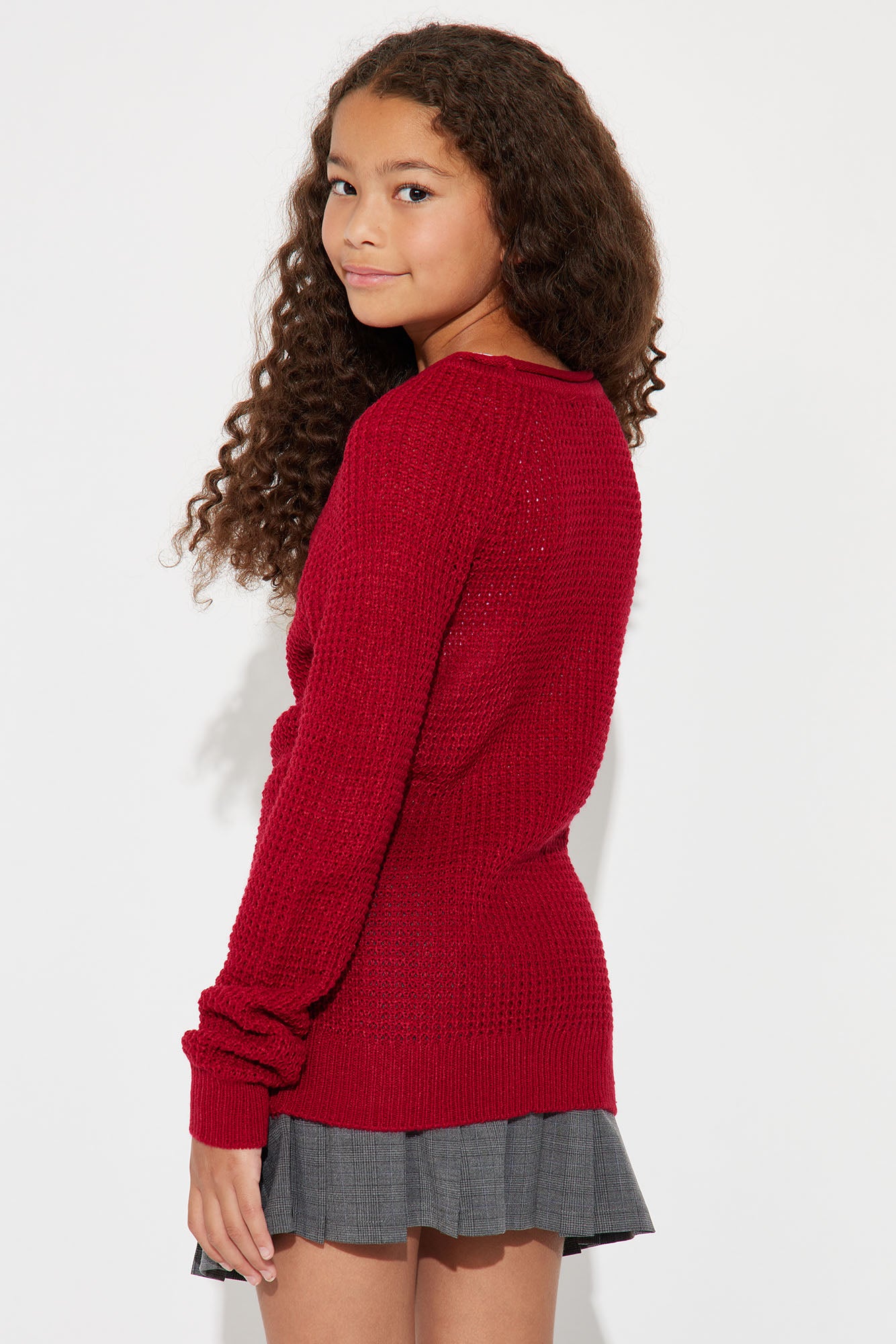 Available In Khaki And Red. Waffle Knit Sweater Long Sleeve Pull Over Sweater. Crew Neck Sleeve and Hem Ribbed Detail 100% Acrylic Model Wears Size 4/5 Mommy & Me Takedown Of "Ariana Waffle Sweater" Imported |