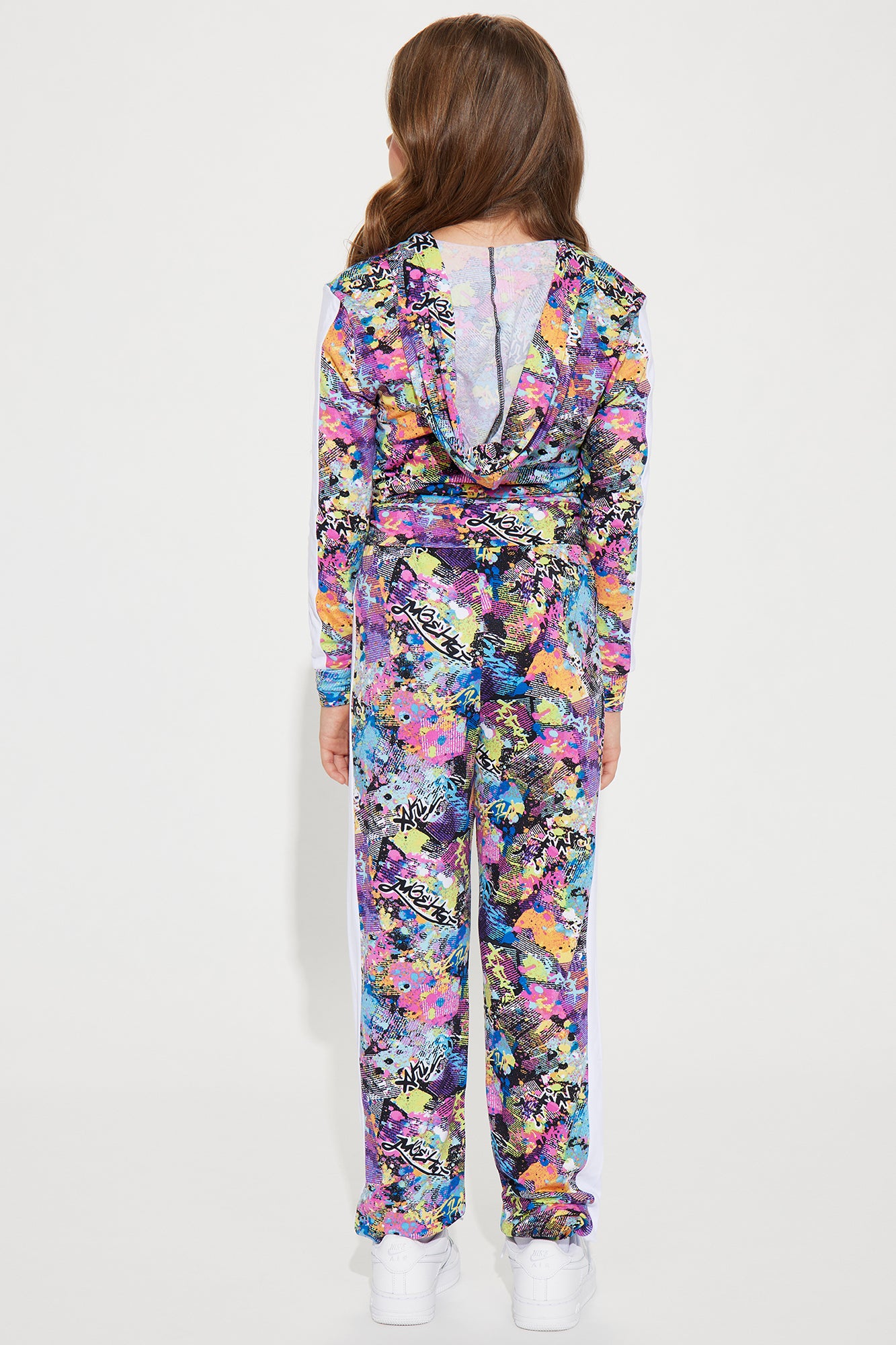 Available In Black/combo. Jogger Set Graffiti Print Hooded Cozy Knit Zip Up Tie Front Disclaimer: Print Placement Will Vary. 95% Polyester 5% Spandex Imported |