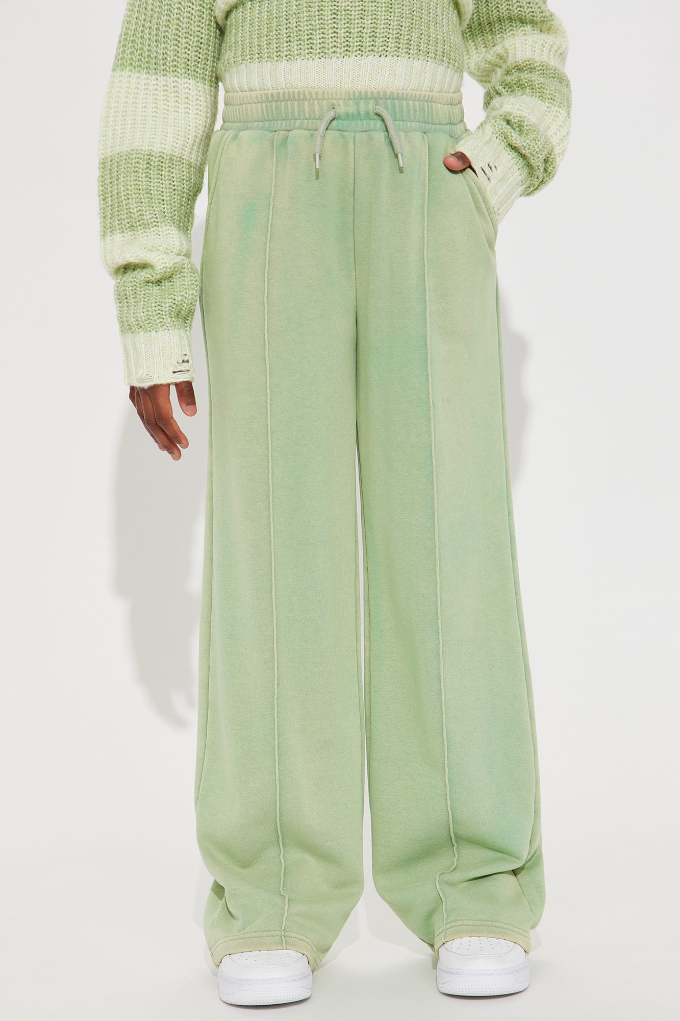 Available In Sage. Lounge Pant Wide Leg Washed 60% Cotton, 40% Polyester Foe Drawstring on Jogger Model Wears Size 10/12 Mommy & Me Takedown Of "Pay No Attention Lounge Pant" Imported |